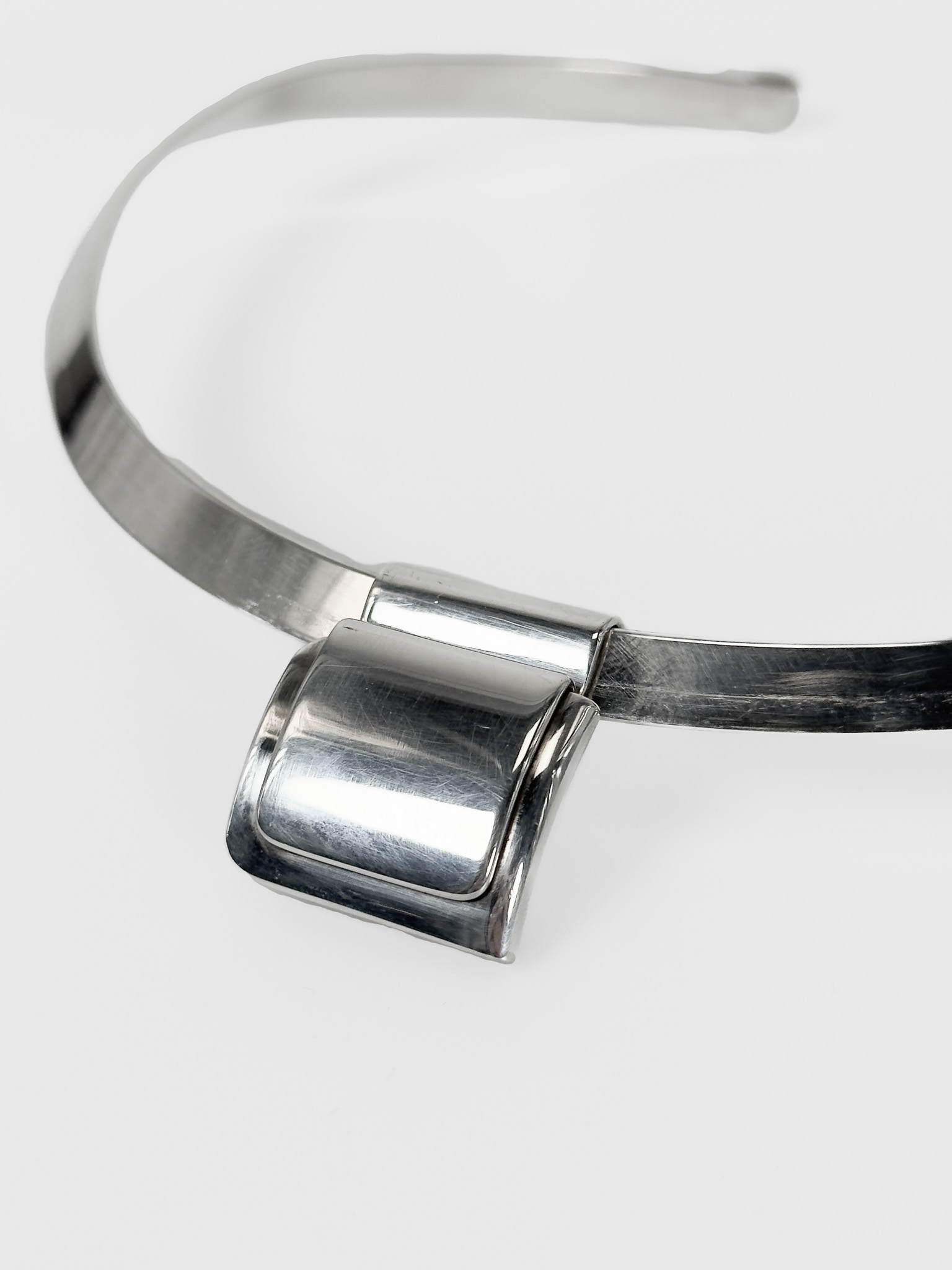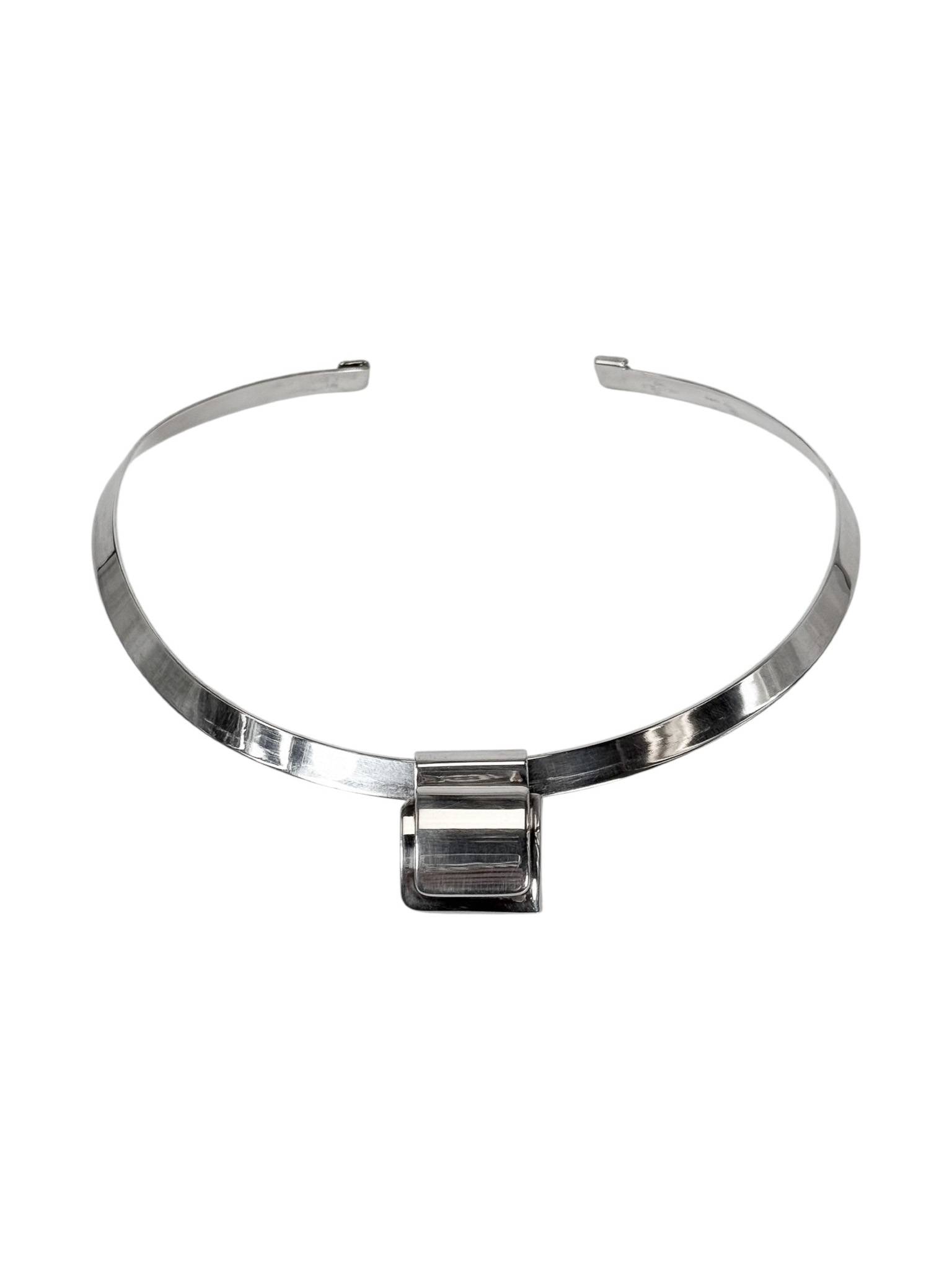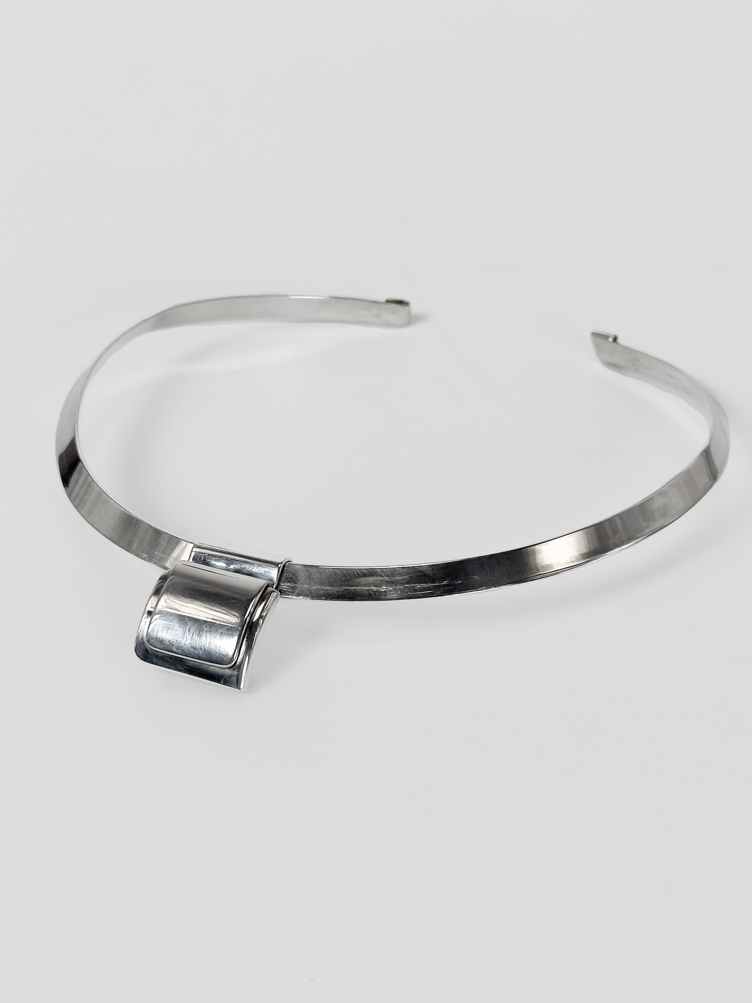 "Srebrny naszyjnik, owalny kształt z zawieszką. Pudełko w komplecie. Stan bardzo dobry, posiada drobne zarysowania."