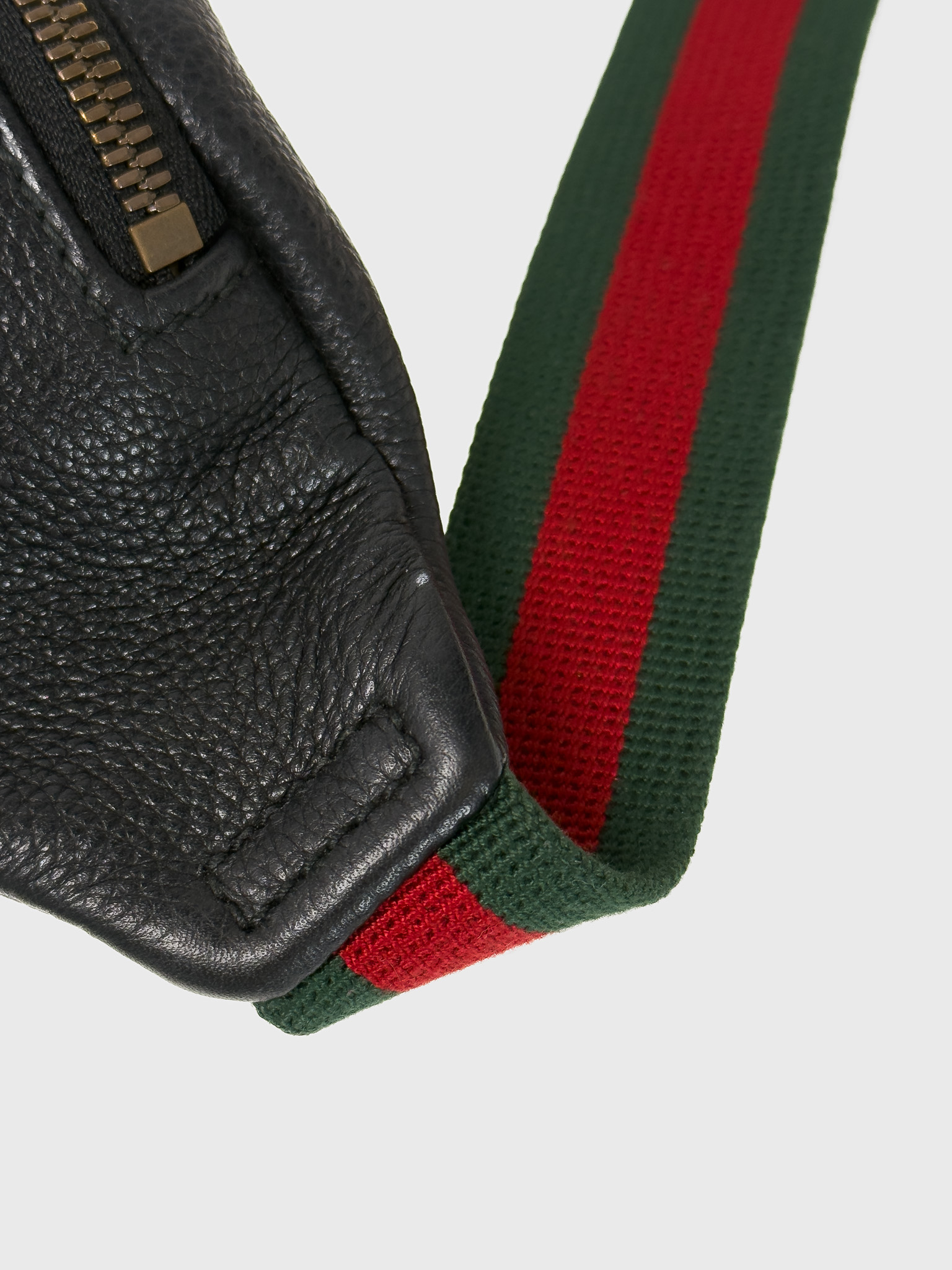 "Czarna skórzana nerka, groszkowa skóra, logo marki w centralnej części, zielono-czerwony materiałowy regulowany pasek wykończony plastikową klamrą, zapinana na złoty logowany suwak, beżowe materiałowe wnętrze. Stan bardzo dobry. Wymiary: szerokość 35cm, wysokość 19cm."