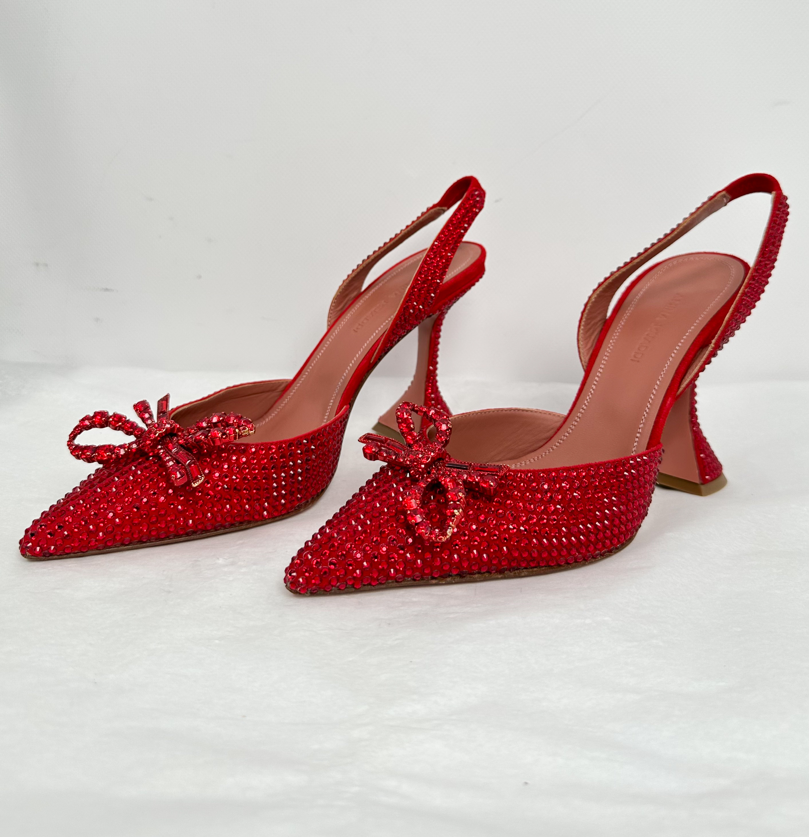 "Czerwone zamszowe obcasy wysadzane błyszczącymi kryształkami, ozdoba w kształcie kokardy na przodzie, kielichowy obcas, nosek w szpic, odkryta pięta, pasek nad piętą, skórzana wkładka. Stan bardzo dobry. Rozmiar 37."