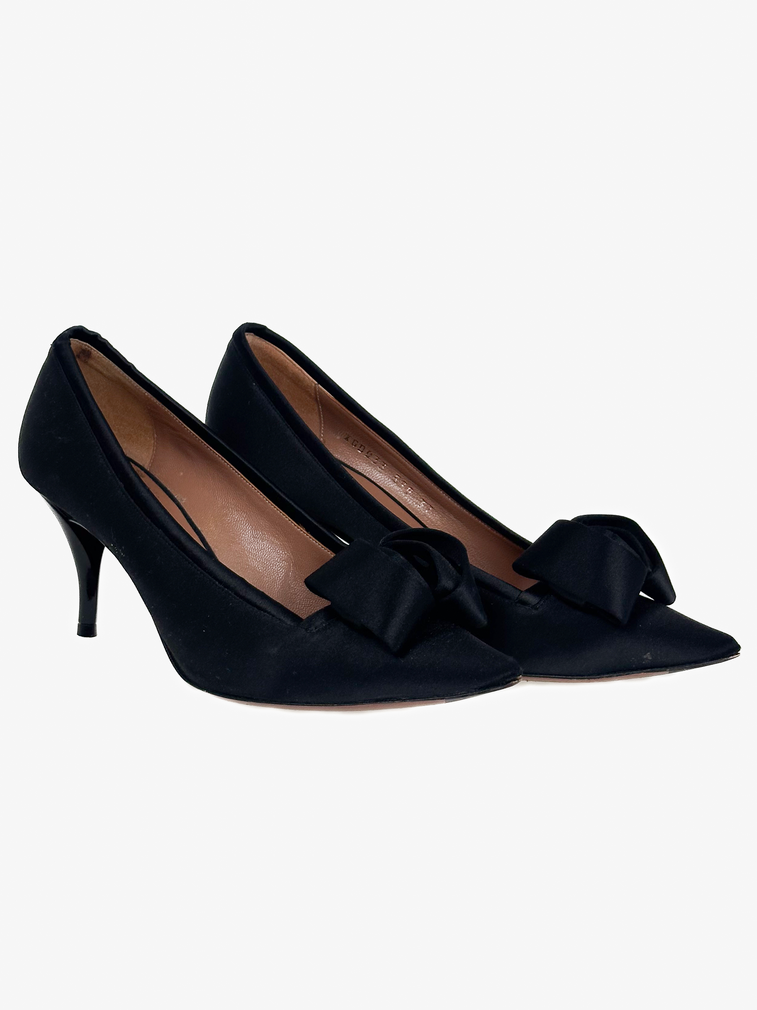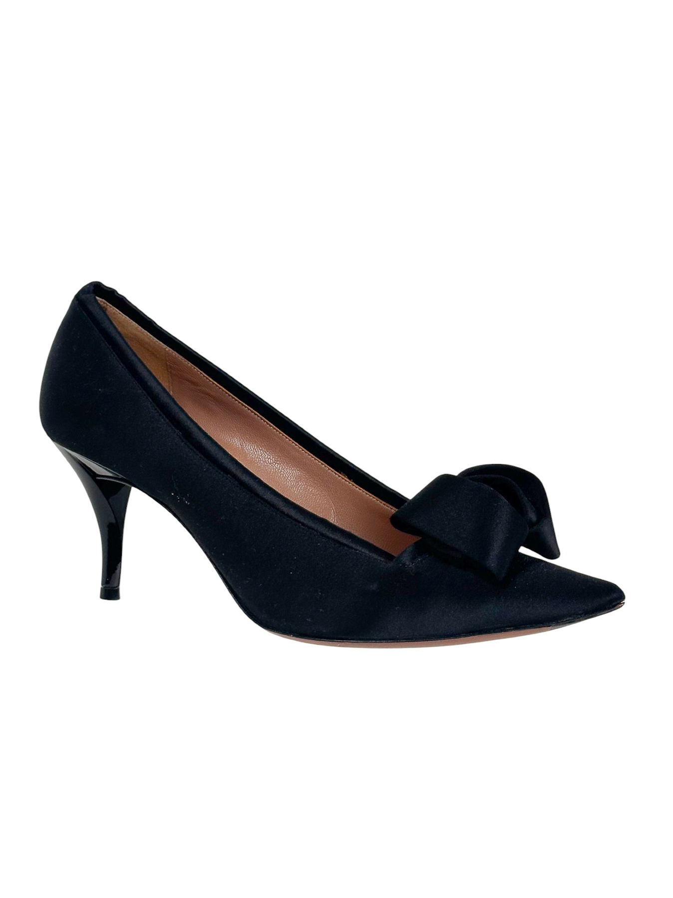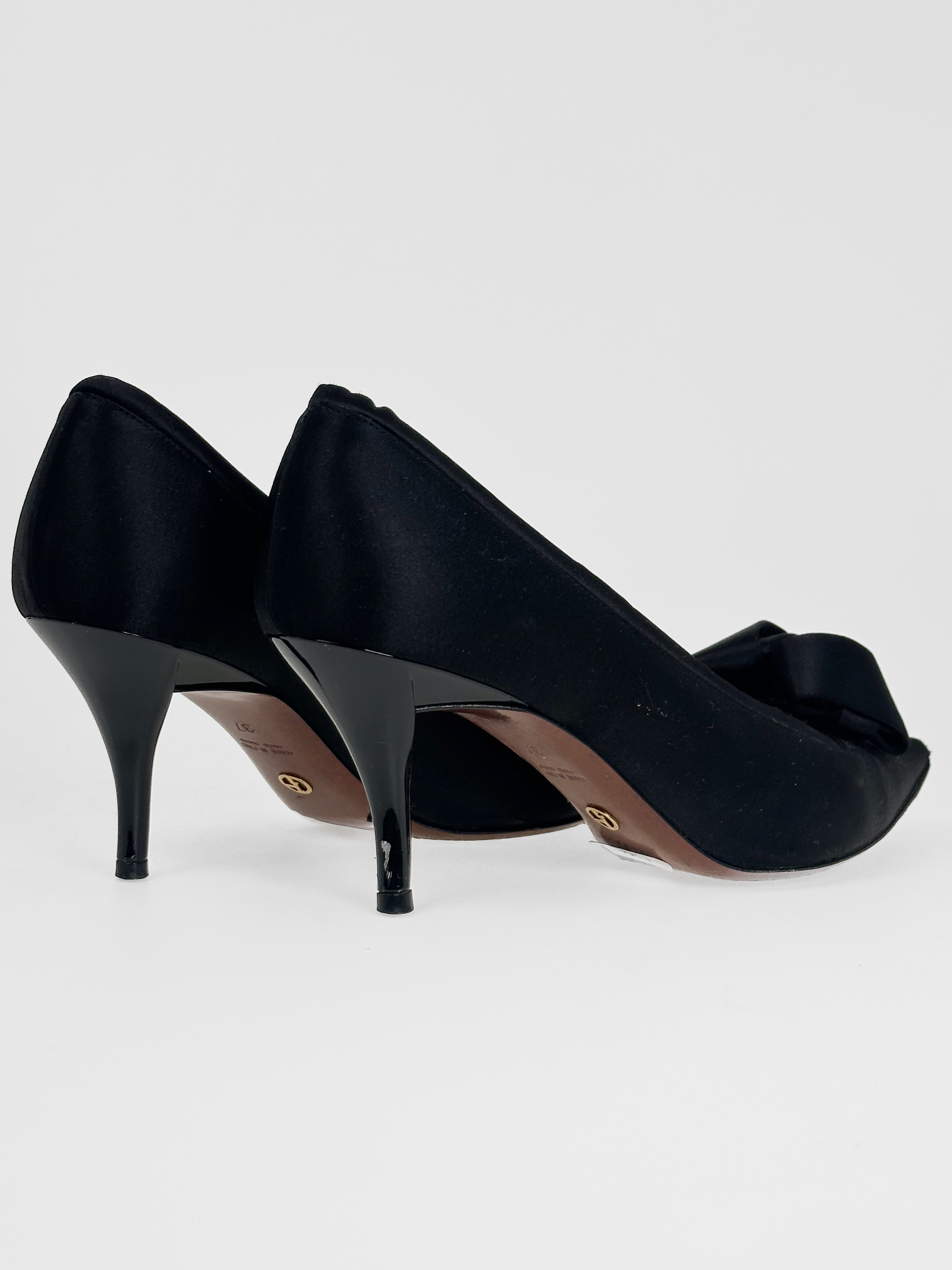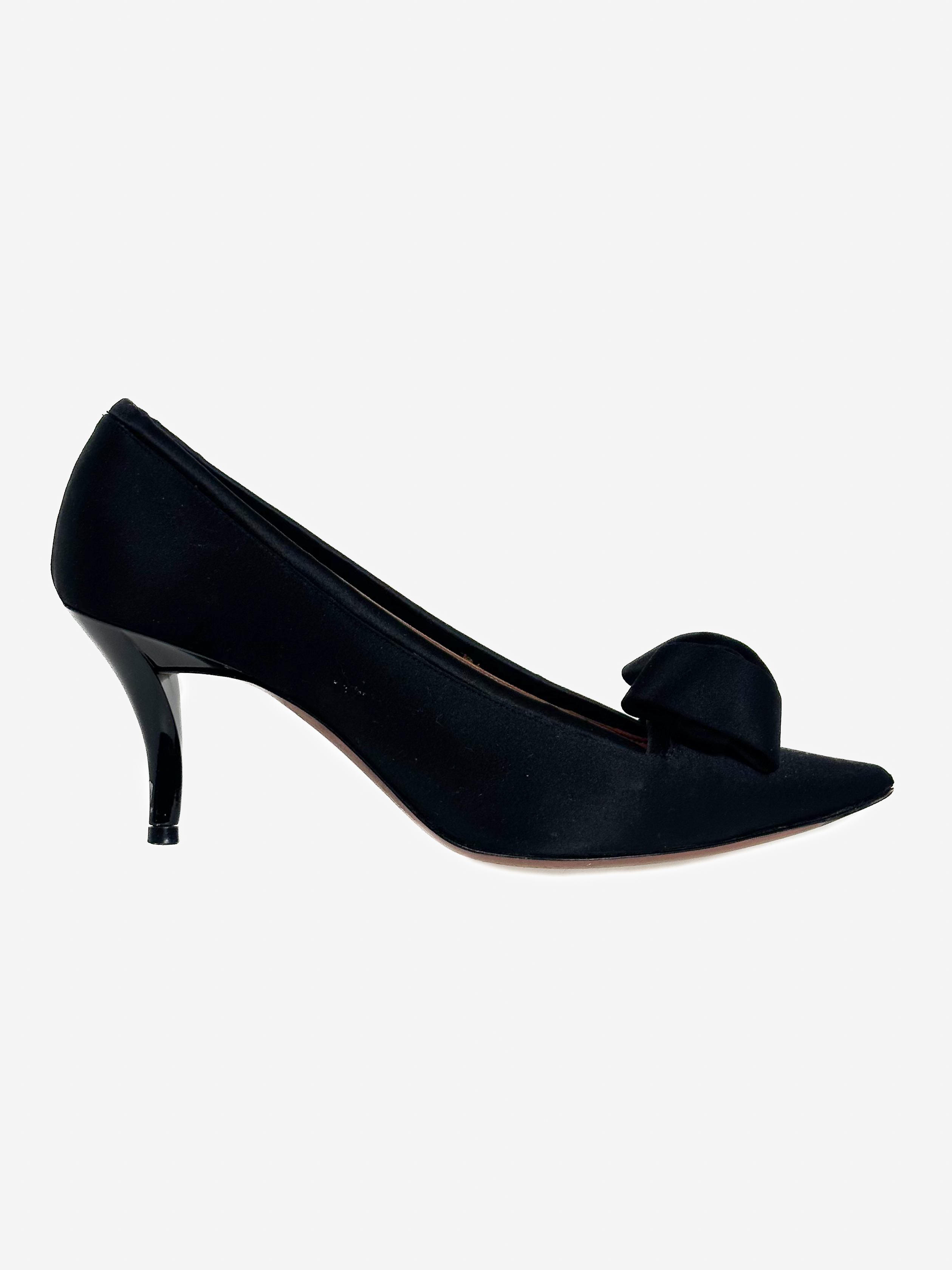 "Czarne satynowe szpilki z kokardą na czubku, rozmiar 37, w zestawie z pudełkiem, używane."