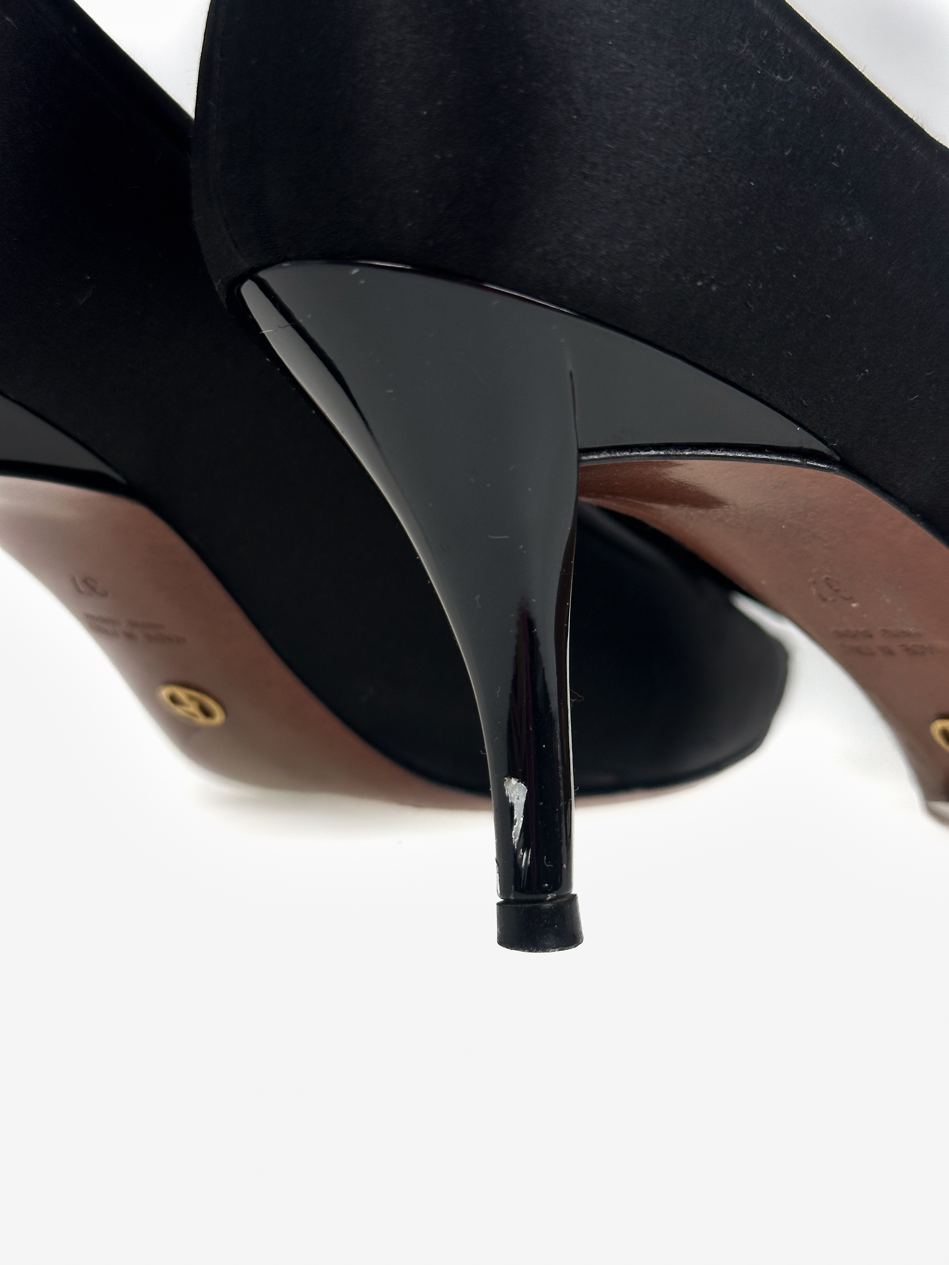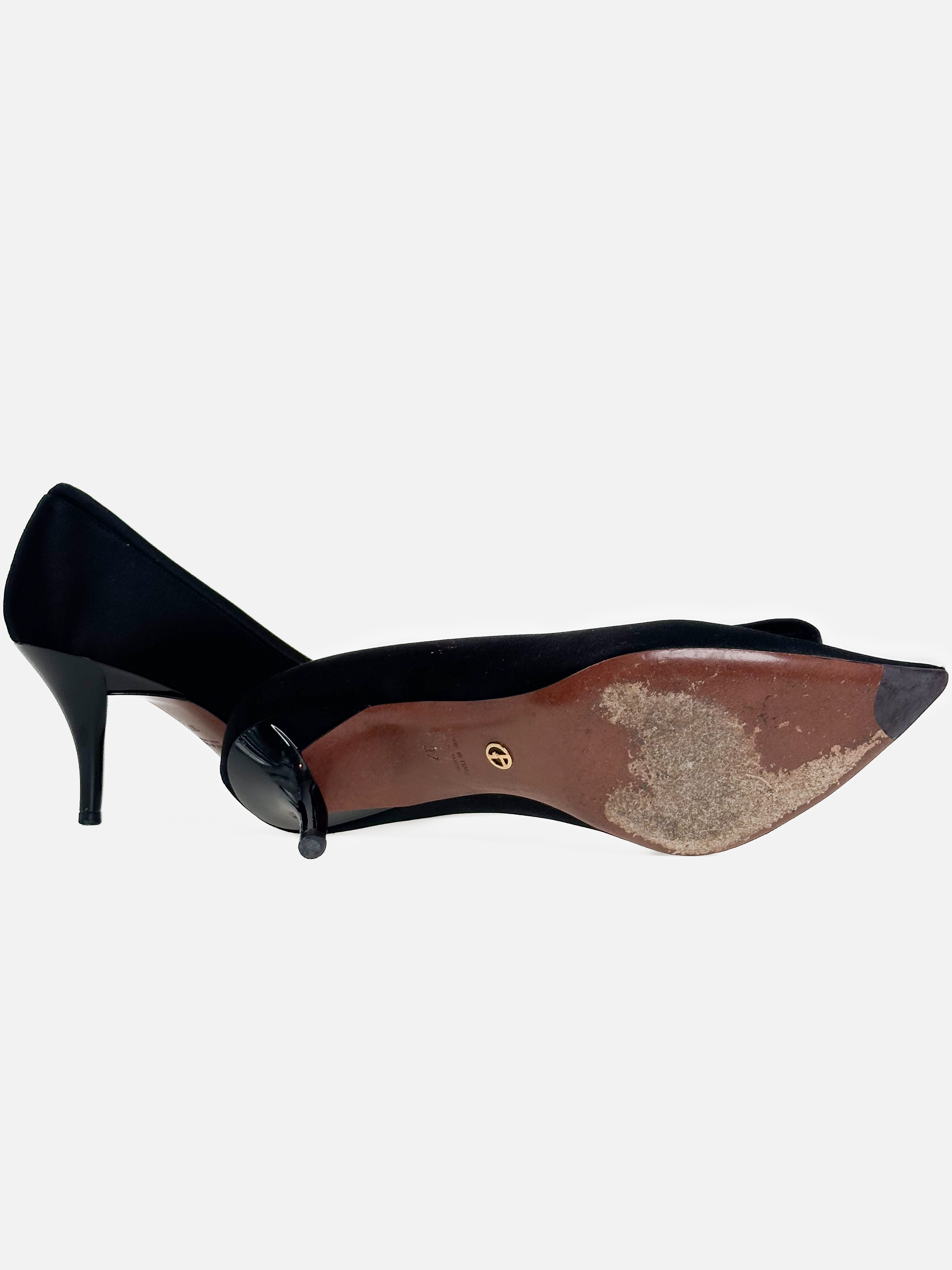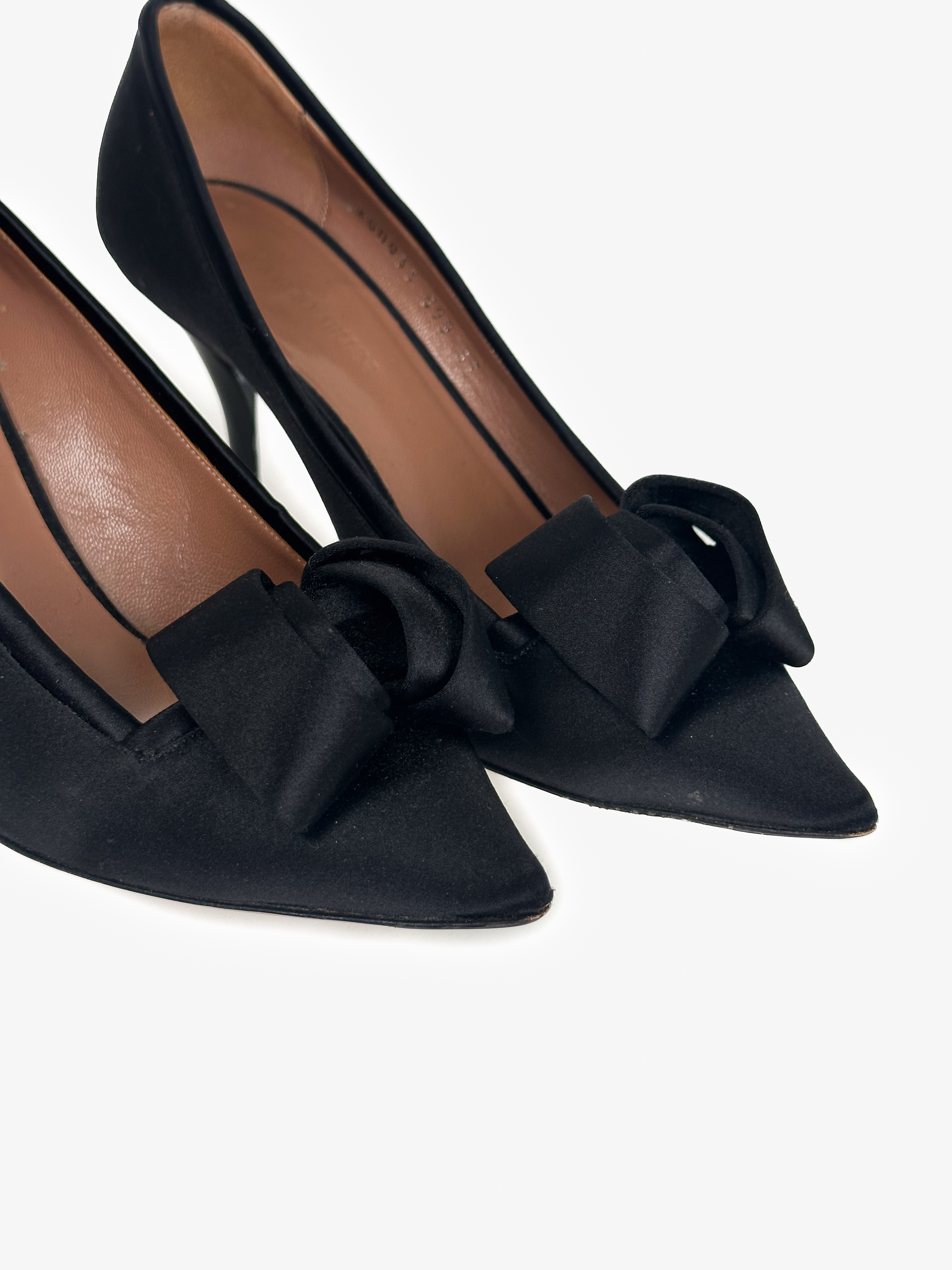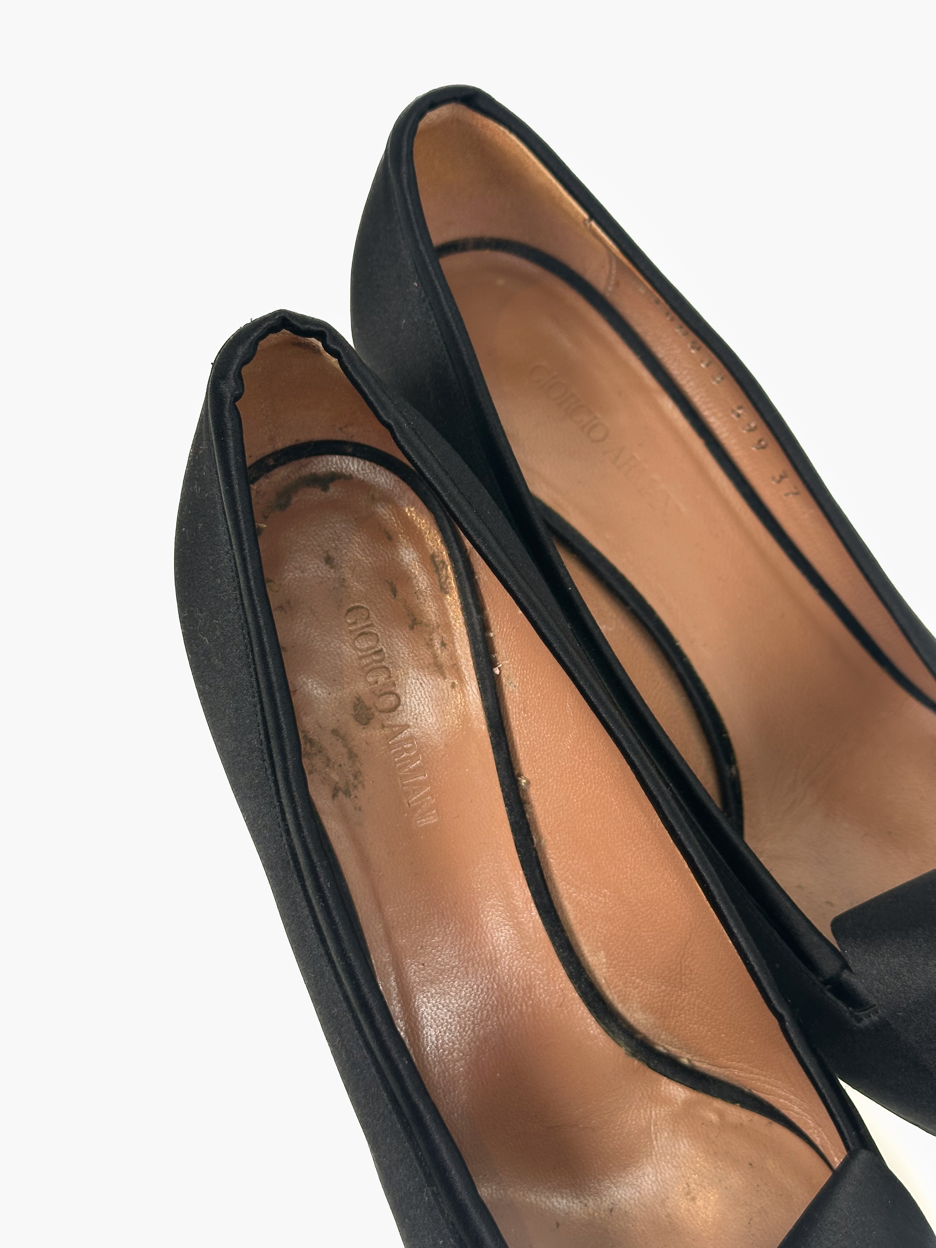 "Czarne satynowe szpilki z kokardą na czubku, rozmiar 37, w zestawie z pudełkiem, używane."