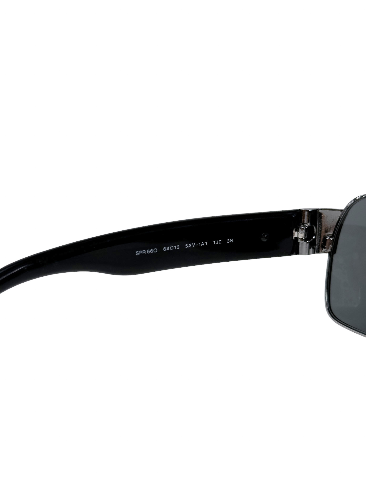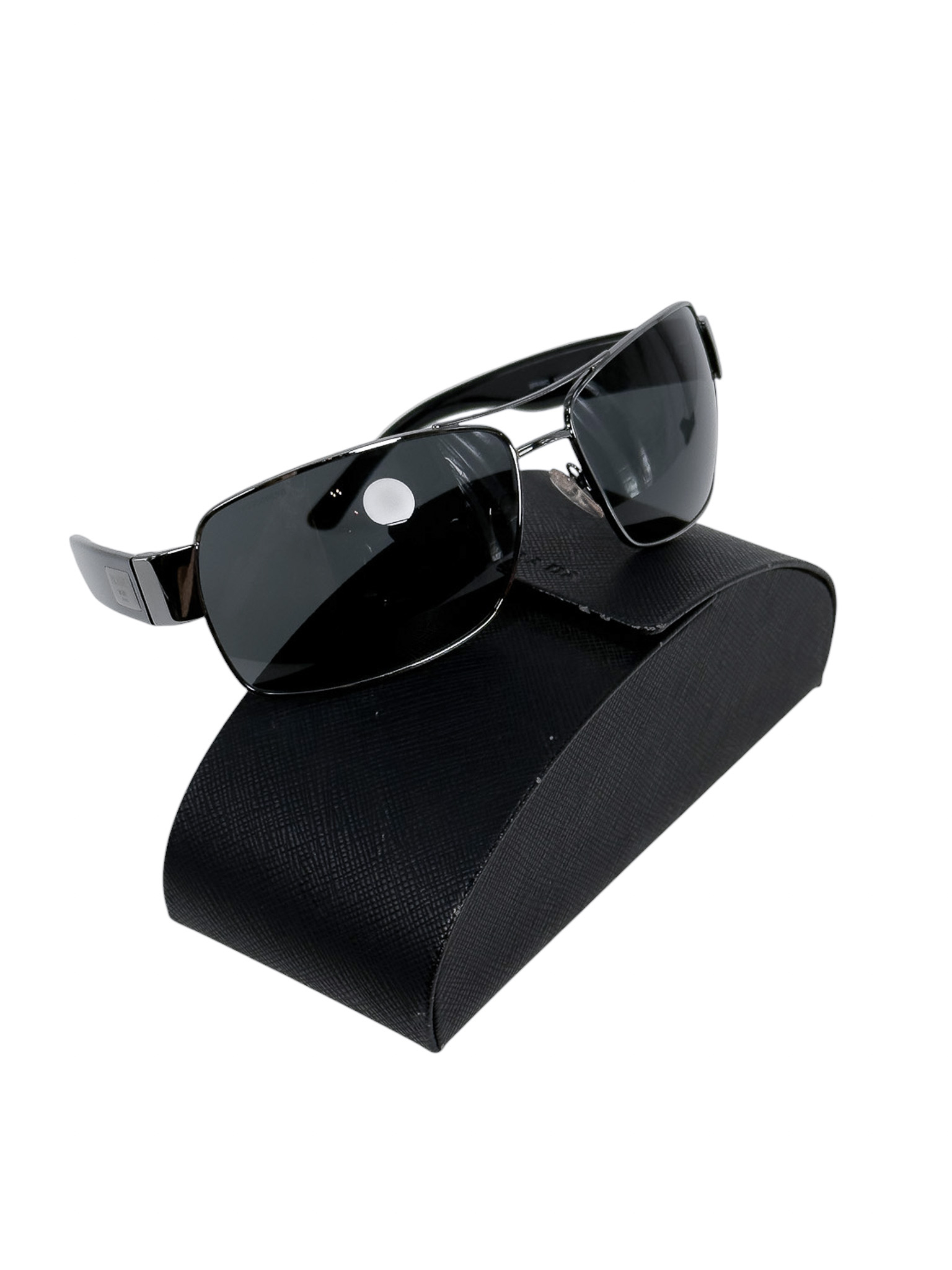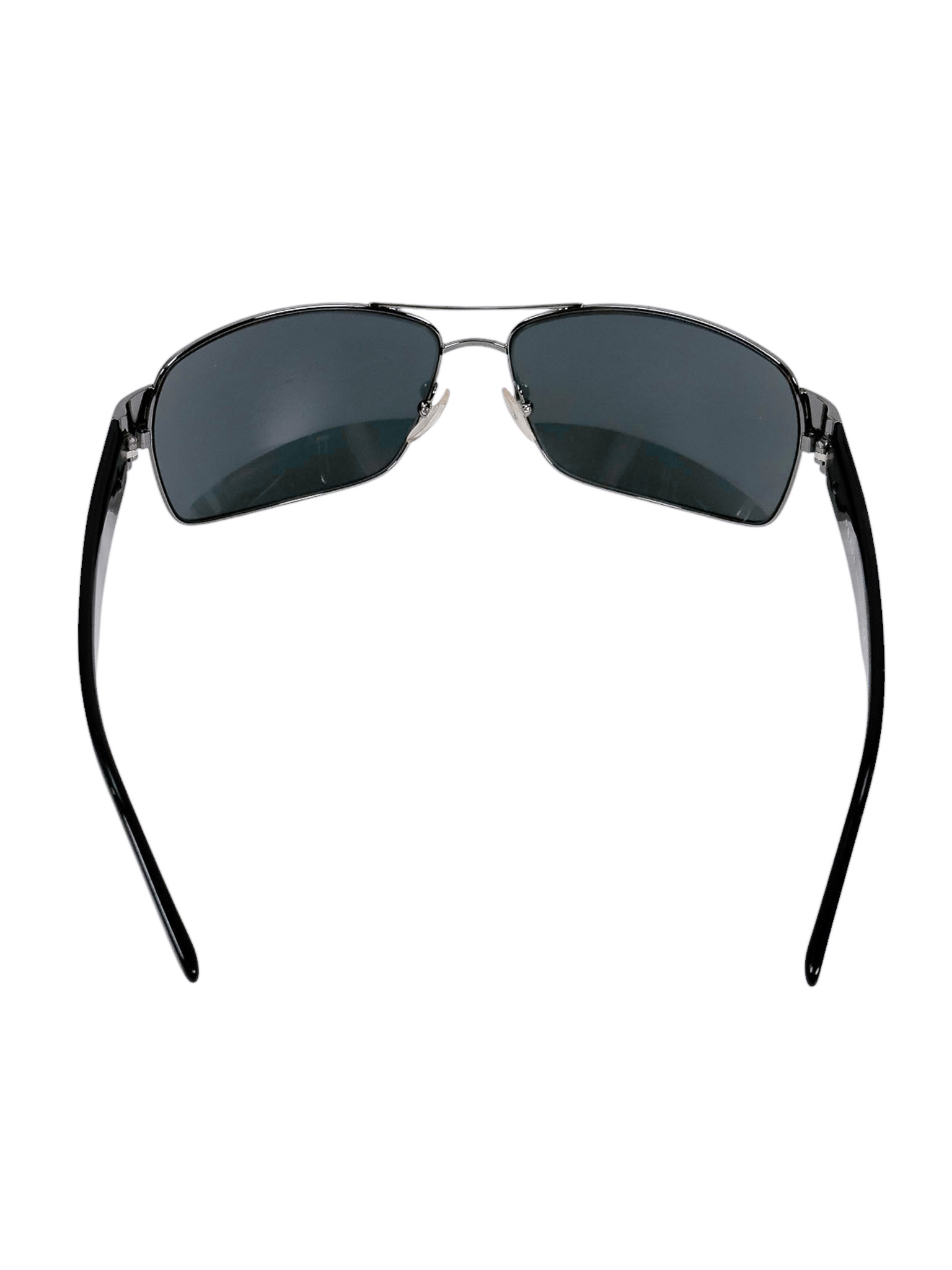 "Ciemnoszare męskie okulary przeciwsłoneczne, podłużny kształt, szkła z poświatą granatowego koloru, chromowane elementy przy oprawkach, logo na zausznikach. Etui w zestawie. Stan dobry, posiadają rysy na szkłach oraz zausznikach."