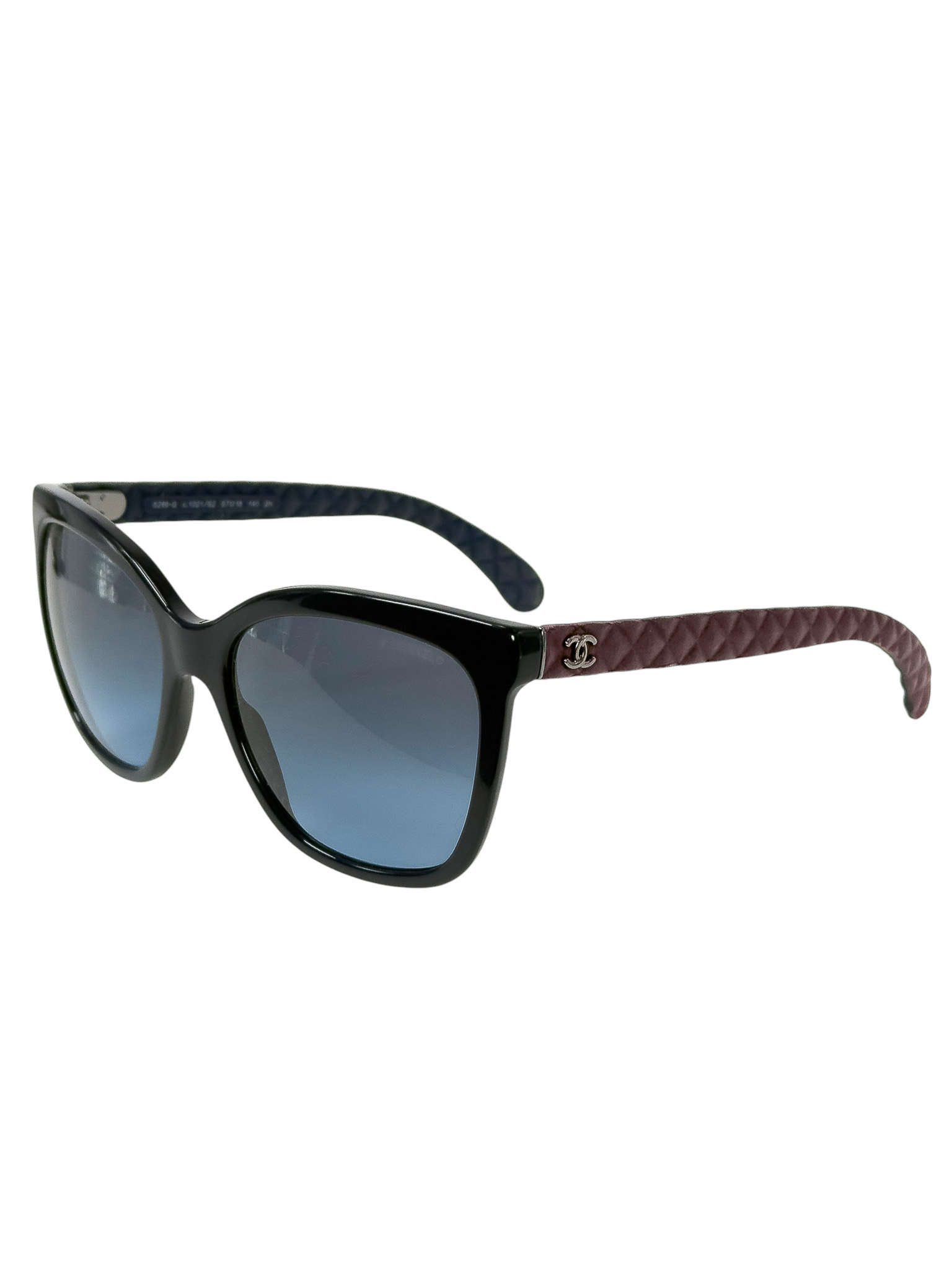 "Granatowe okulary przeciwsłoneczne, lekko kwadratowe szkła, ciemne granatowe, cieniowane szkła, brązowe - pikowane oprawki, srebrne delikatne logowanie na oprawkach. Etui w komplecie. Stan bardzo dobry."