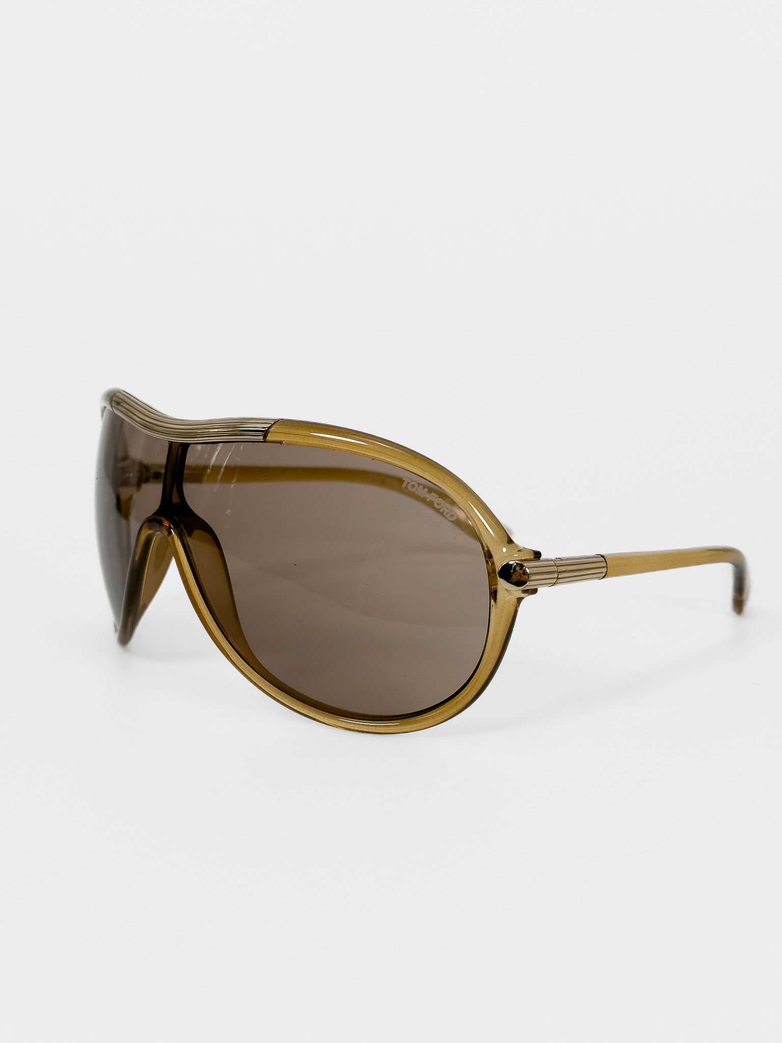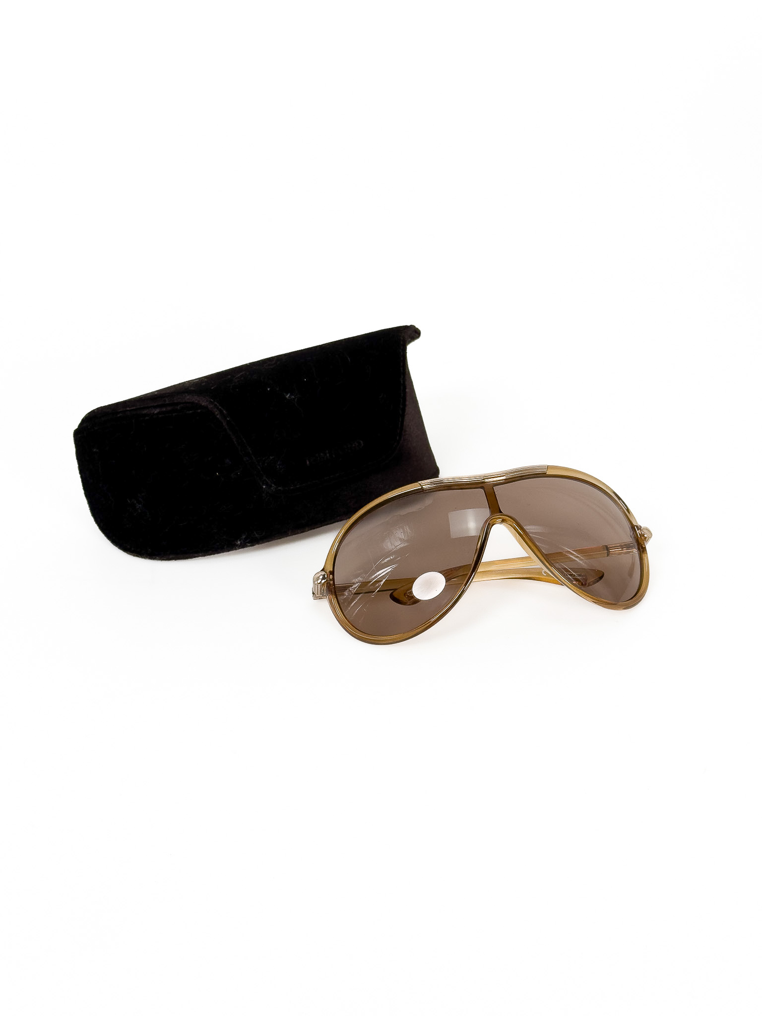 "Ciemnożółte plastikowe okulary przeciwsłoneczne, duże brązowe szkła, złote wstawki, zauszniki wykończone logo marki, w zestawie z etui oraz ściereczką. Stan bardzo dobry, delikatnie przekrzywione."