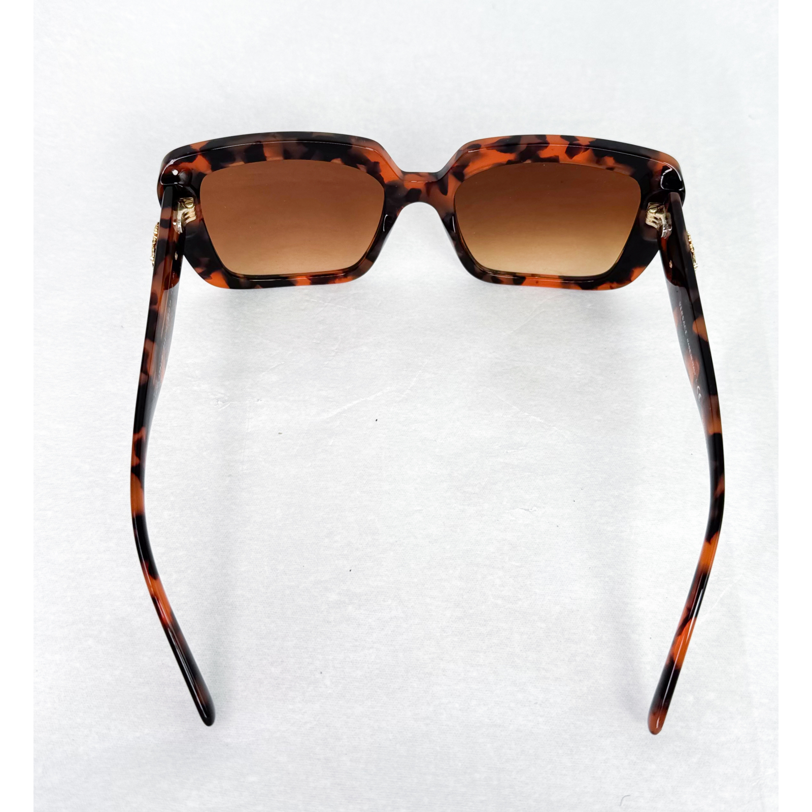 "Szylkretowe plastikowe okulary przeciwsłoneczne, duże kwadratowe cieniowane szkła, okrągła ozdoba z grafiką o charakterystycznym dla marki kształcie z błyszczącymi kryształkami w kolorze bursztynowym na zausznikach, w zestawie z etui, pudełkiem, workiem przeciwkurzowym, używane. Stan bardzo dobry, delikatne rysy na oprawkach."