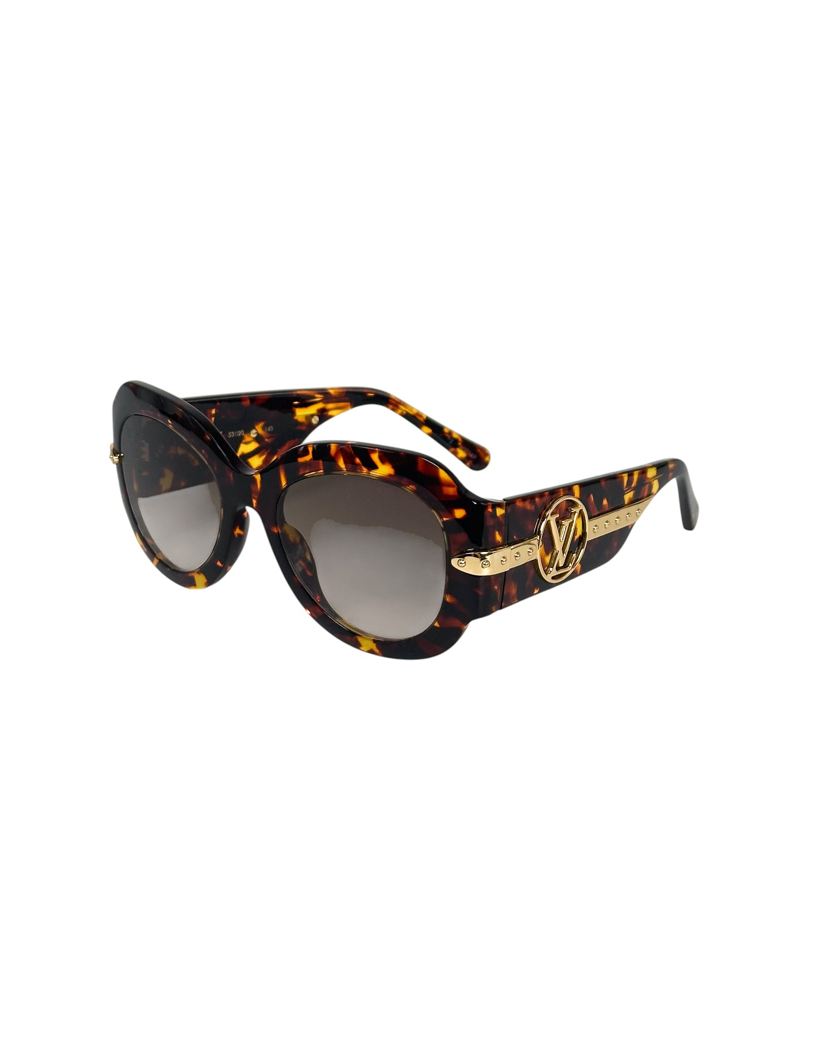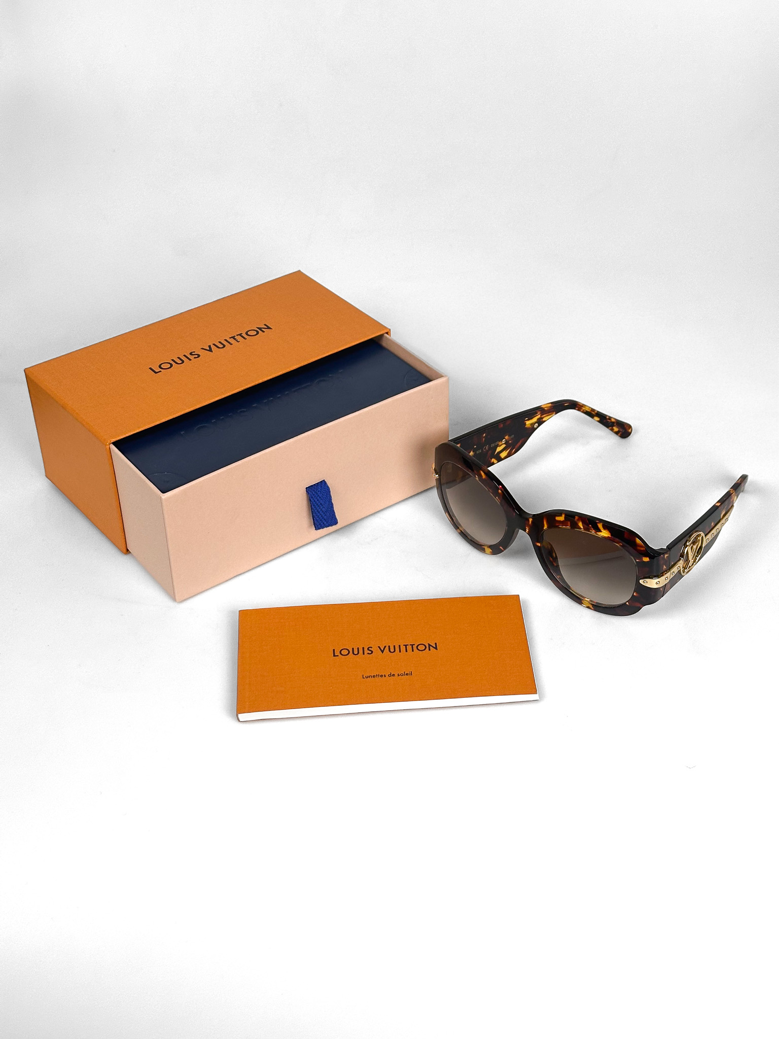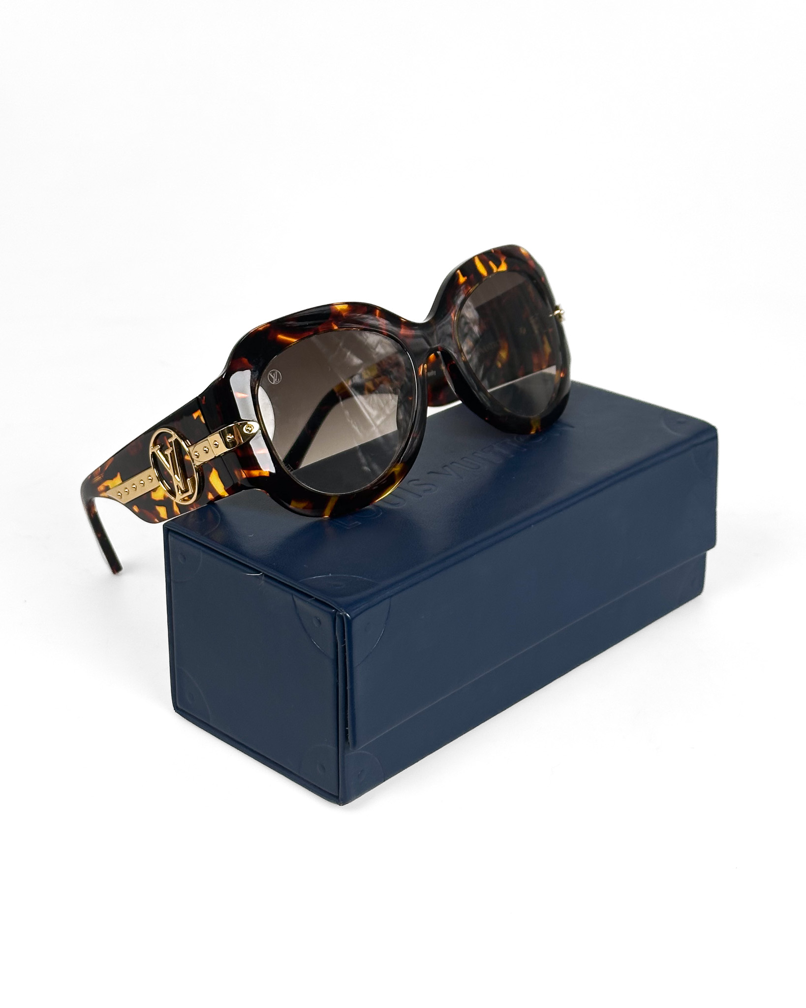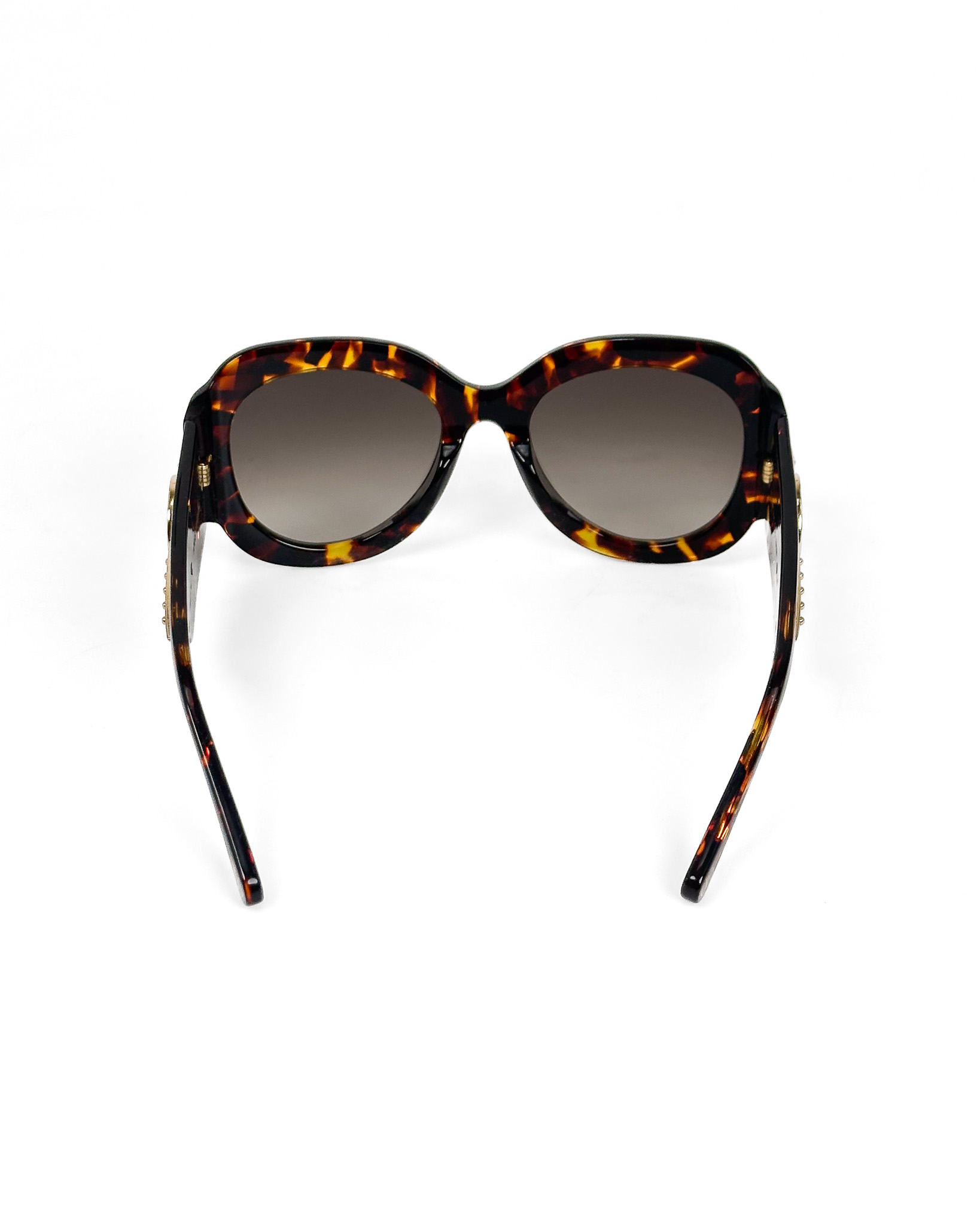 "Brązowe szylkretowe okulary przeciwsłoneczne, złote logo na zausznicach. W komplecie w pudełkiem papierowym oraz granatowym skórzanym oraz torbą papierową"