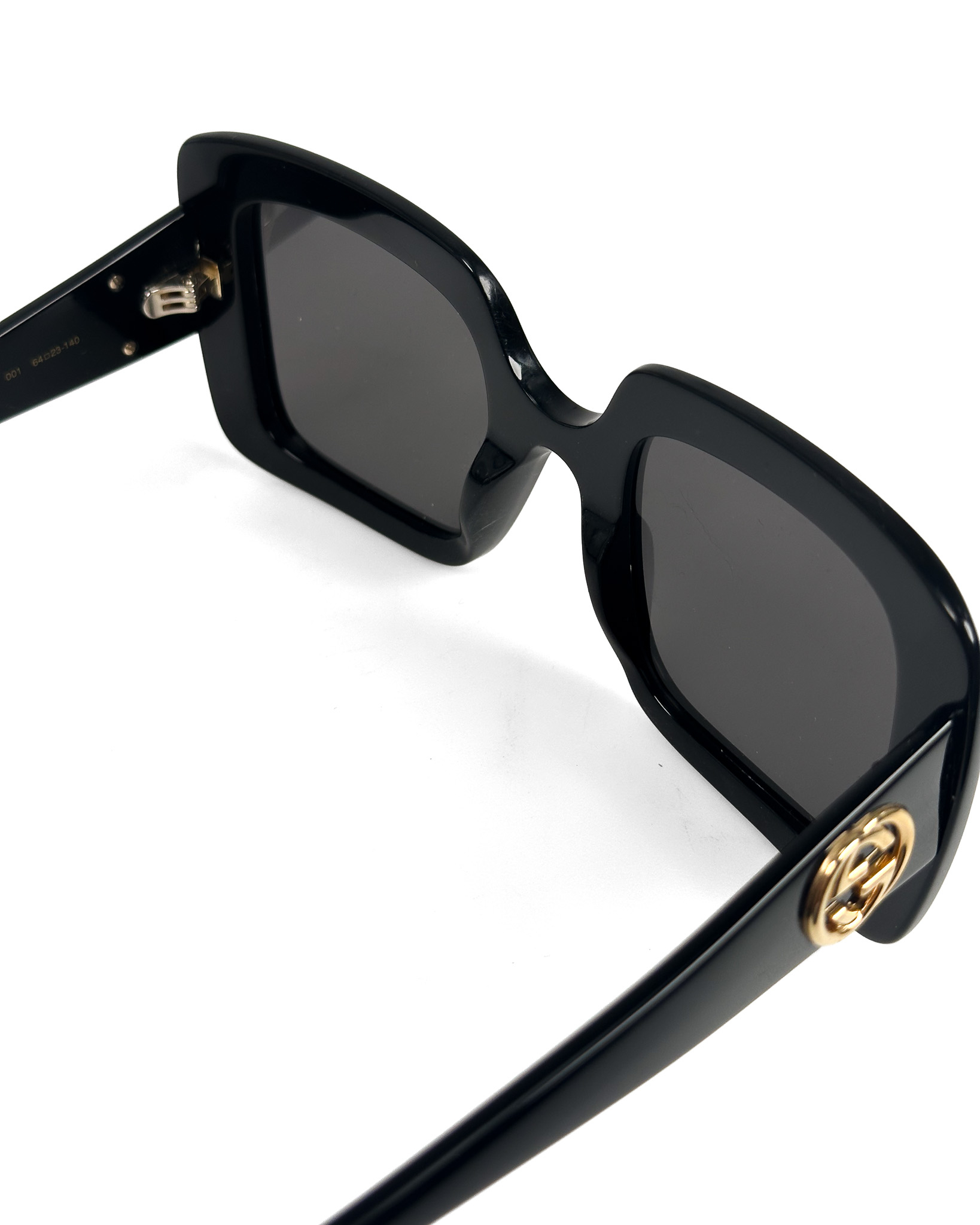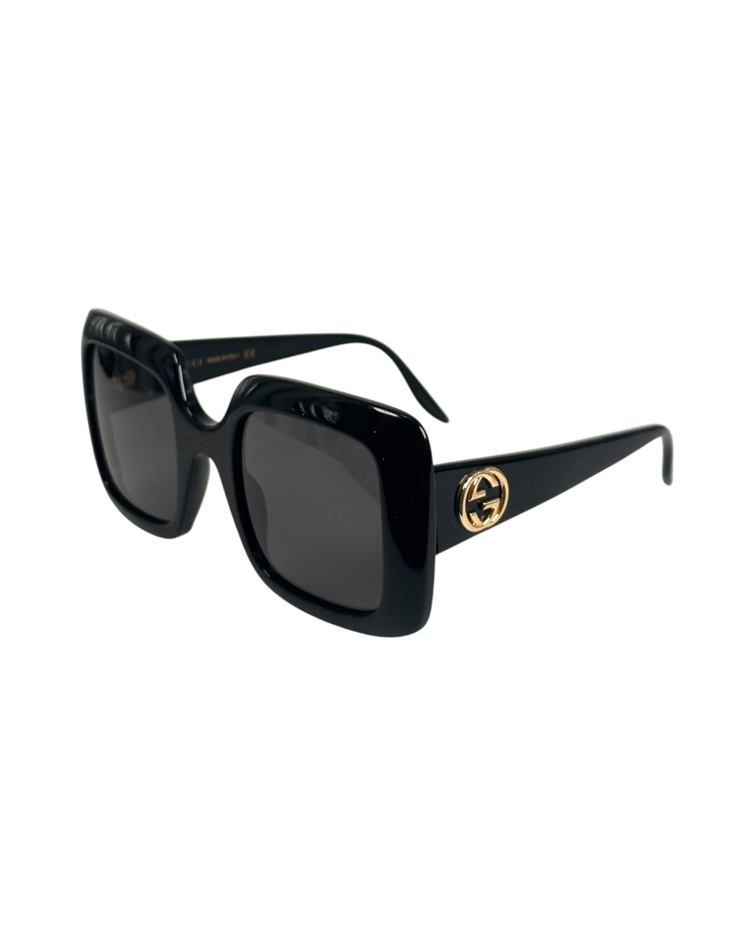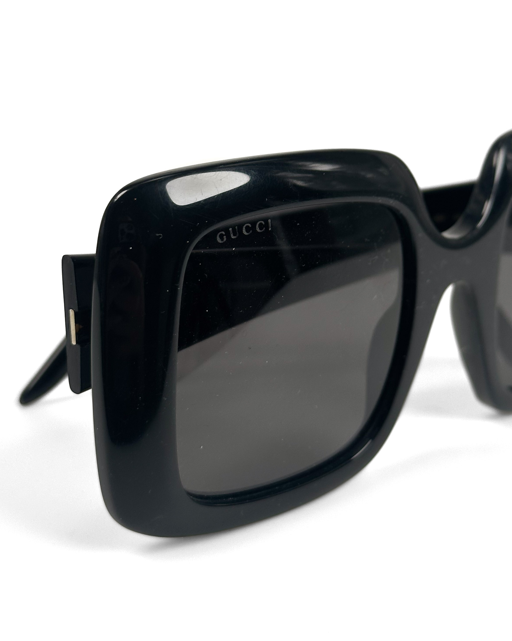 "Czarne kwadratowe okulary w grubszych oprawkach, duże złote logo marki na zausznikach. Posiadają rysy na oprawkach oraz drobne rysy na szkłach. W zestawie z pudelkiem i woreczkiem do przechowywania."