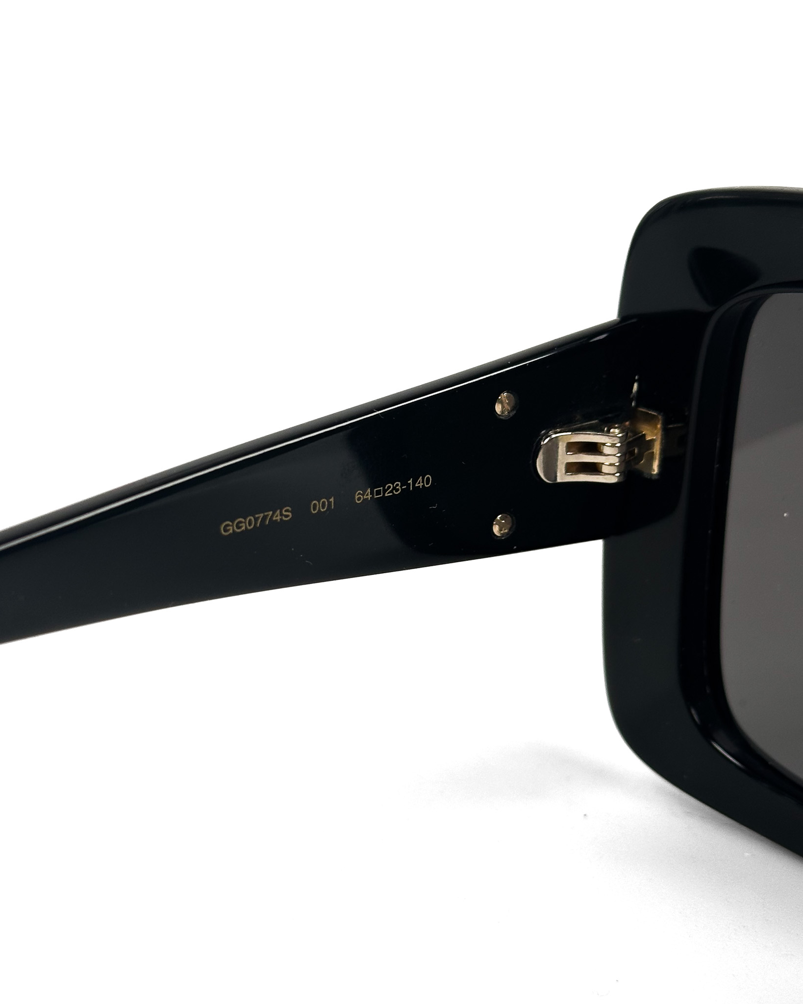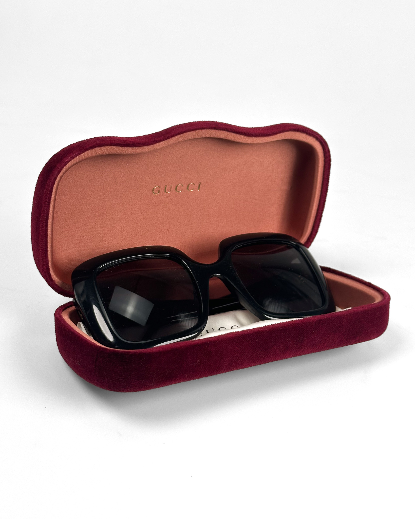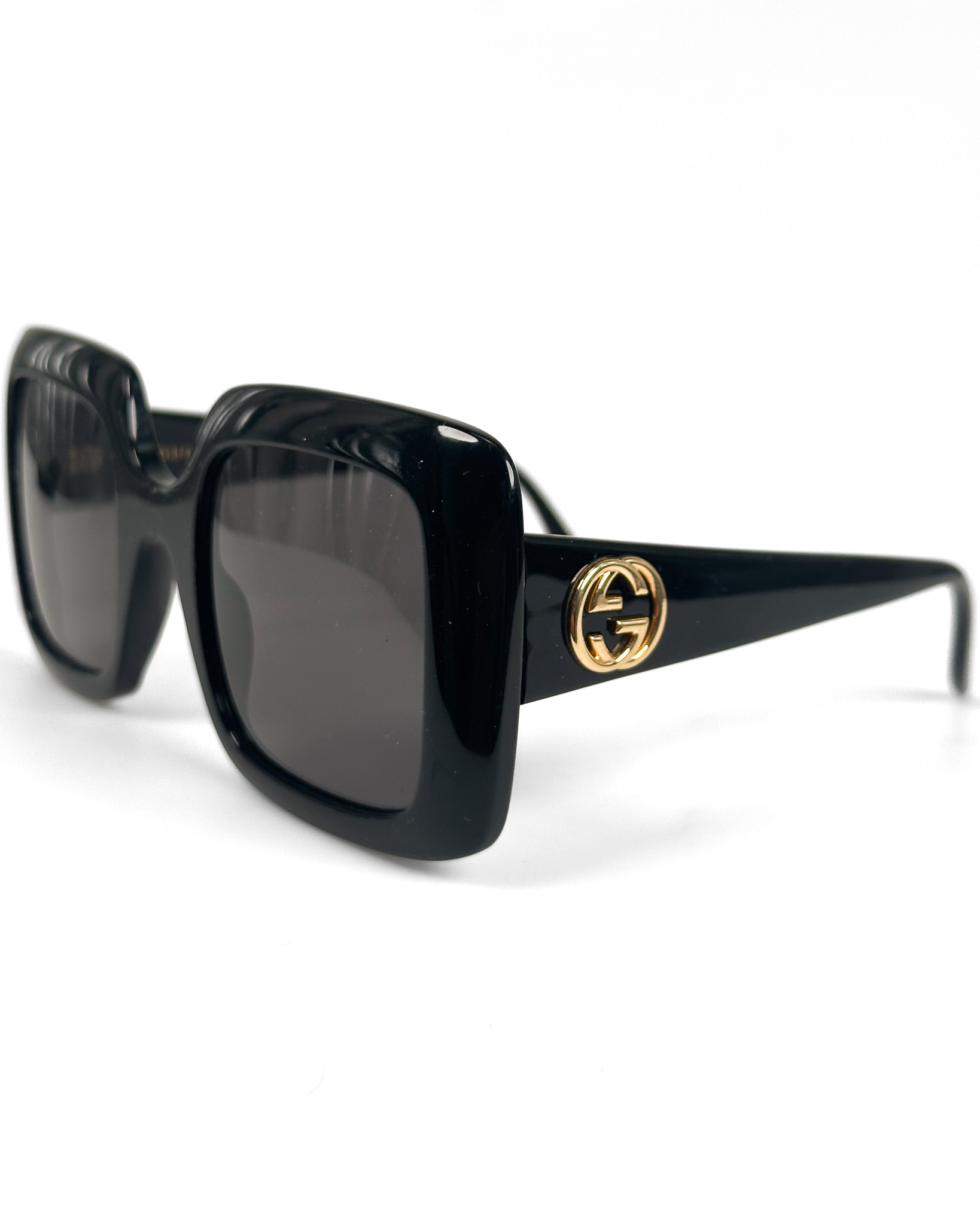 "Czarne kwadratowe okulary w grubszych oprawkach, duże złote logo marki na zausznikach. Posiadają rysy na oprawkach oraz drobne rysy na szkłach. W zestawie z pudelkiem i woreczkiem do przechowywania."