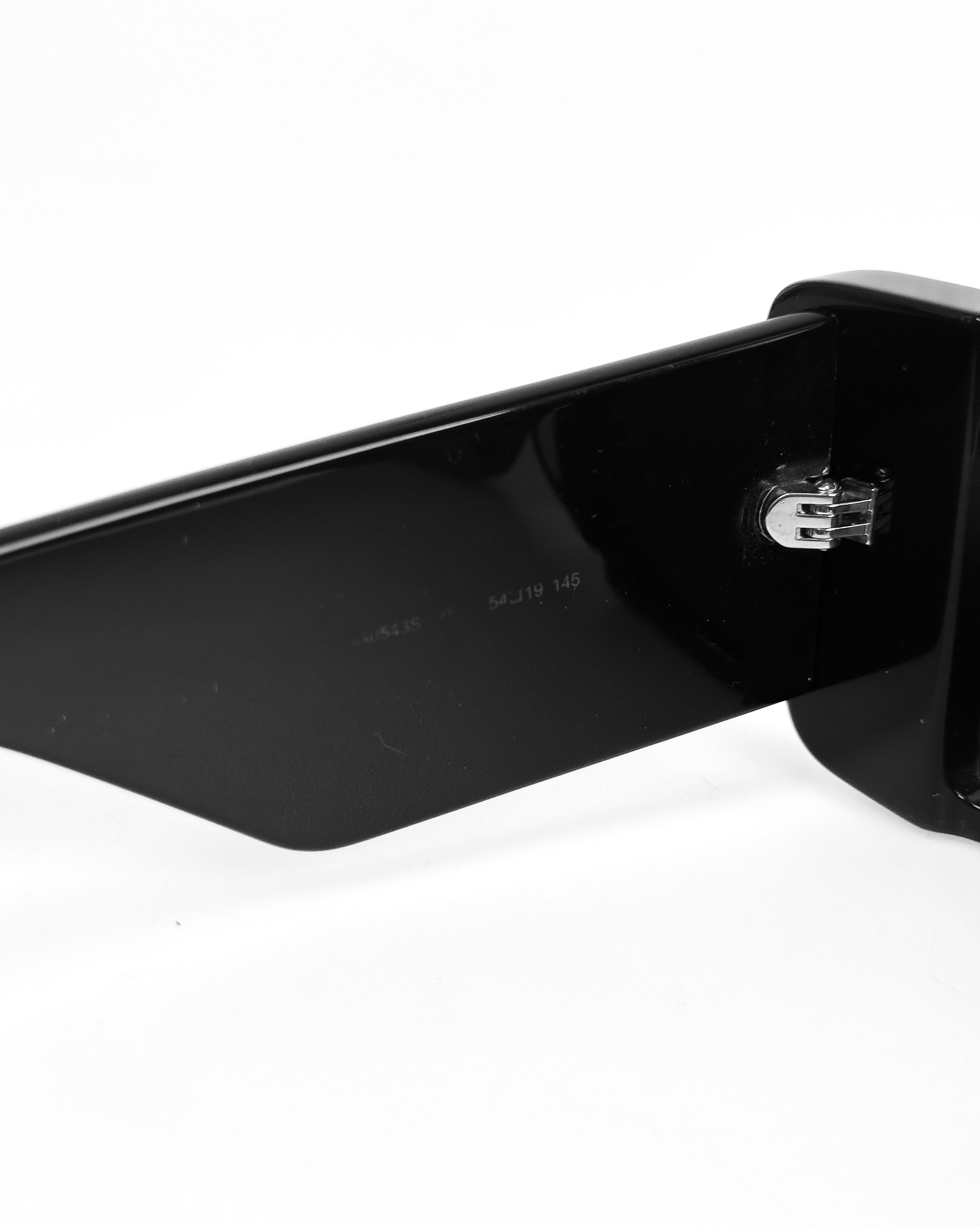 "Czarne okulary o protokątnym kształcie, szerokie zausznice z małym, złotym logo. Rozmiar 54. W zestawie z pudełkiem."