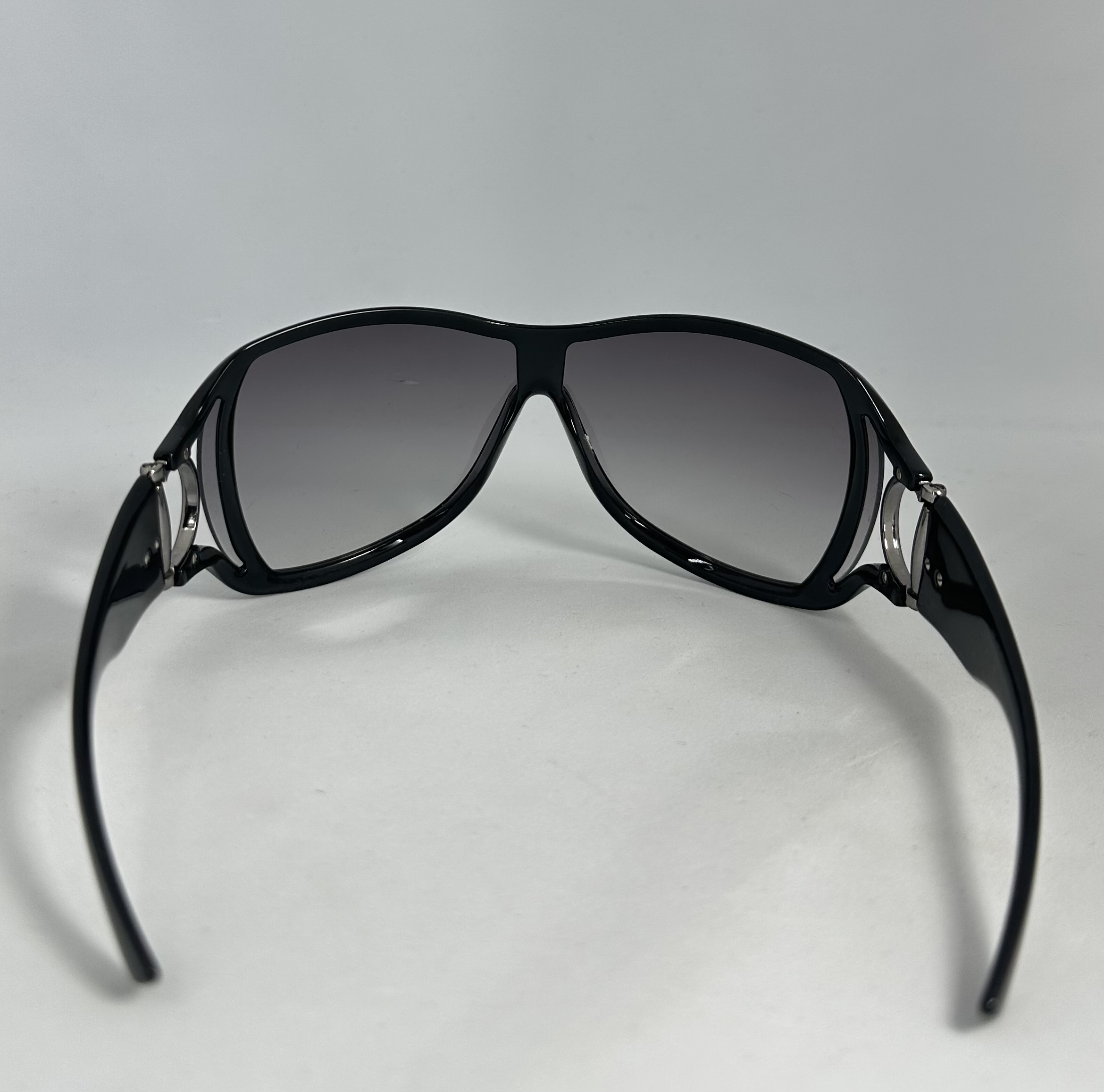 "czarne okulary przeciwsłoneczne, vintage, mocno zabudowane, plastikowe, elementy wędzidła i logo po bokach na nausznikach, porysowane, używane, z etui"