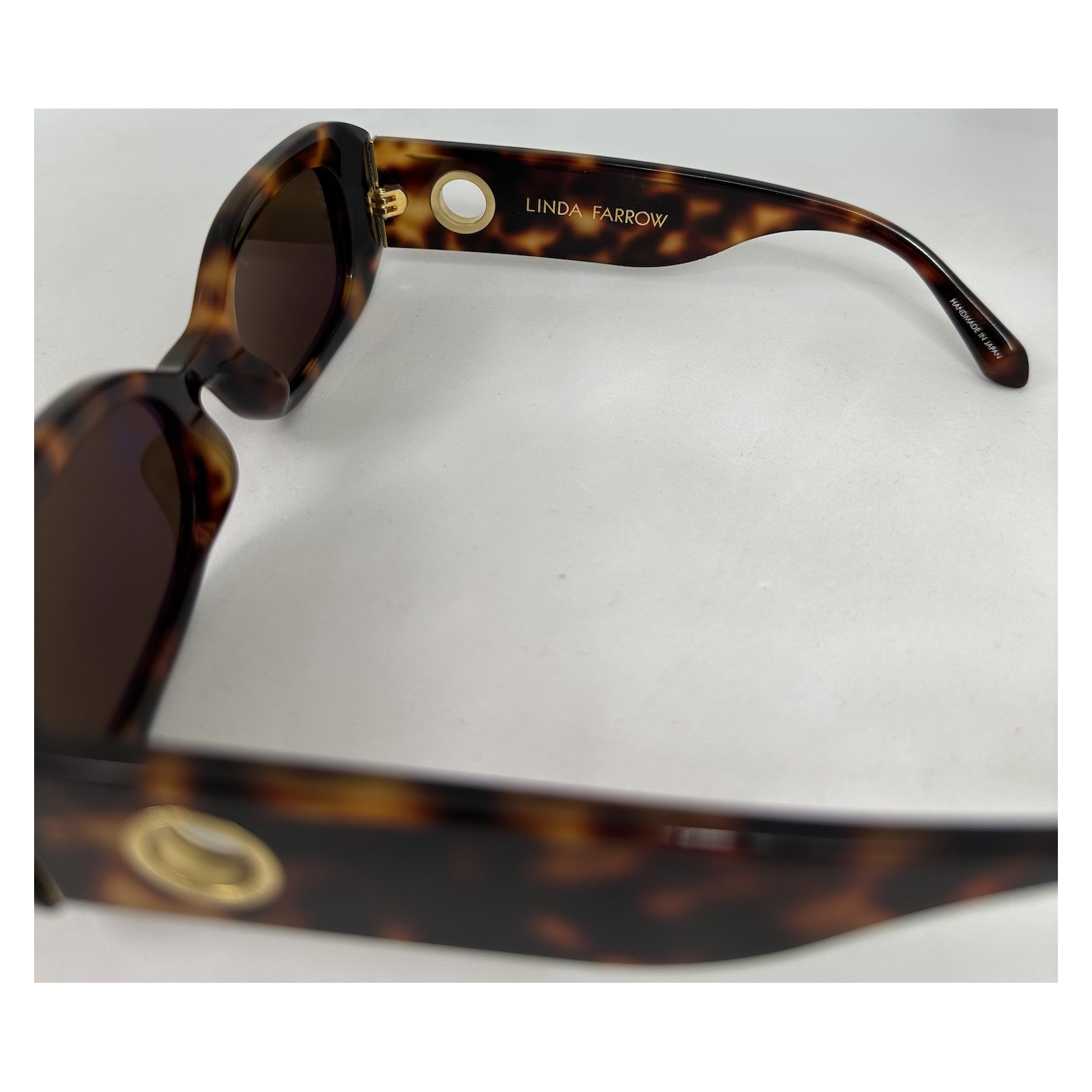 "okulary z podłużnymi szkłami, w panterkowych masywnych oprawkach, na zausznikach złote elementy z logowaniem, stan bardzo dobry, etui w zestawie."
