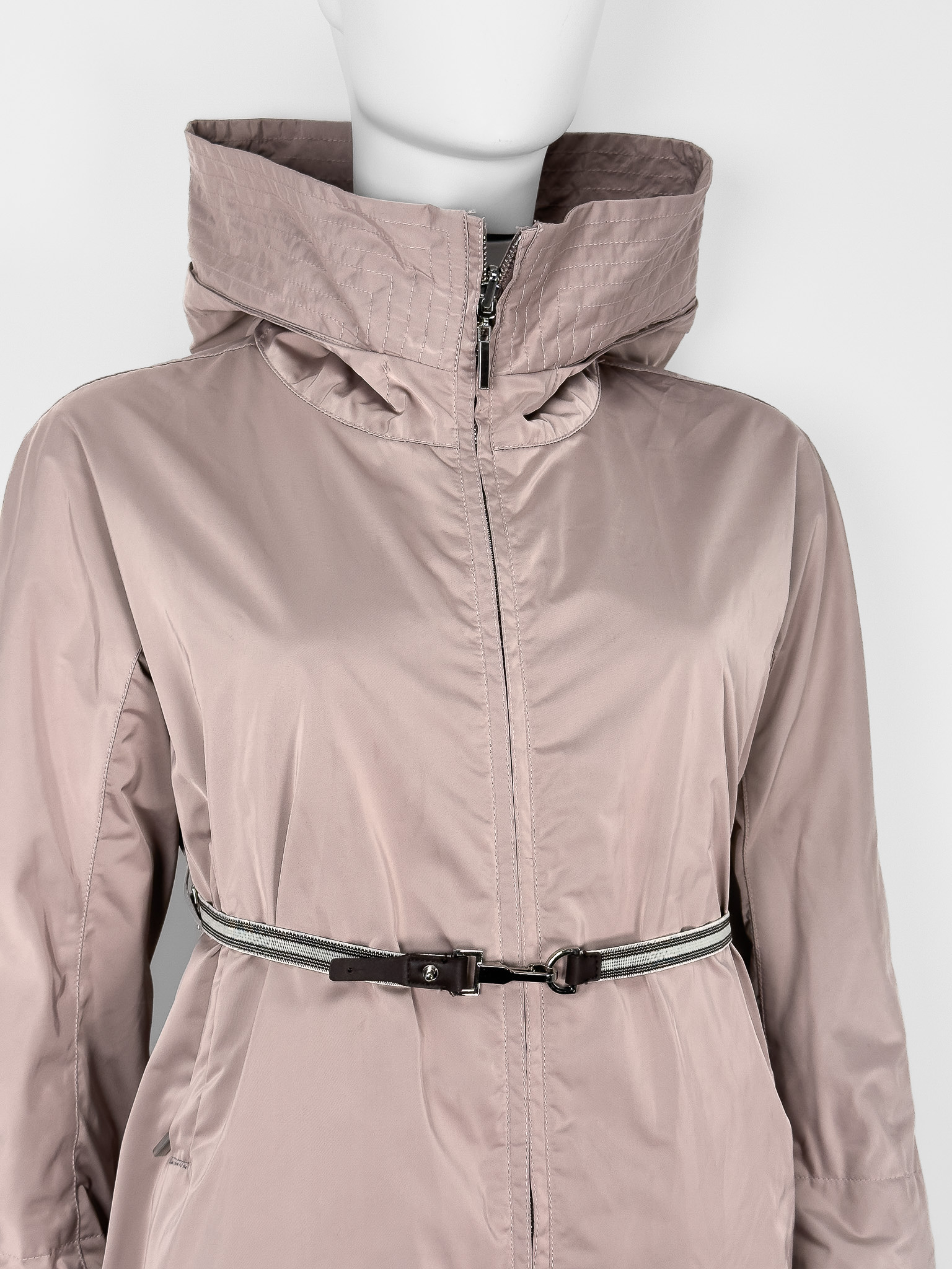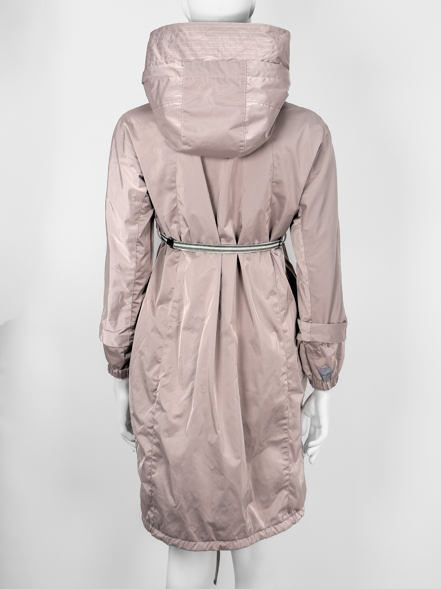 "Pudrowo-różowa ortalionowa kurtka za kolano, kaptur, zapinana na srebrne dwa suwaki, dwie kryte kieszenie po bokach, regulowana w talii, gumowy pasek w tylnej części, odpinane wstawki przy mankietach, wykończone ściągaczem. Rozmiar z metki IT 42. Skład: 100% poliester. Wymiary: szerokość mierzona od pachy do pachy 51cm, długość całkowita 93cm."