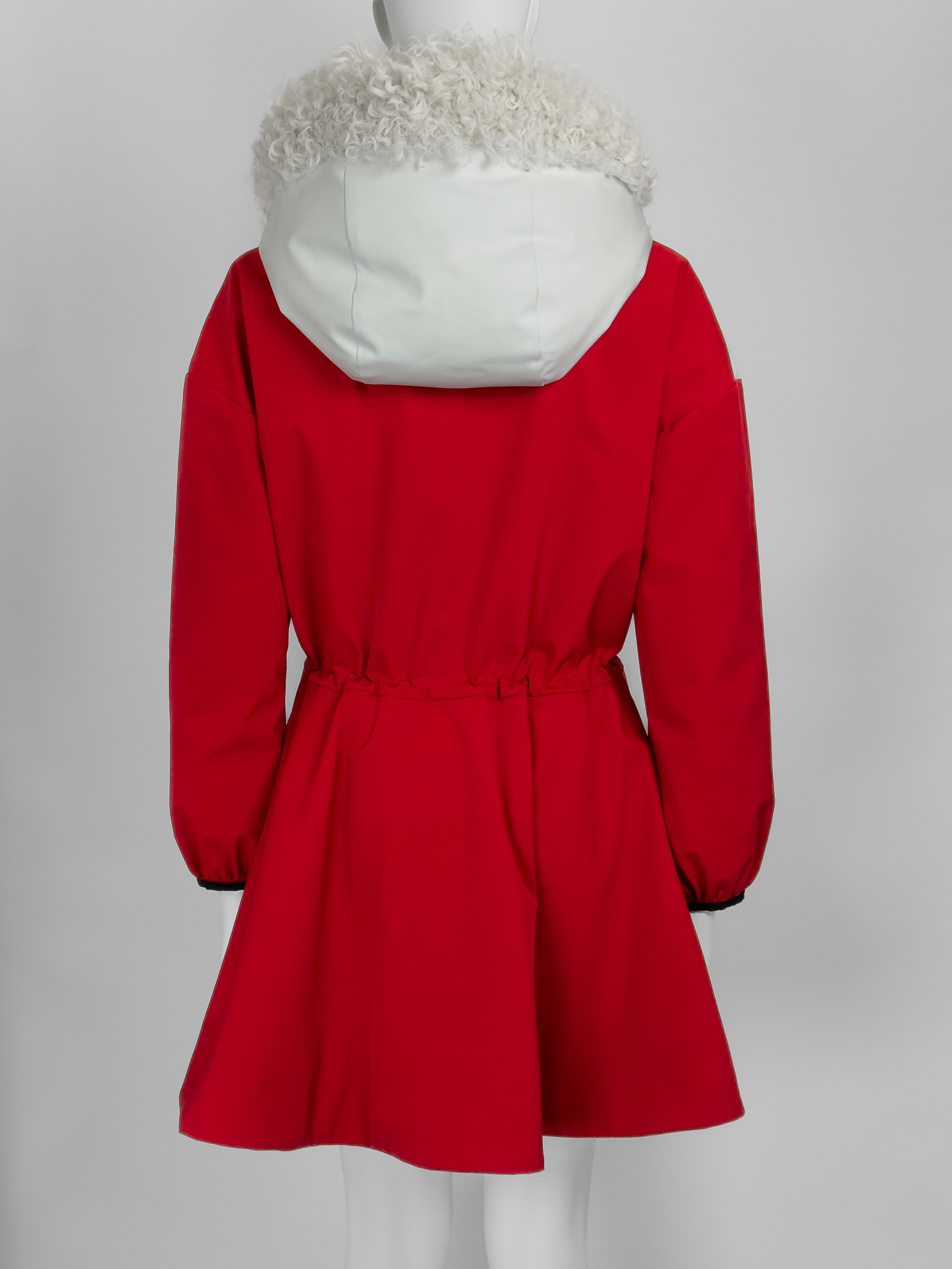"Czerwono-biała parka z kapturem wykończonym białym futrem, długość przed kolano, taliowana, regulowana talia, duża czerwona naszywka z logo w okolicy biustu, marszczone mankiety, zapinana na srebrny suwak wykończony zawieszką w kształcie charakterystycznym dla marki, trzy zapinane kieszenie. Rozmiar z metki 0. Skład: 88% poliamid, 12% elastan; podszewka: 100% poliamid. Wymiary: szerokość mierzona od pachy do pachy 54cm, długość całkowita 85cm."
