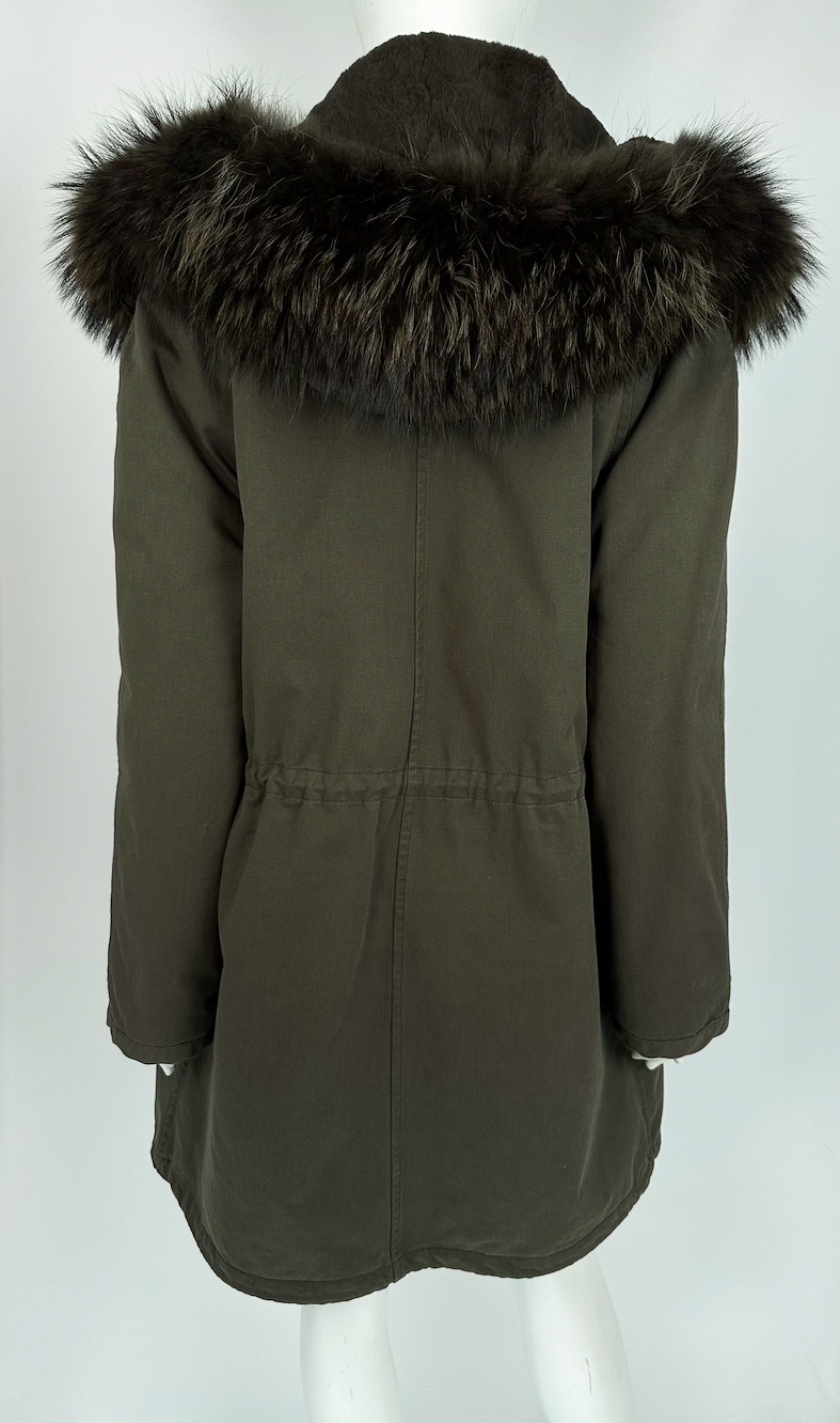 "Parka w kolorze khaki ozdobiona dużym odpinanym brązowo-beżowym futrem, regulowana sznurkiem w talii, dwie kieszenie z klapami zapinane na zatrzaski z przodu, ciemnobrązowa odpinana futrzana potrzewka. Rozmiar z metki 38. Skład: futro z królika; 100% poliester. Wymiary: szerokość mierzona od pachy do pachy 56cm, długość rękawa 55cm, szerokość mierzona od pachy do pachy, długość całkowita 88cm."