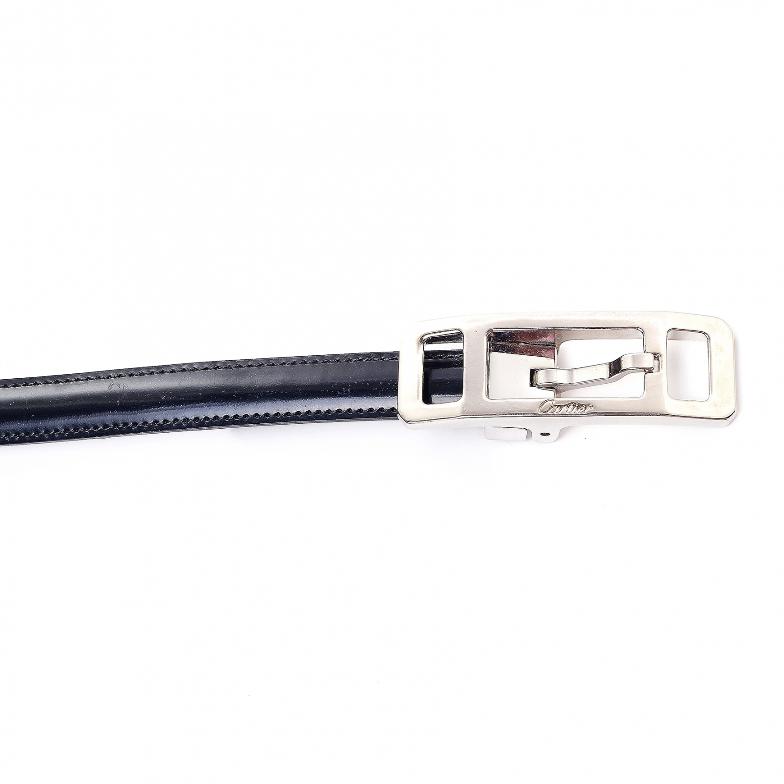 "Czarny, cienki pasek , ze skóry lakierowanej, ze srebrną klamrą."