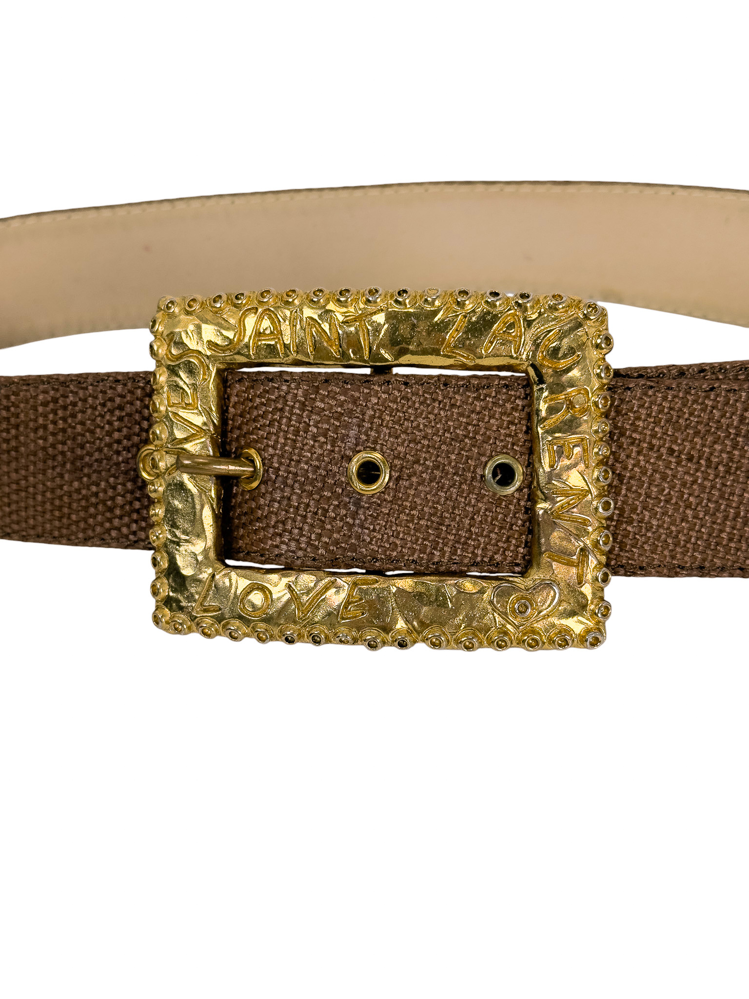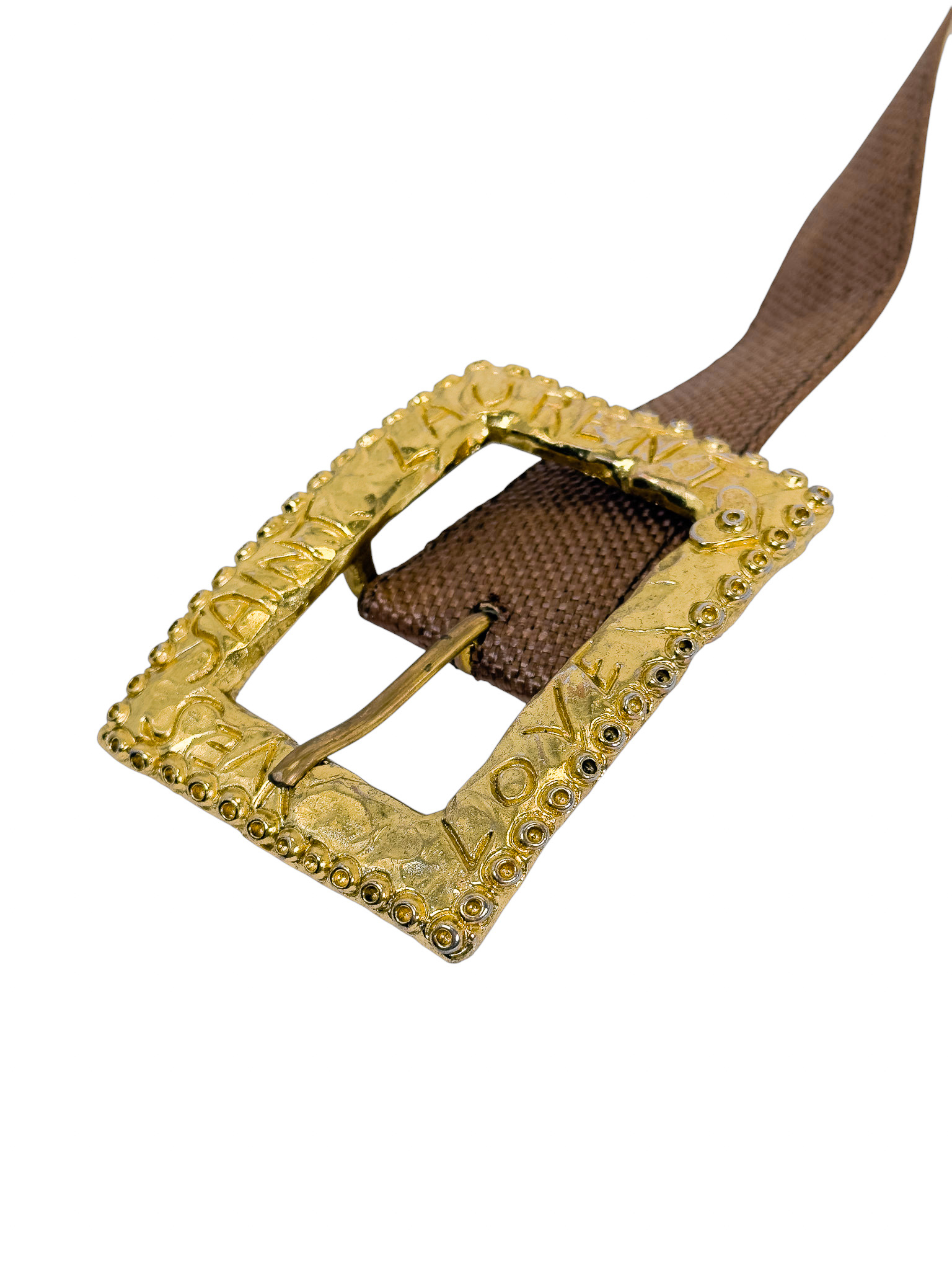 "Brązowy pasek ozdobiony dużą złotą prostokątną klamrą z grawerowanym logo marki, materiałowy, beżowe wnętrze. Stan bardzo dobry, delikatnie zabrudzone wnętrze. Wymiary: długość do ostaniej dziurki 71cm, szerokość 3,5cm."