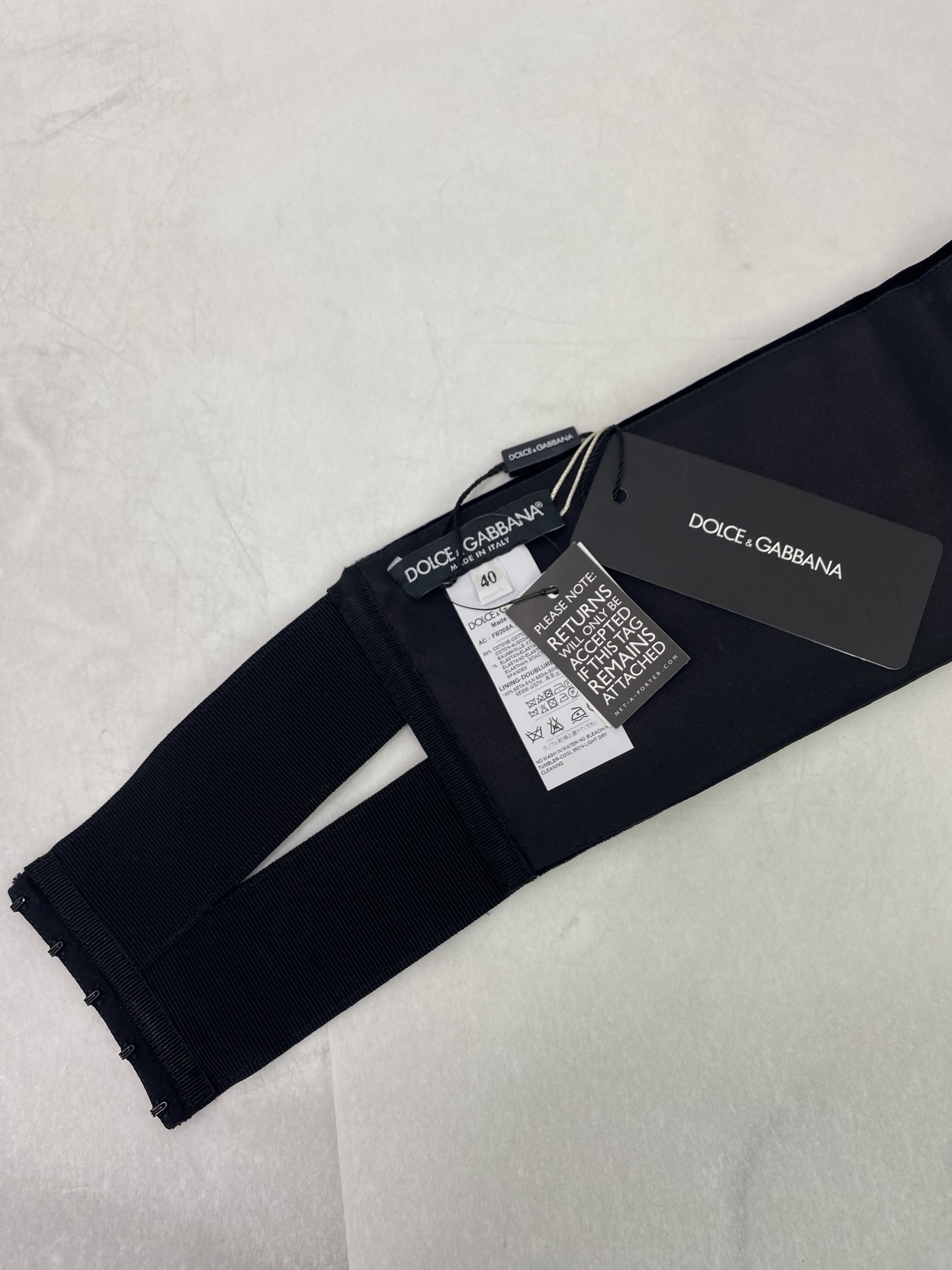 "czarny, welurowy pas smokingowy, na gumie, zapinany na zatrzaski, rozmiar 40(it), nowy z metkami i pudełkiem."