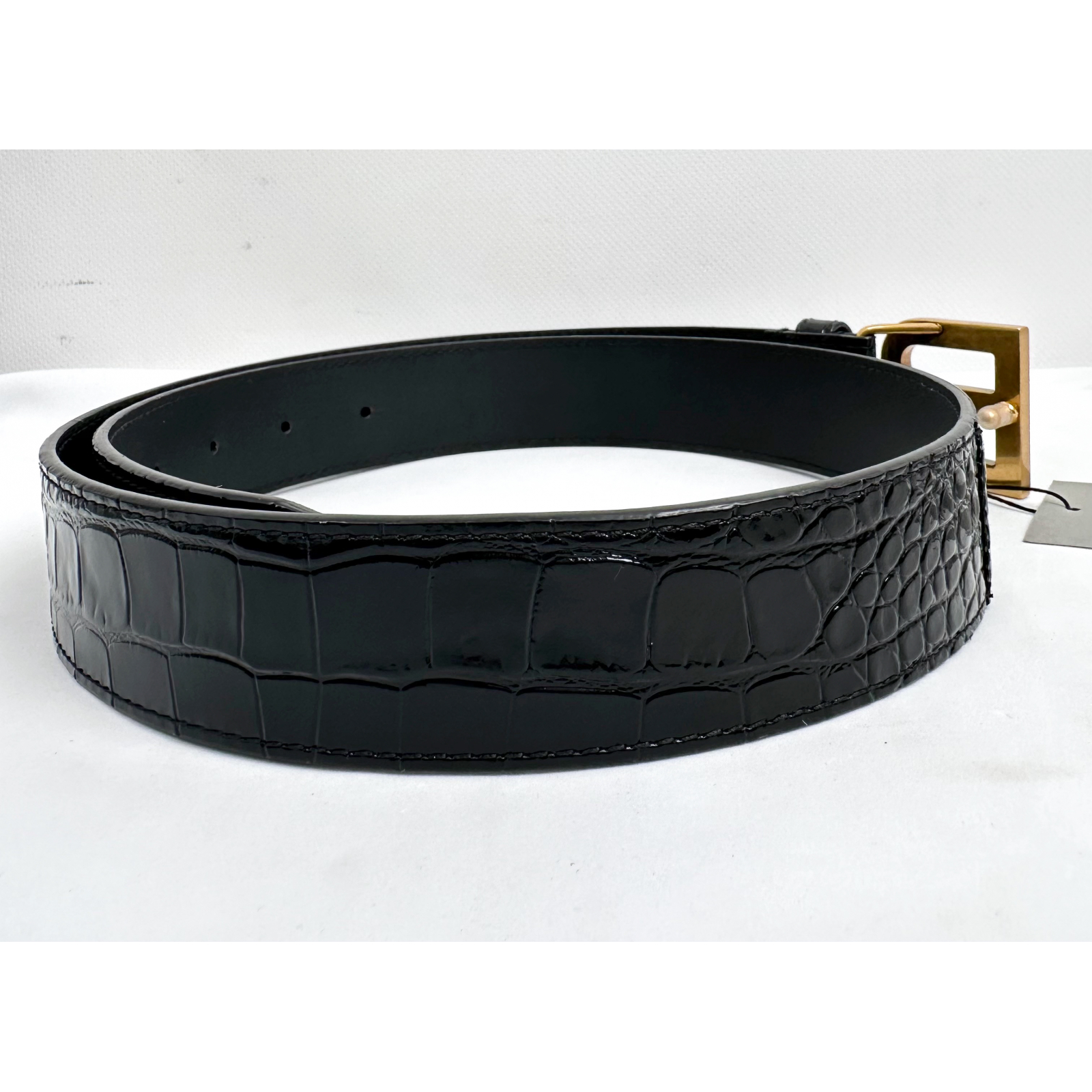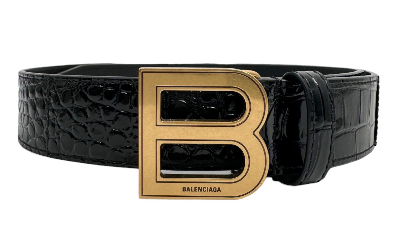 "Czarny skórzany błyszczący pasek w motyw zwierzęcy, ozdobiony dużą złotą matowa klamrą w kształcie litery "B" z logo marki, w zestawie z workiem przeciwkurzowym oraz pudełkiem. Stan nowy z metką. Rozmiar 85cm, szerokość 3,5cm."