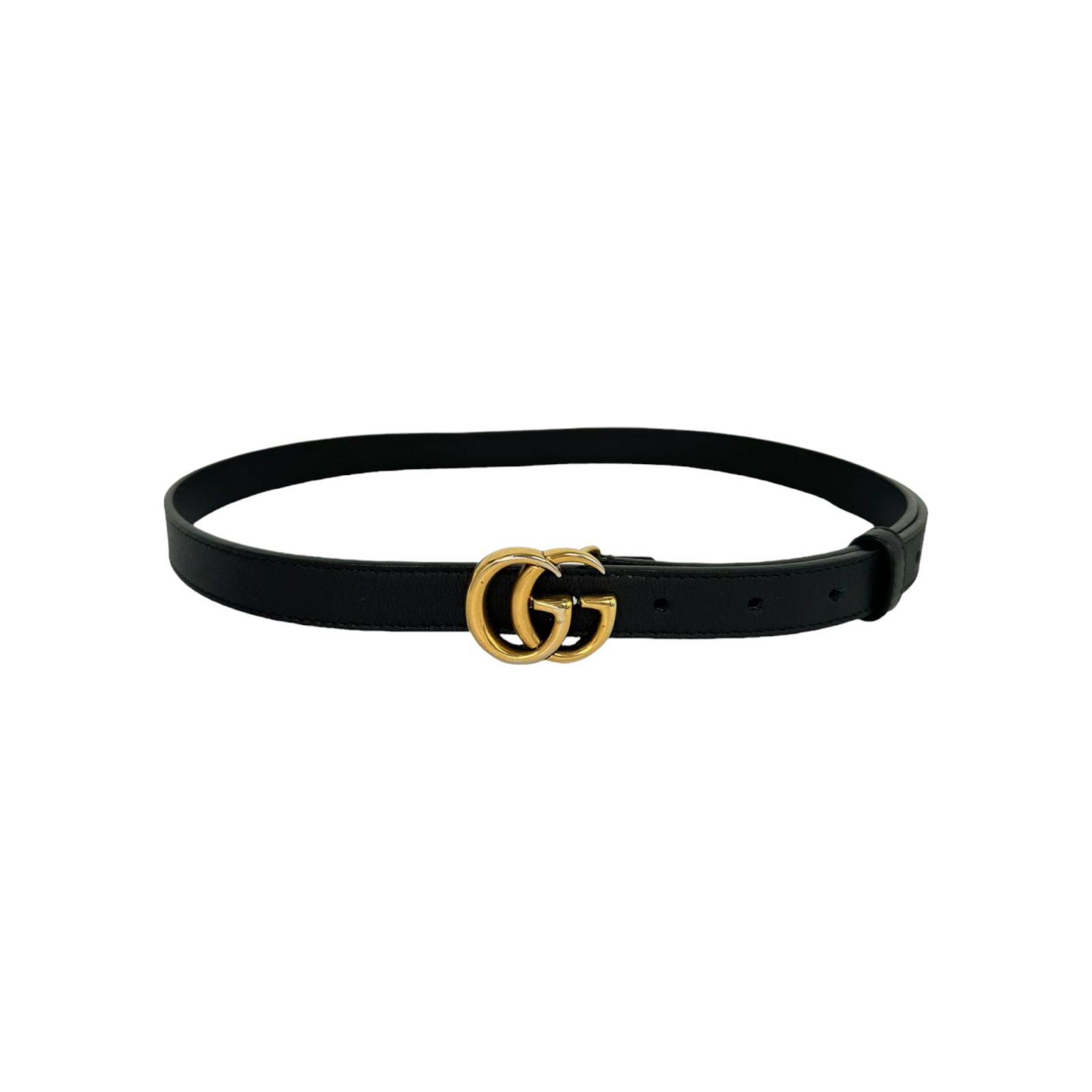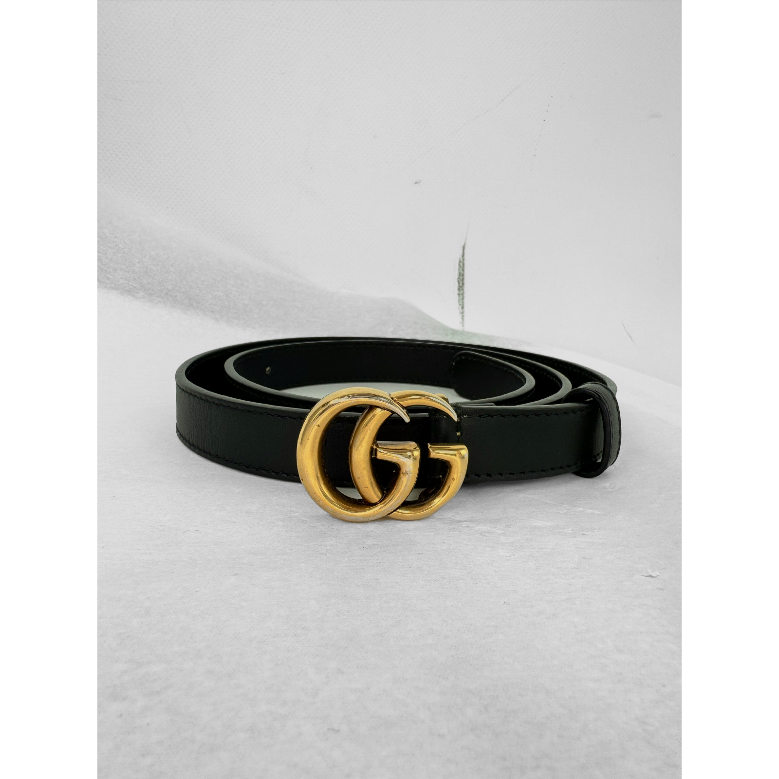 "Czarny skórzany pasek ozdobiony złotym zapięciem z logo marki, miękka skóra, cienki, używany. Stan bardzo dobry, delikatnie wytarty kolor na zapięciu. Rozmiar 80."