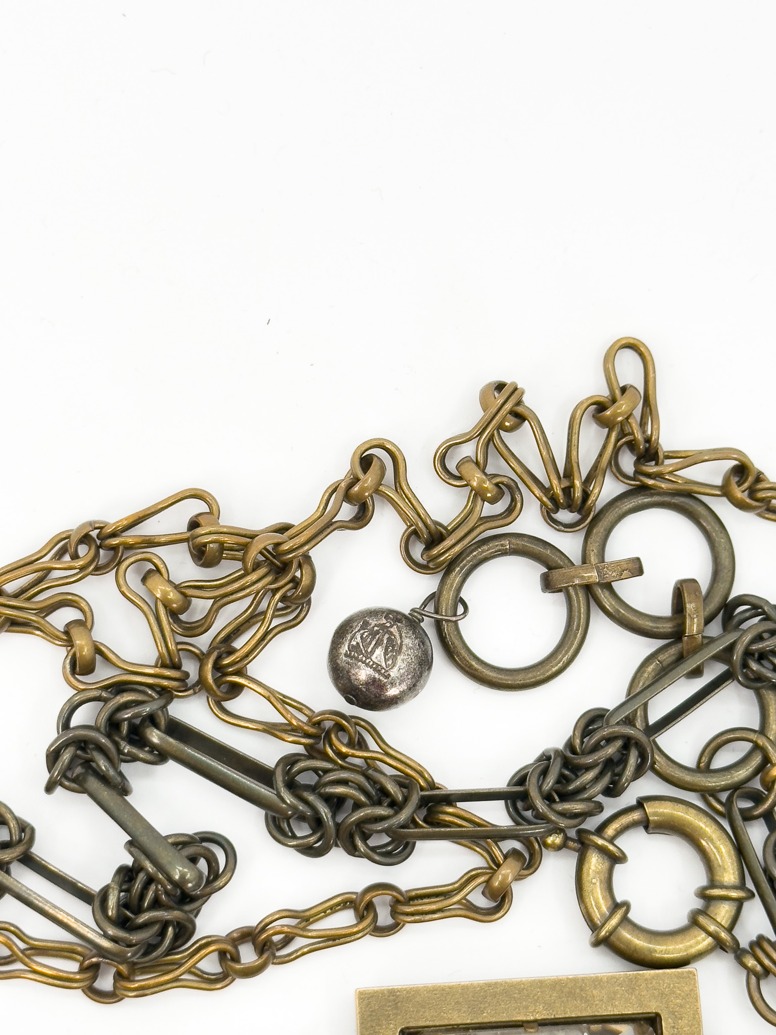 "Złoty łańcuchowy podwójny pasek ozdobiony kwadratową ozdobą wykończoną błyszczącymi i szklanymi cyrkoniami, dwukolorowy, metaliczna okrągła zawieszka z logo marki."