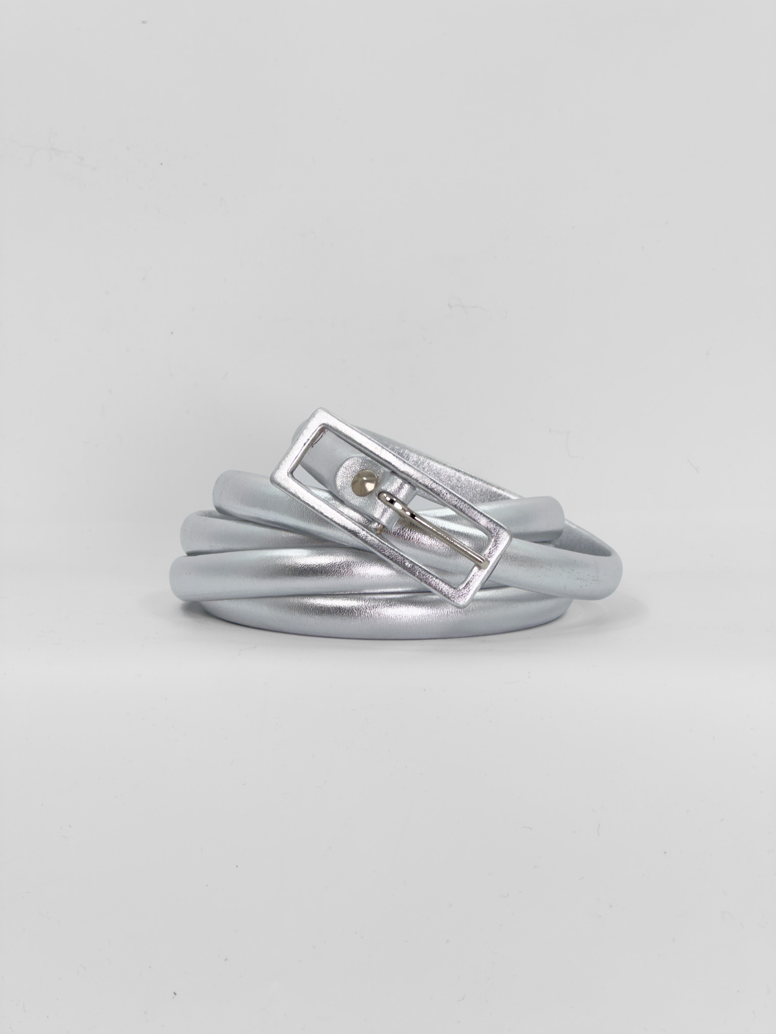 "Srebrny skórzany podwójny cienki pasek, srebrne metalowe detale, prostokątna klamra, używany. Stan dobry, delikatne przetarcia na klamrze. Szerokość: 2cm."