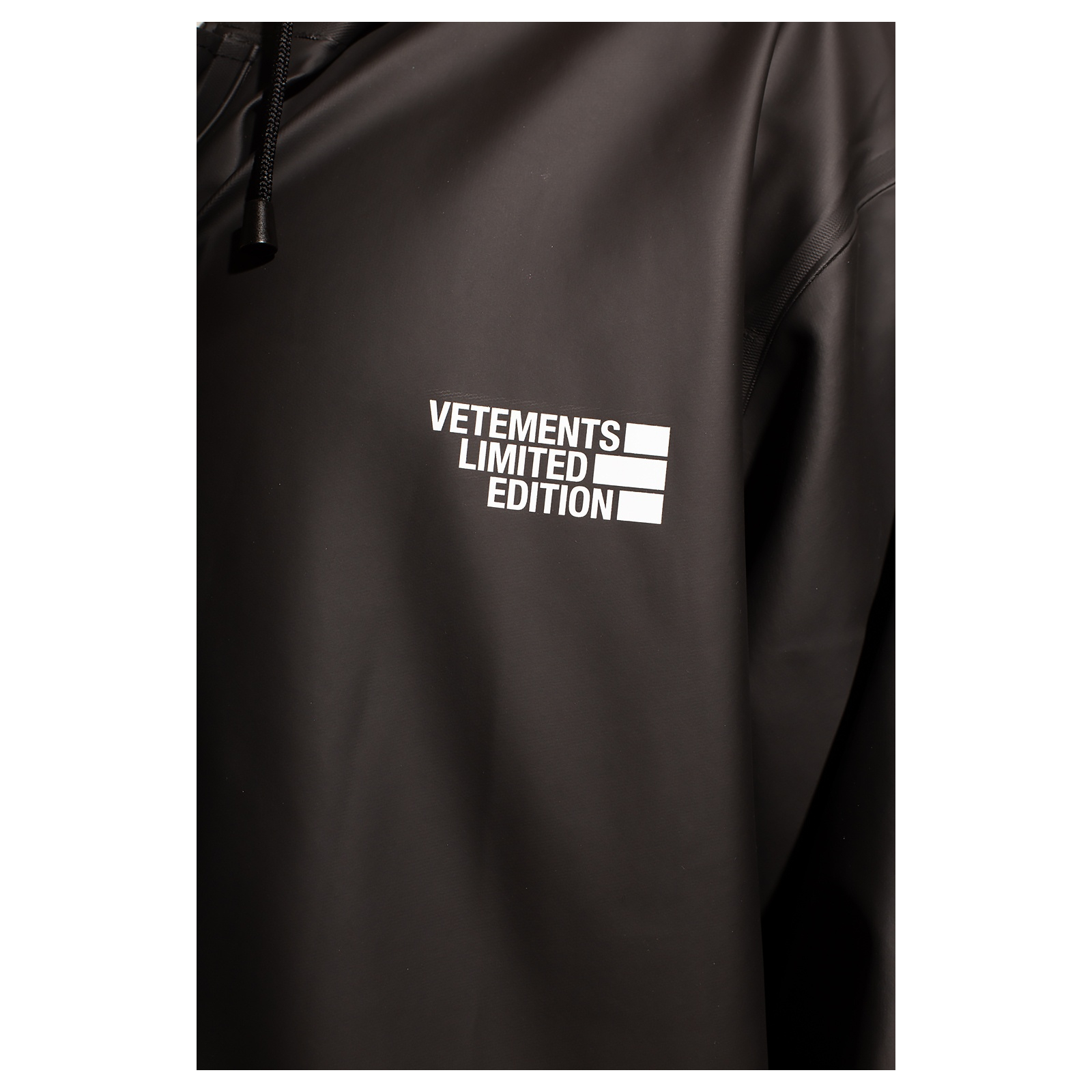 "czarny, długi płaszcz przeciwdeszczowy, zapinany z przodu na suwak oraz zatrzaski, z kapturem, boczne kieszenie, długi rękaw, z tyłu oraz na piersi białe napisy, nowy z metkami. Brak metki z rozmiarem. Skład: 100% poliester, 100% PVC. Wymiary: szer. ramion 56 cm, szer. biustu 64 cm, szer. talii 64 cm, dł. całkowita 113 cm. dł. rękawa 66 cm."