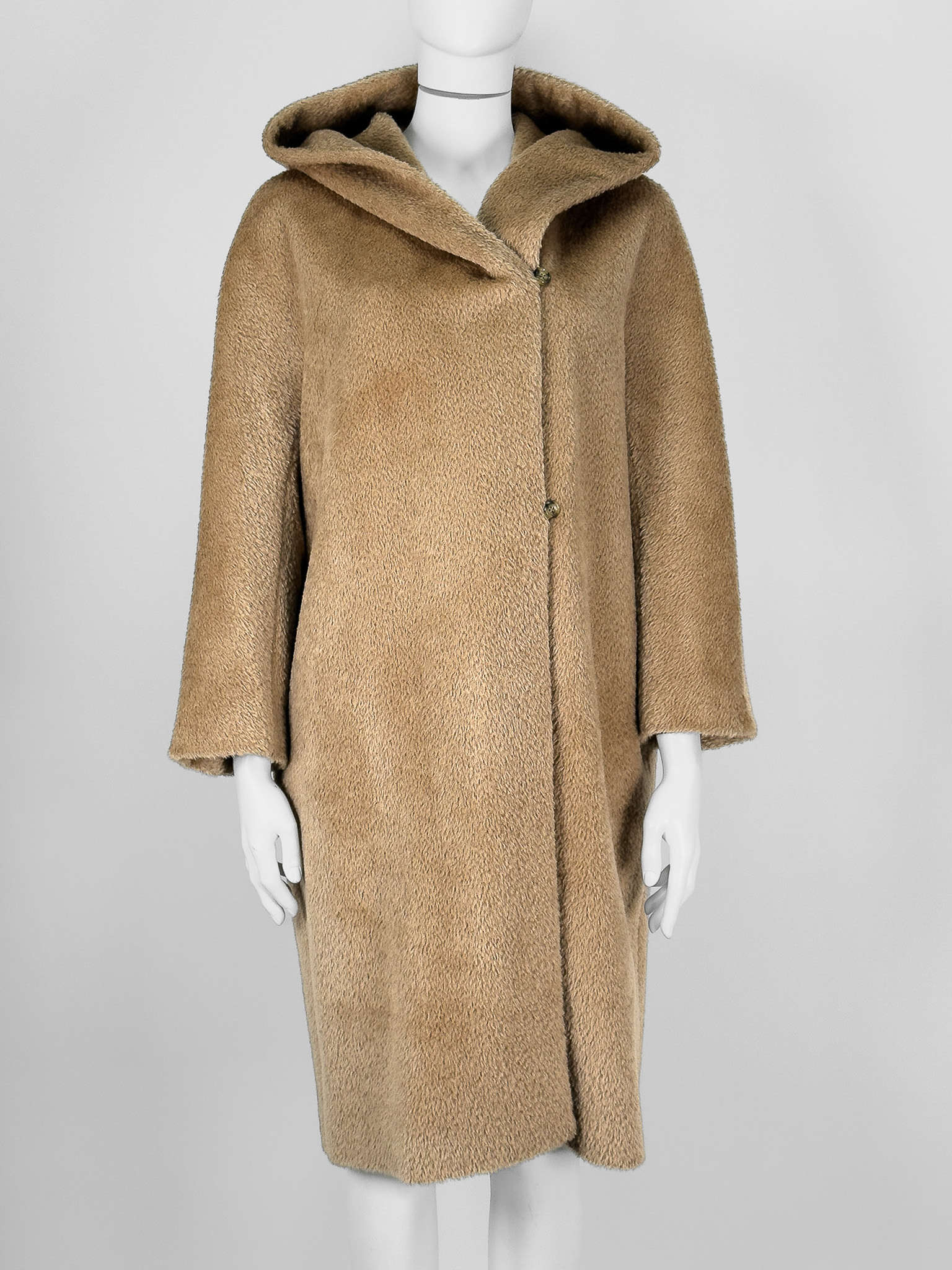 "Długi beżowy płaszcz z misia, zapinany na jeden guzik, kołnierz z kapturem. Rozmiar z. metki IT 40. Skład: 52% alpaka, 48% wełna. Wymiary: szer. ramion 55 cm, szer. biustu 58 cm, szer. talii 60 cm, dł. całkowita 106 cm, dł. rękawa 42 cm."