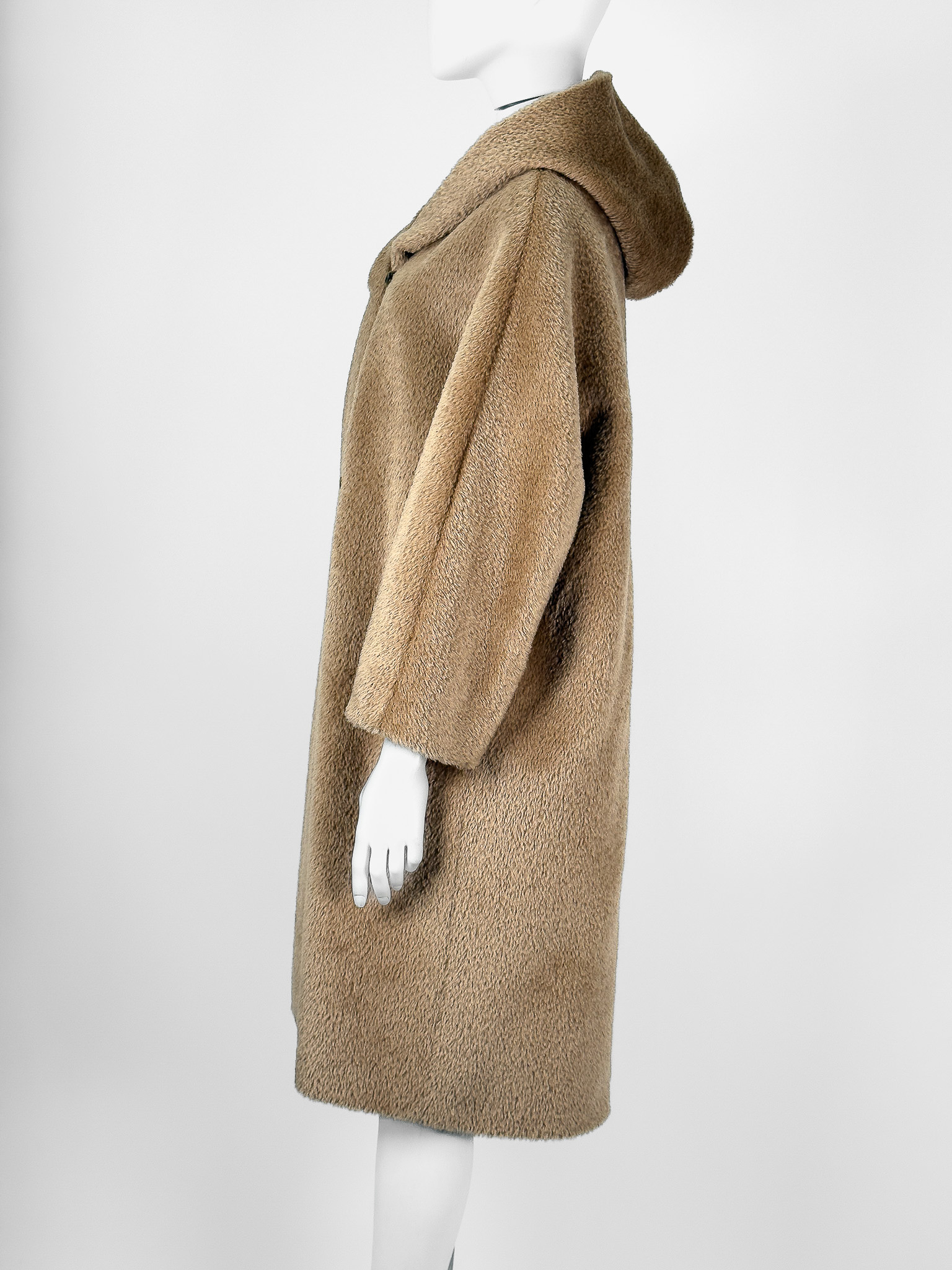 "Długi beżowy płaszcz z misia, zapinany na jeden guzik, kołnierz z kapturem. Rozmiar z. metki IT 40. Skład: 52% alpaka, 48% wełna. Wymiary: szer. ramion 55 cm, szer. biustu 58 cm, szer. talii 60 cm, dł. całkowita 106 cm, dł. rękawa 42 cm."