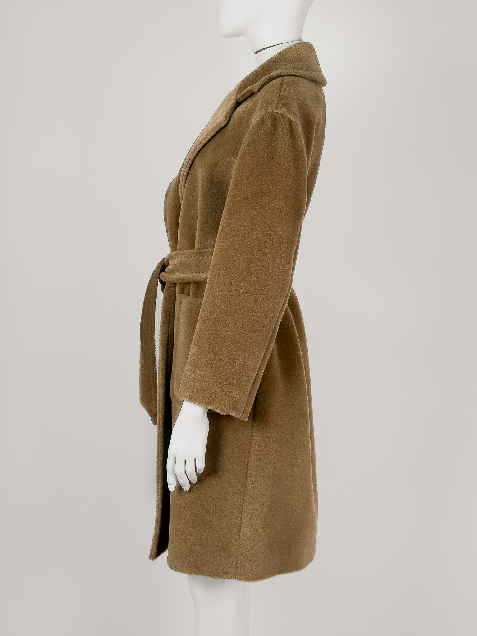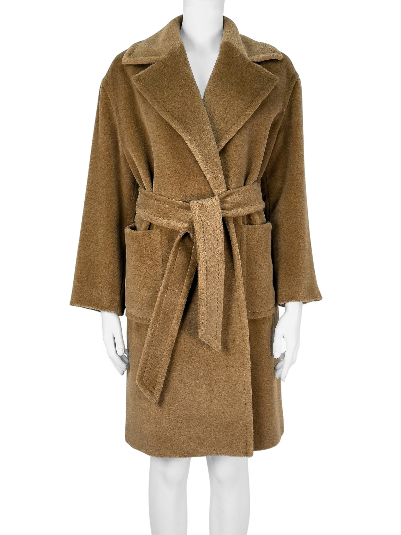"Camelowy płaszcz z domieszką alpaki w składzie, długość do kolan, zapinany na kryte zatrzaski, wiązany paskiem w pasie, dwie kieszenie po bokach, wykończony stębnowaniem, logowana podszewka. Stan nowy z metką. Rozmiar z metki IT 36. Skład: 75% alpaka, 25% wełna dziewicza; podszewka: 100% wiskoza. Wymiary: szerokość mierzona do pachy do pachy 60cm, długość całkowita 94cm."