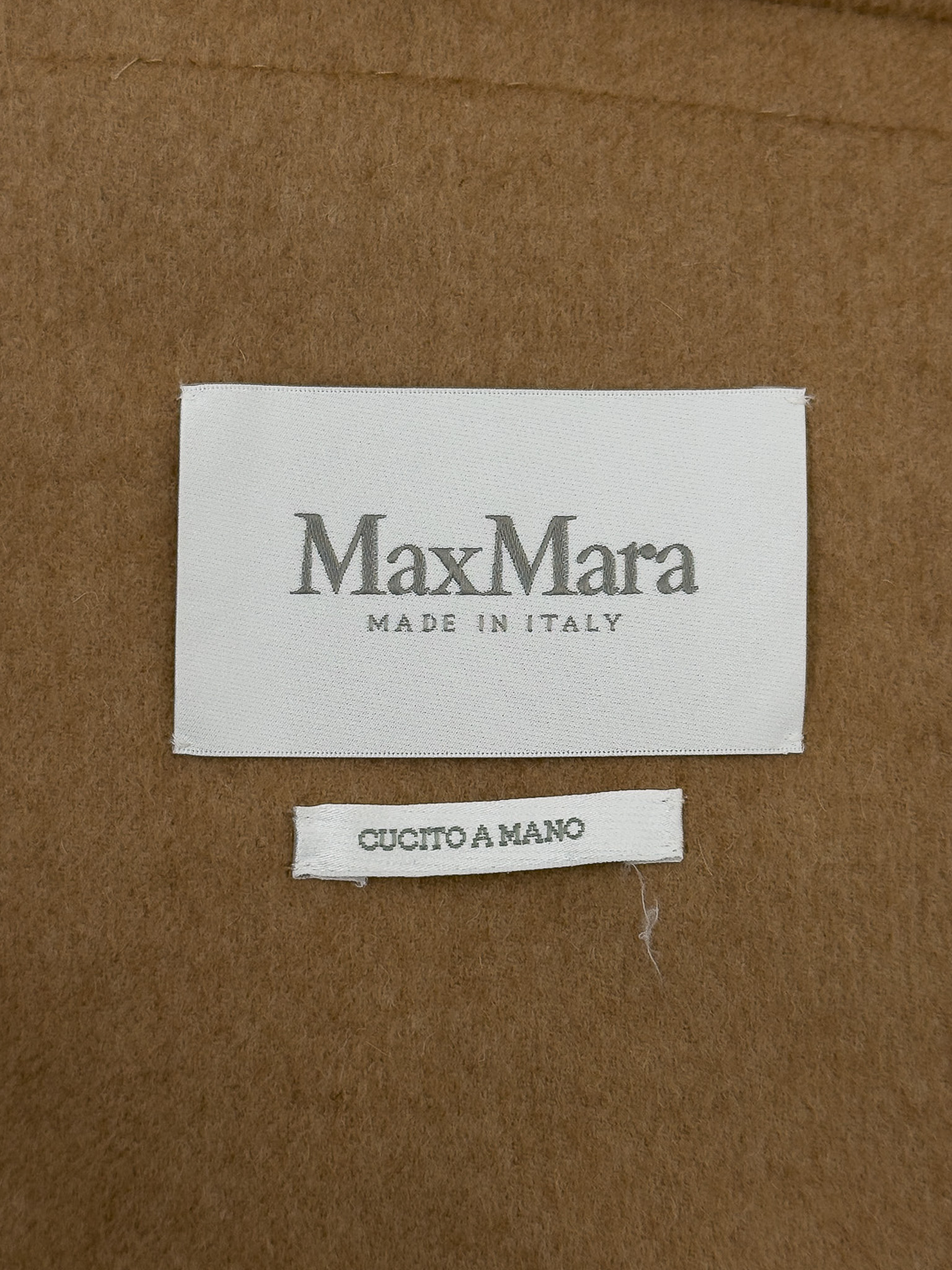 "Camelowy płaszcz w formie poncha z odpinanym kapturem, długi, szeroki luźny krój, zapinany na kryte guziki oraz sprzączkę, kołnierzyk, dwie kryte kieszenie z klapami po bokach, rozcięcia po bokach, brak podszewki, regulowane paski przy mankietach wykończone złotą sprzączką. Rozmiar z metki XS. Skład: 100% wielbłąd. Wymiary: szerokość mierzona od pachy do pachy 105cm, długość całkowita 106cm."