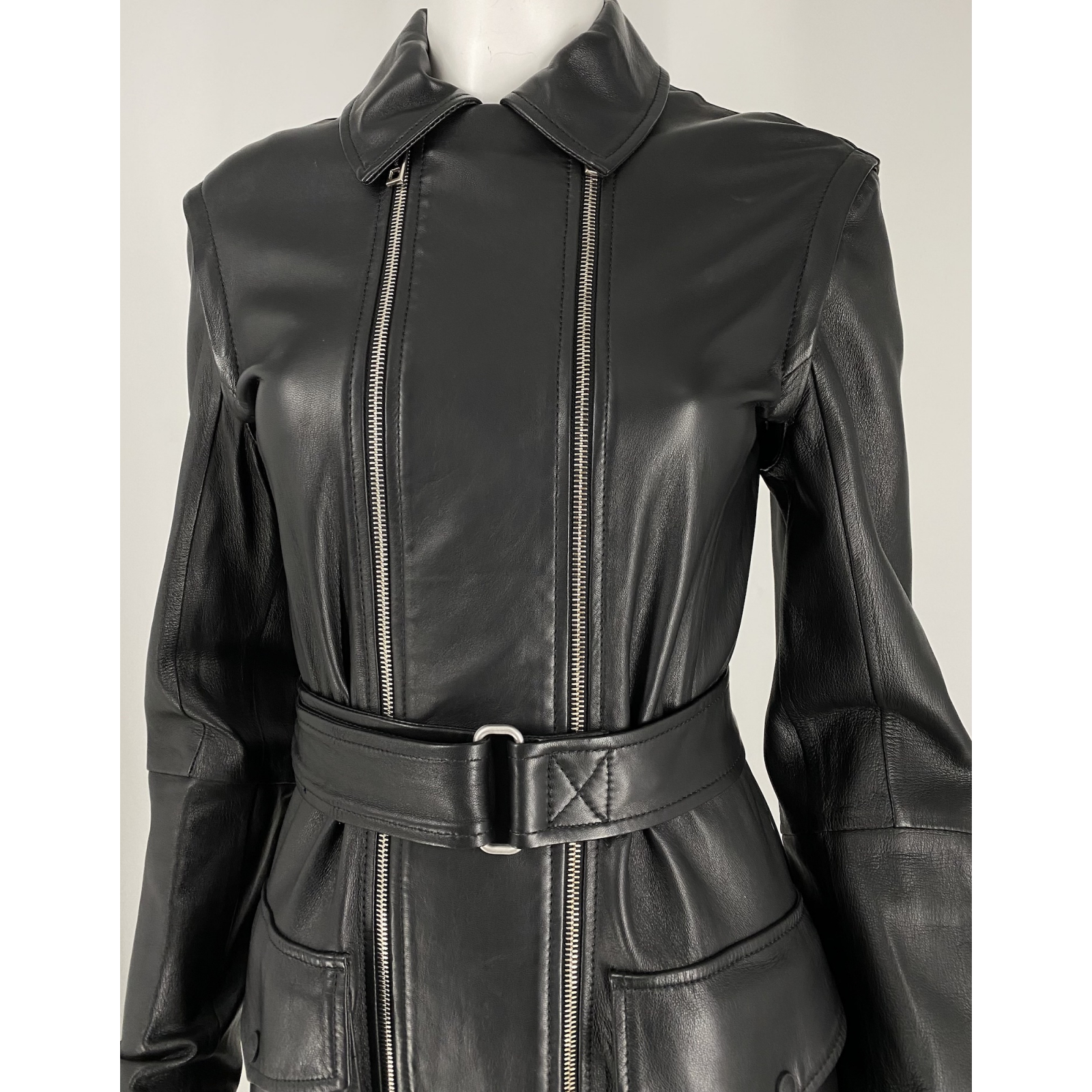 "czarny skórzany płaszcz, taliowany, kołnierz, srebrne suwaki, dwufunkcyjny z możliwością odpięcia rękawów i stworzenia kamizelki, wiązany, dwie duże szerokie kieszenie zapinane na zatrzask. Rozmiar IT40. Skład: 100% skóra owcza. Wymiary: szer. ramion 37 cm, szer. biustu 41 cm, szer. talii 39 cm, dł. całkowita 117 cm, dł. rękawa 60 cm."