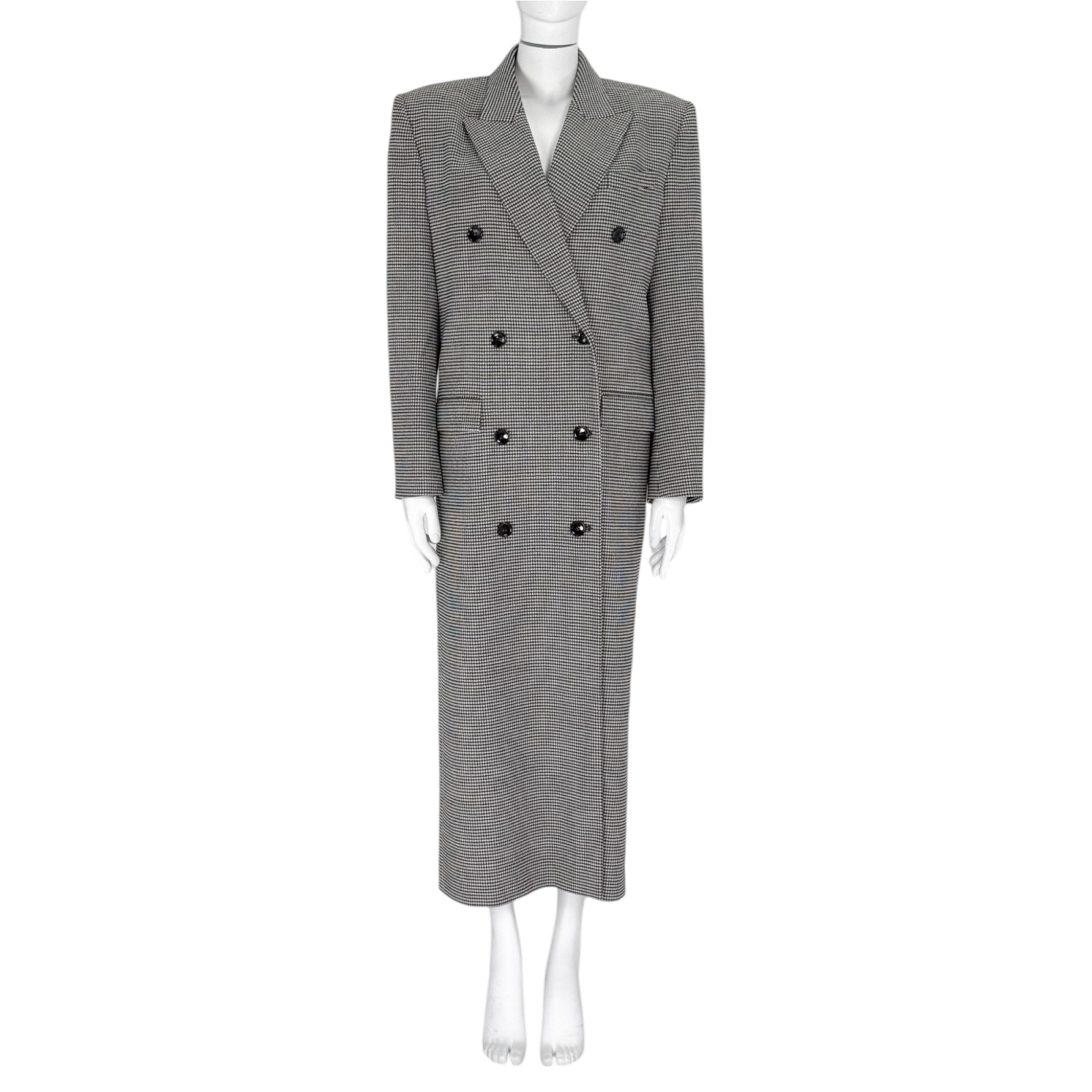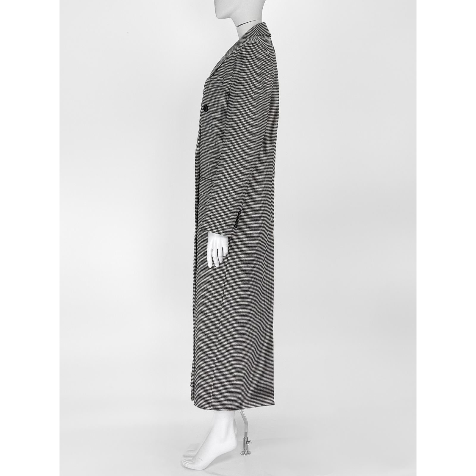 "Czarno-biały płaszcz w pepitkę, dwurzędowy, prosty krój, długość maxi, zapinany na czarne logowane guziki, dwie kryte kieszenie z klapami po boakach, szpiczasty kołnierz, dekolt w serek, poduszki na ramionach. Brak metek ze składem oraz rozmiarem. Rozmiarowo wypada jak XS/S. Wymiary: długość: 135cm, szerokość: 54cm"