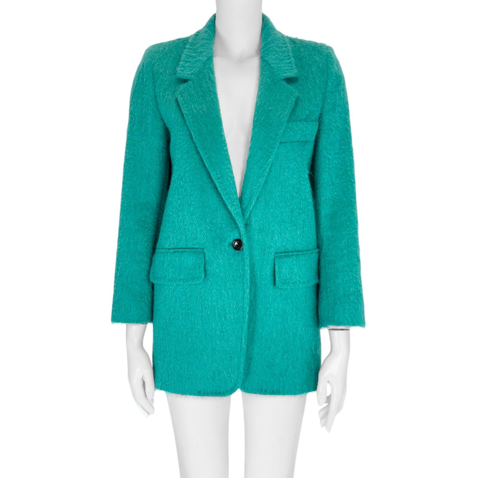 "Płaszcz/ marynarka w kolorze morskim, prosty krótszy krój, długi włos, głęboki dekolt w serek, zapinany na jeden czarny guzik, dwie zaszyte kieszenie z klapami po bokach, mankiety ozdobione guzikami, logowana podszewka. Rozmiar z metki IT 34. Skład: 78% moher, 16% poliamid, 6% bawełna; podszewka : 100% wiskoza. Wymiary: długość: 74cm, szerokość pod pachami: 47,5cm"