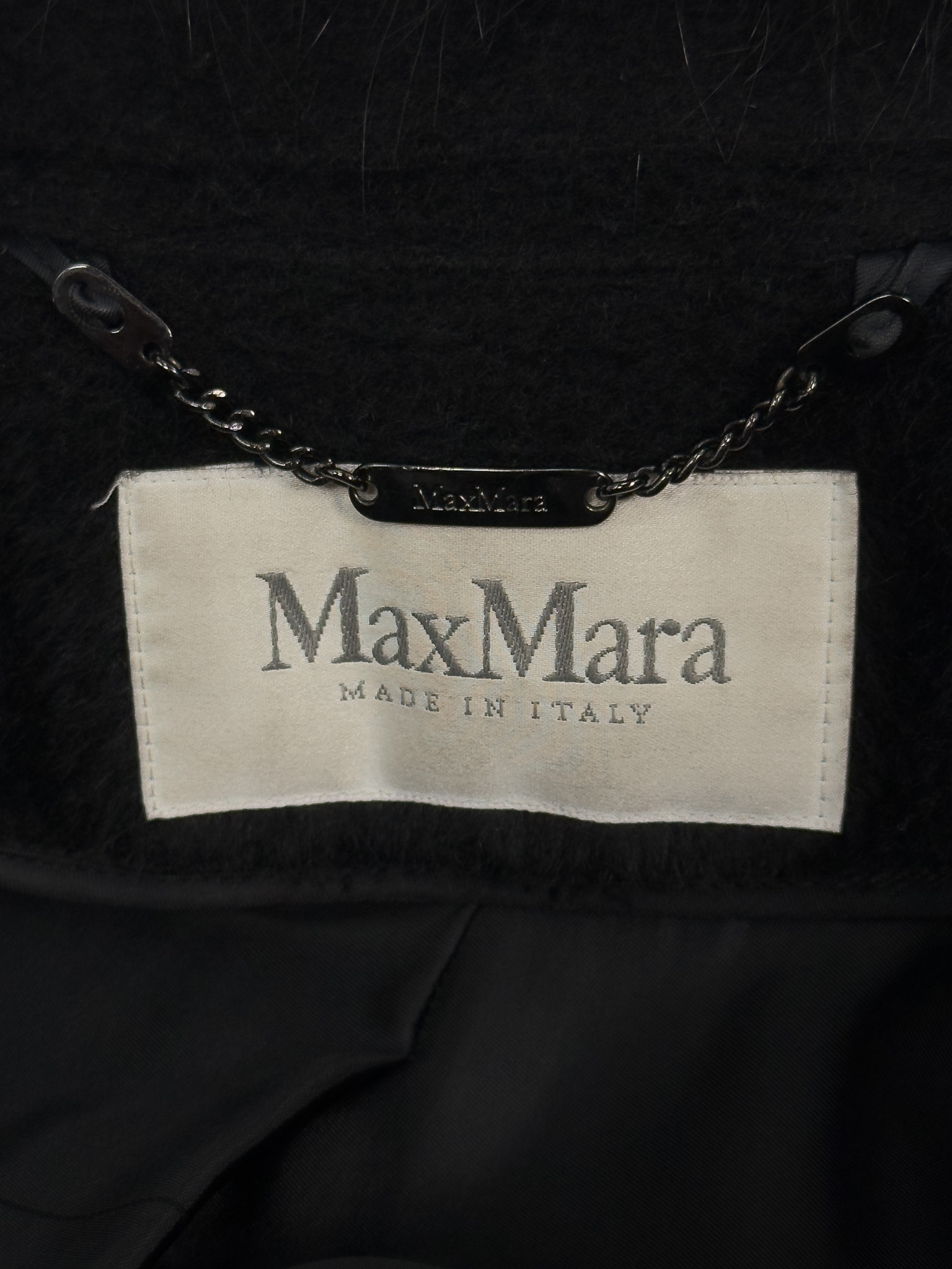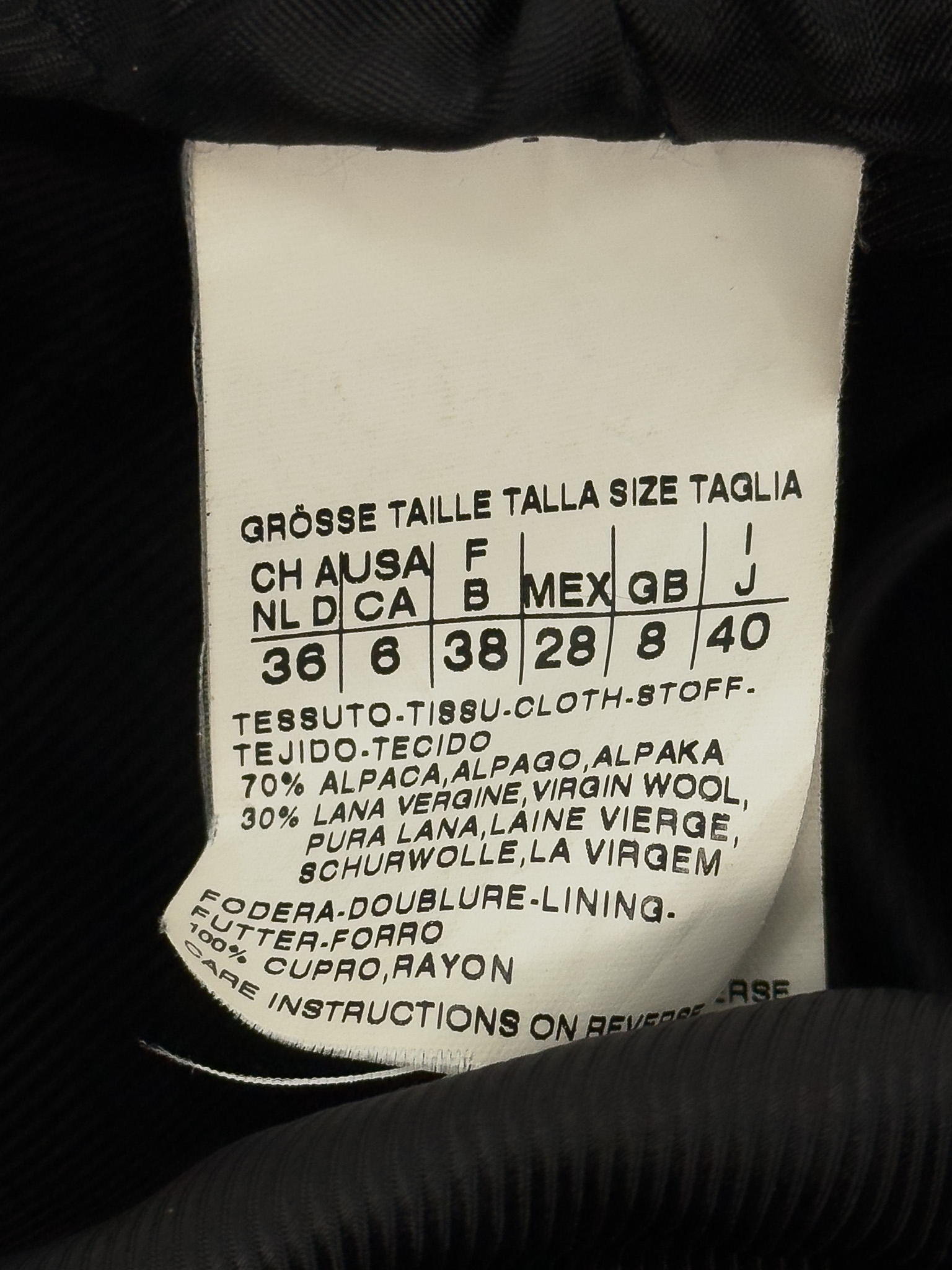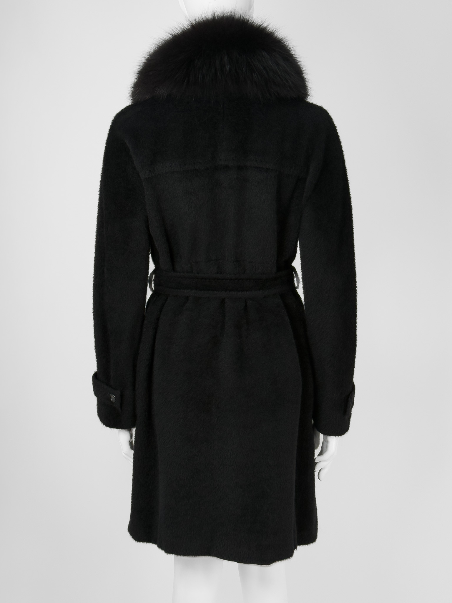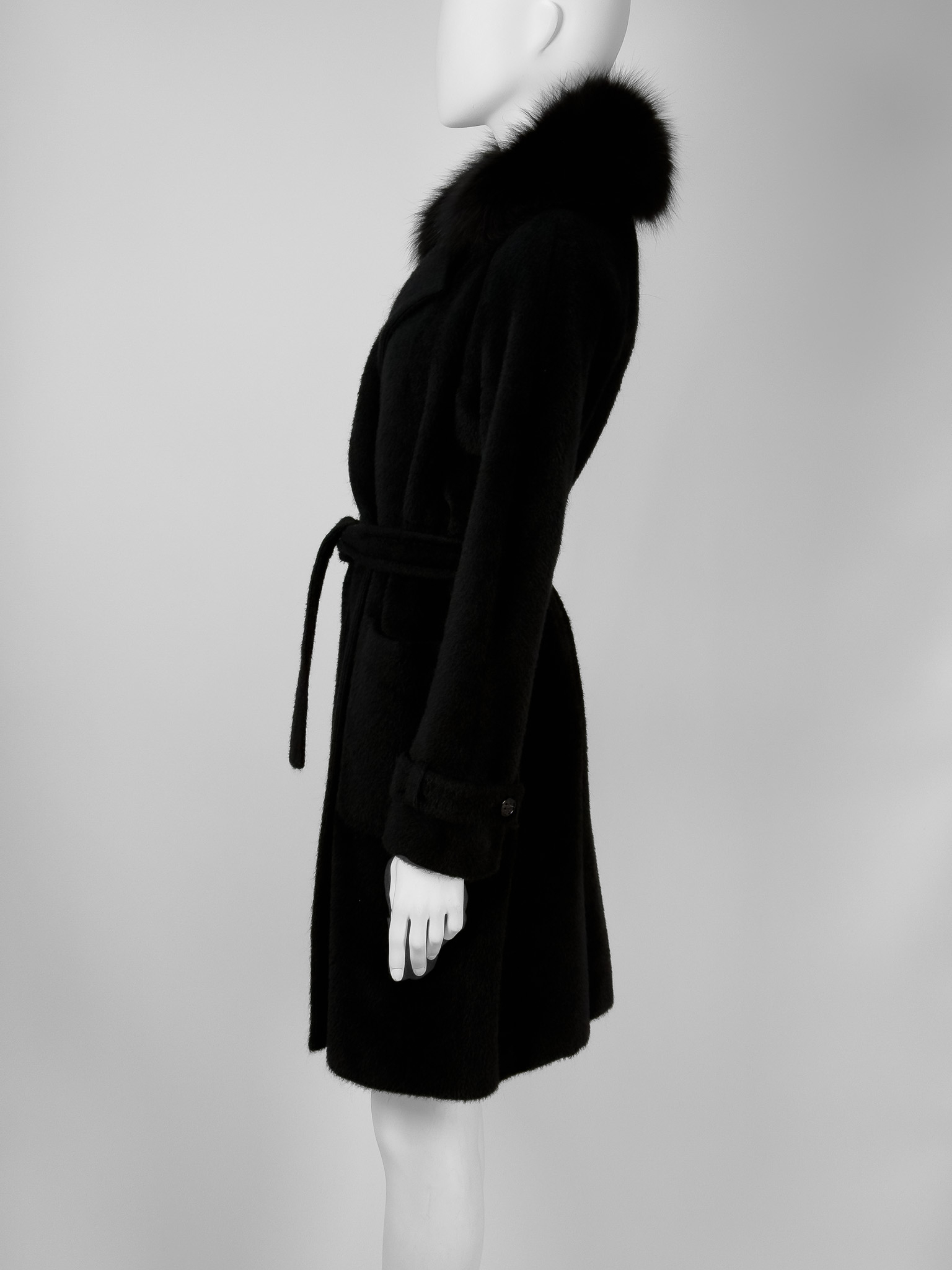 "Czarny, średniej długości płaszcz z podszewką oraz futrzanym kołnierzem. Możliwość przewiązania paskiem, dwie duże kieszenie z przodu. Skład: 70% alpaka, 30 % wełna. Wymiary: ramiona 49 cm, szerokość w pasie 48 cm, długość 102 cm."