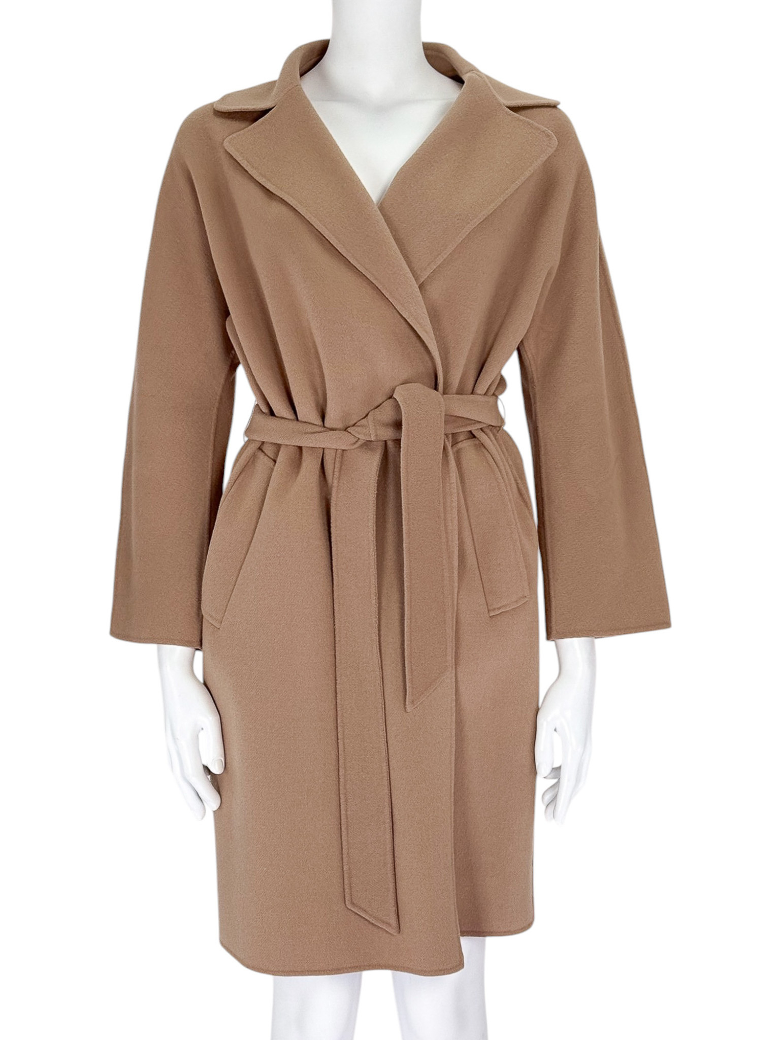 "Camelowy płaszcz WEEKEND MaxMara, wiązany w talii paskiem. Długość za kolano. Rozmiar I/36. Skład: 90% wełna, 10% poliamid. Wymiary: długość: 95cm, szerokość: 55cm"