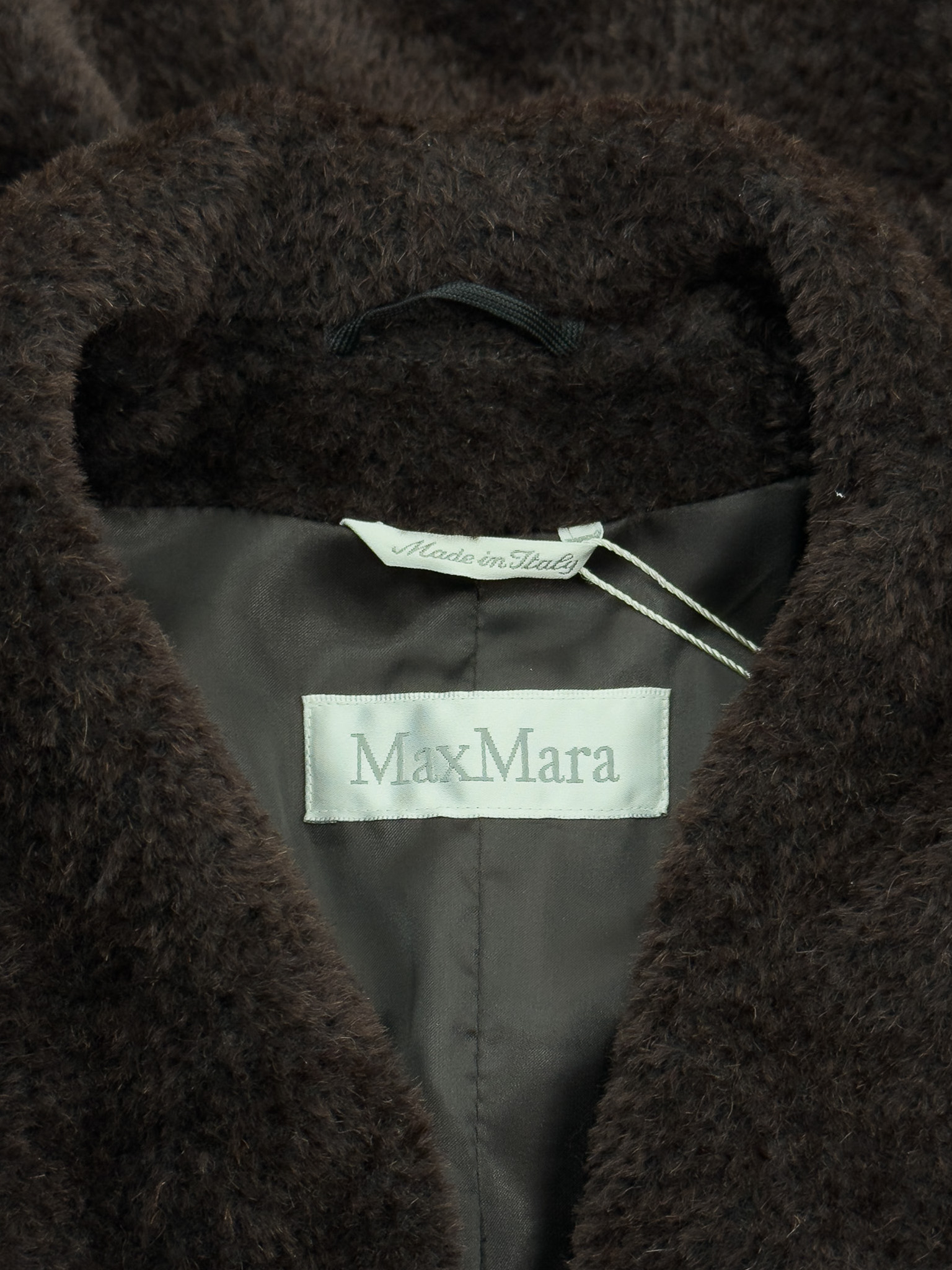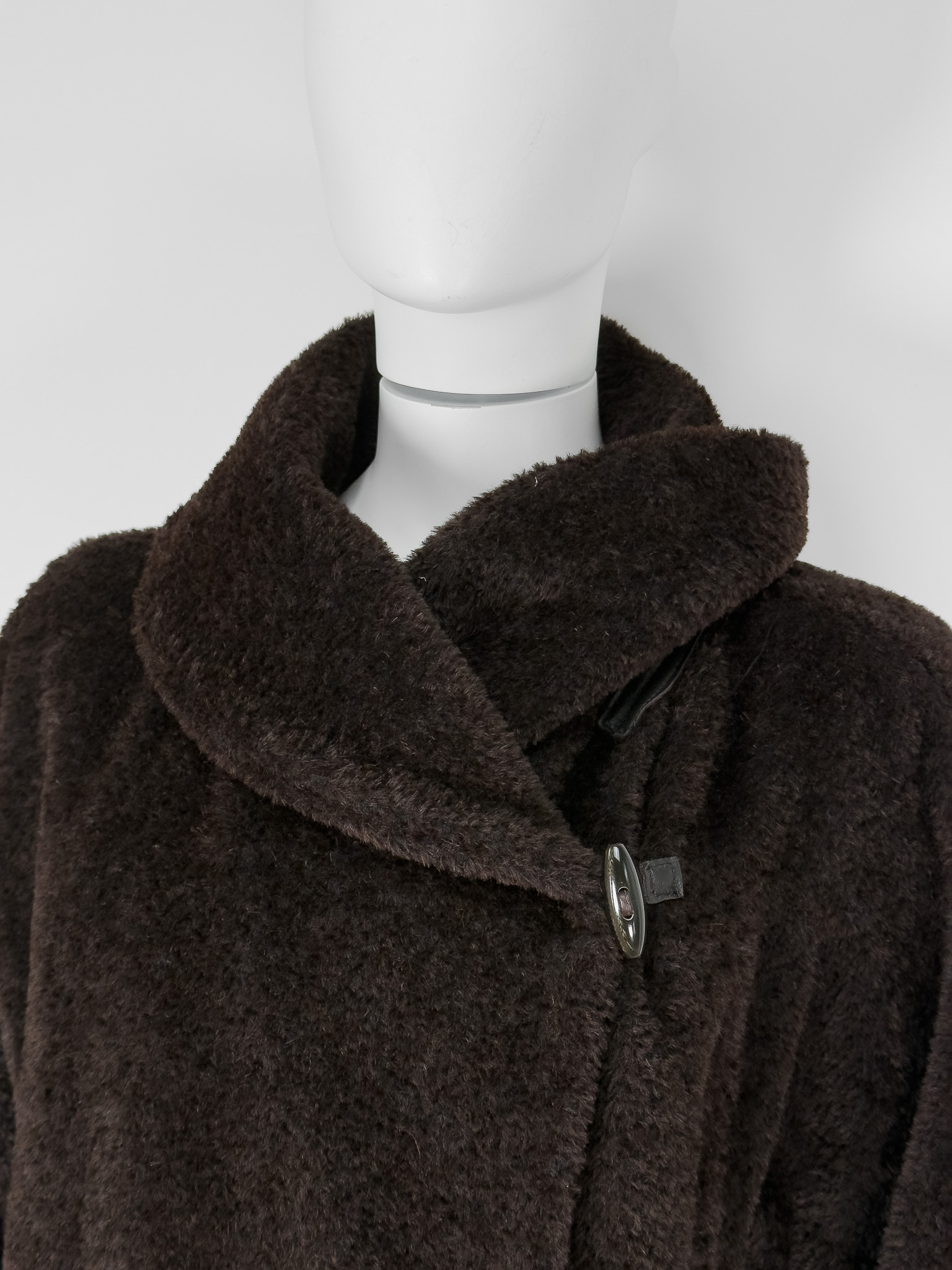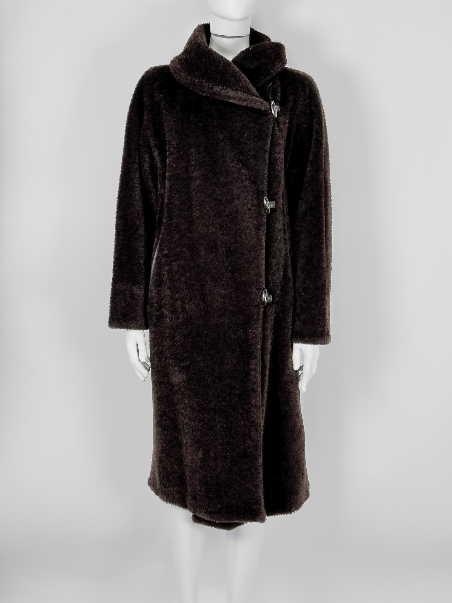 "Brązowy płaszcz zapinany na brązowe drewniane guziki, kołeczki zapinane na haftki. Skórzane wykończenie przy kieszeniach. Skład: 56% alpaka, 44% wełna. Rozmiar z metki IT 42."