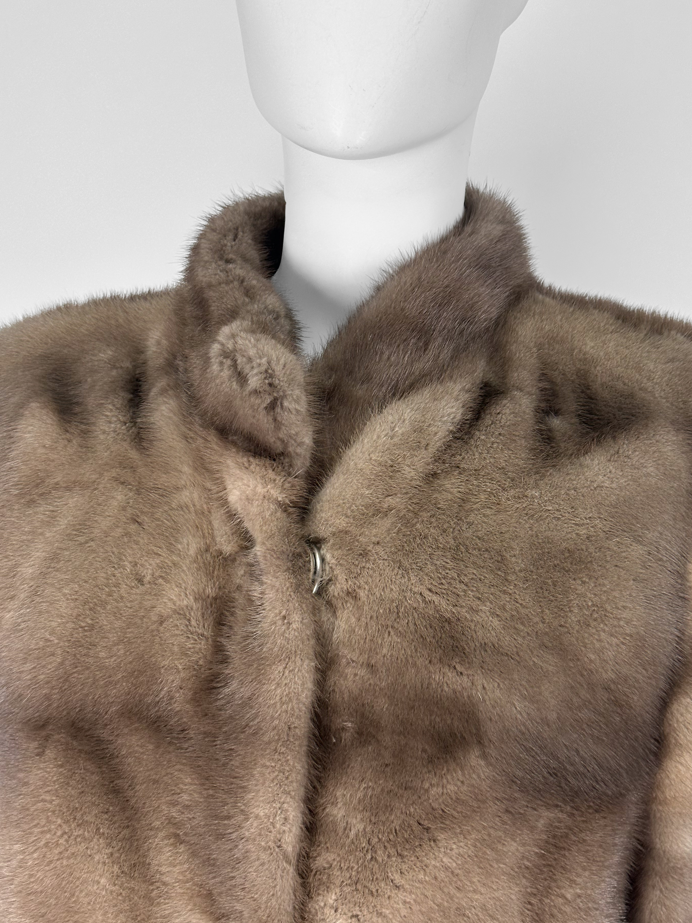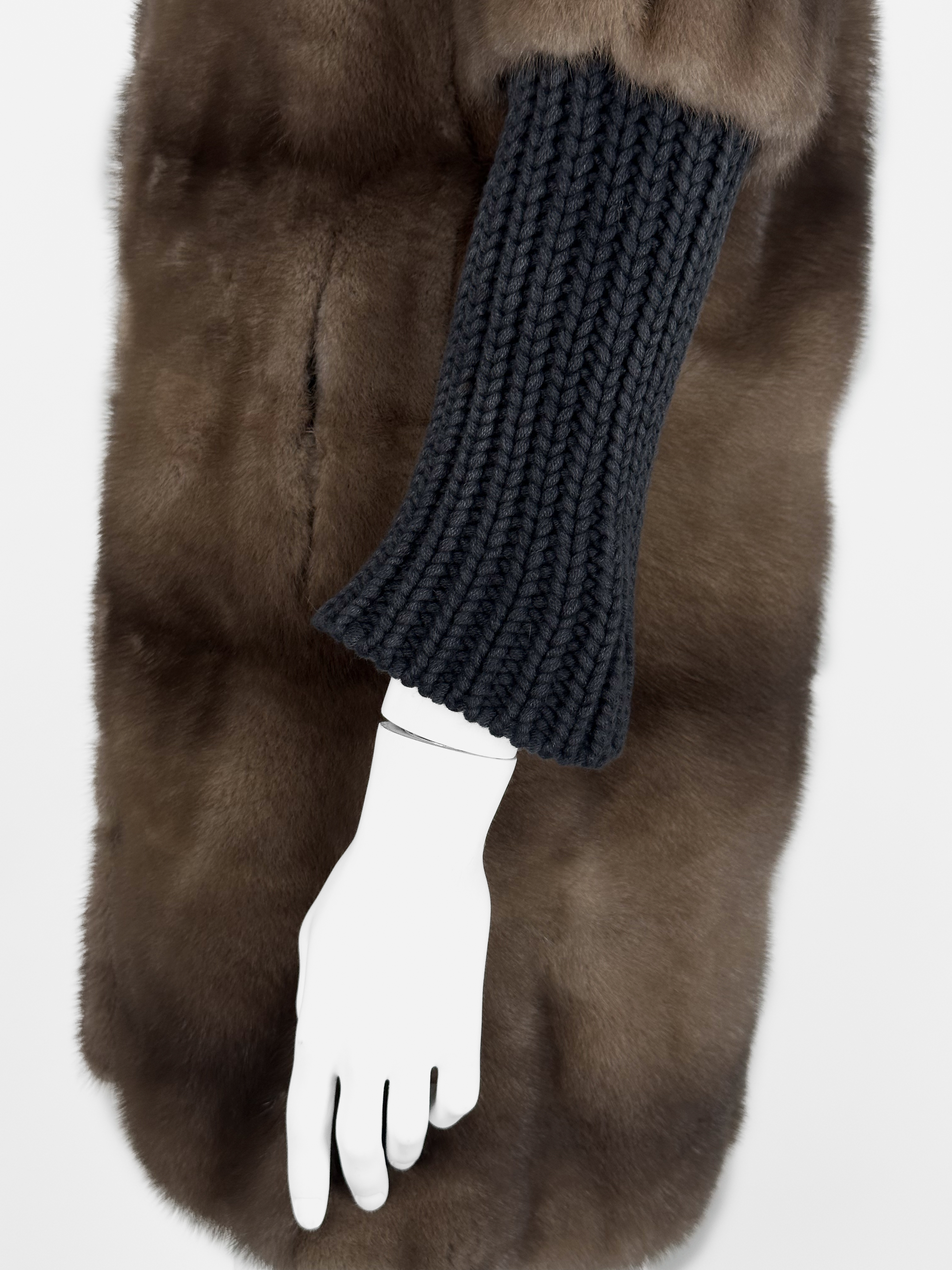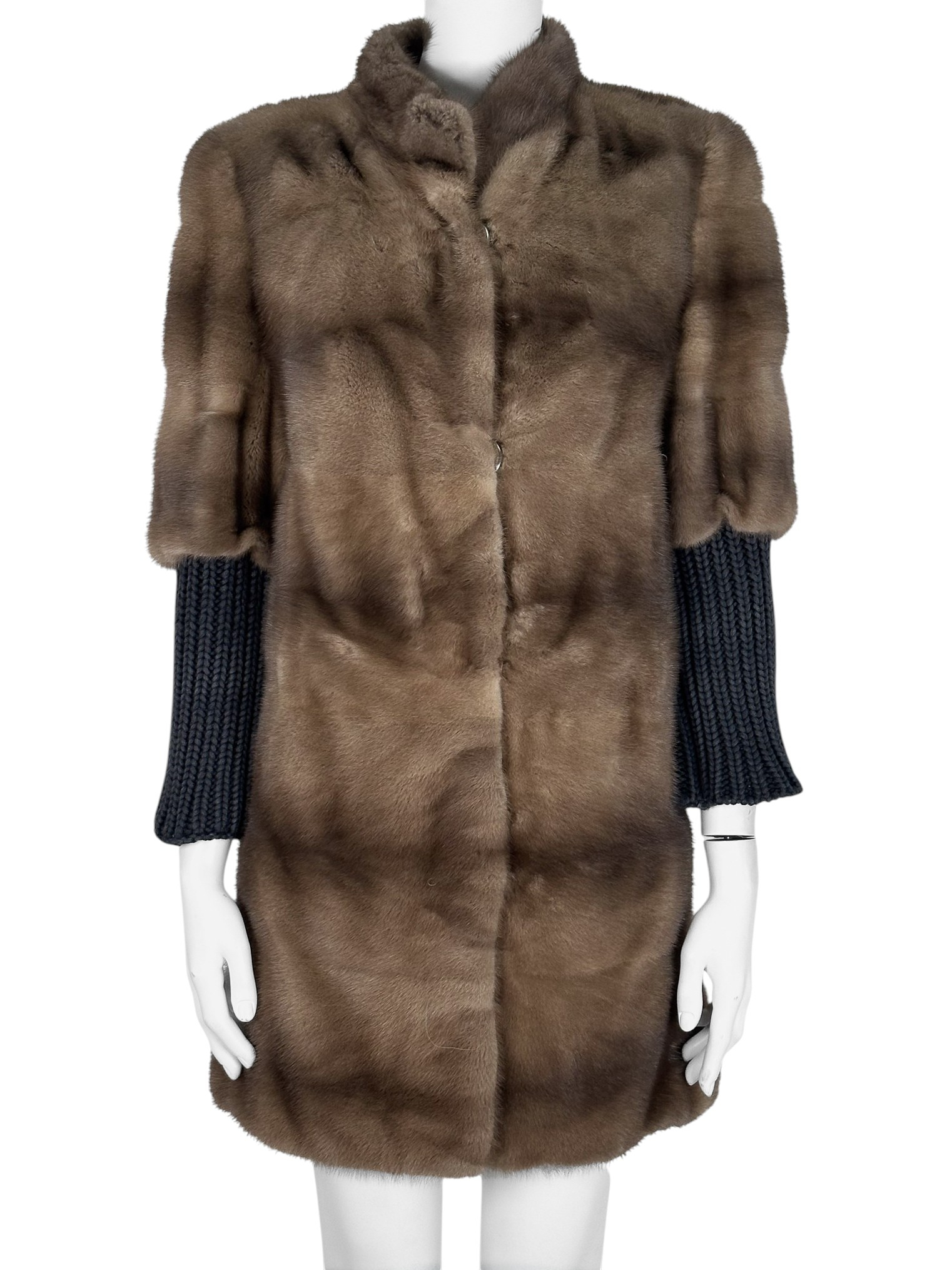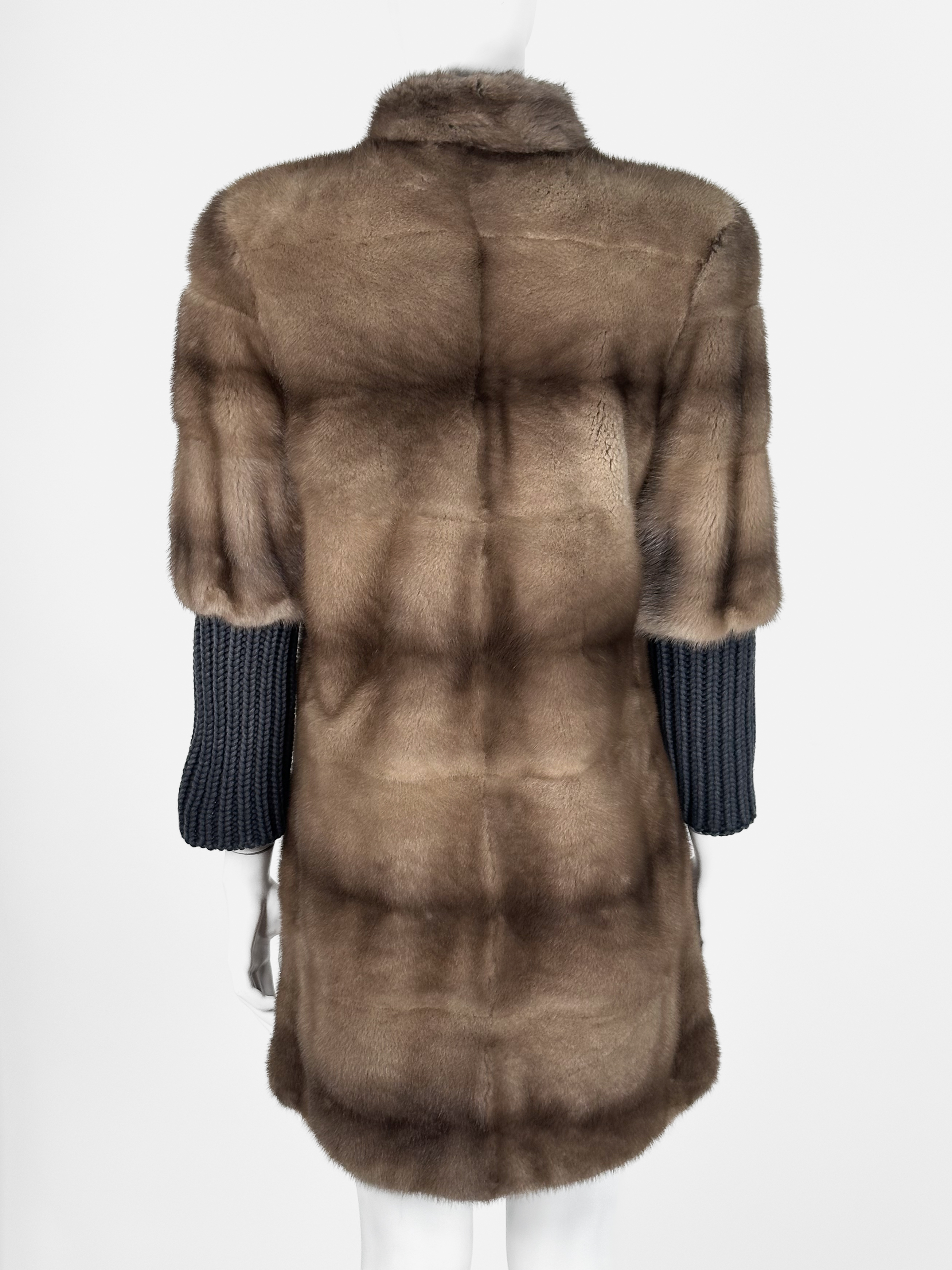 "Szarobeżowy płaszcz z norki zapinany na cztery zapięcia, rękawy wykończone elementem sweterkowym w kolorze szarym.