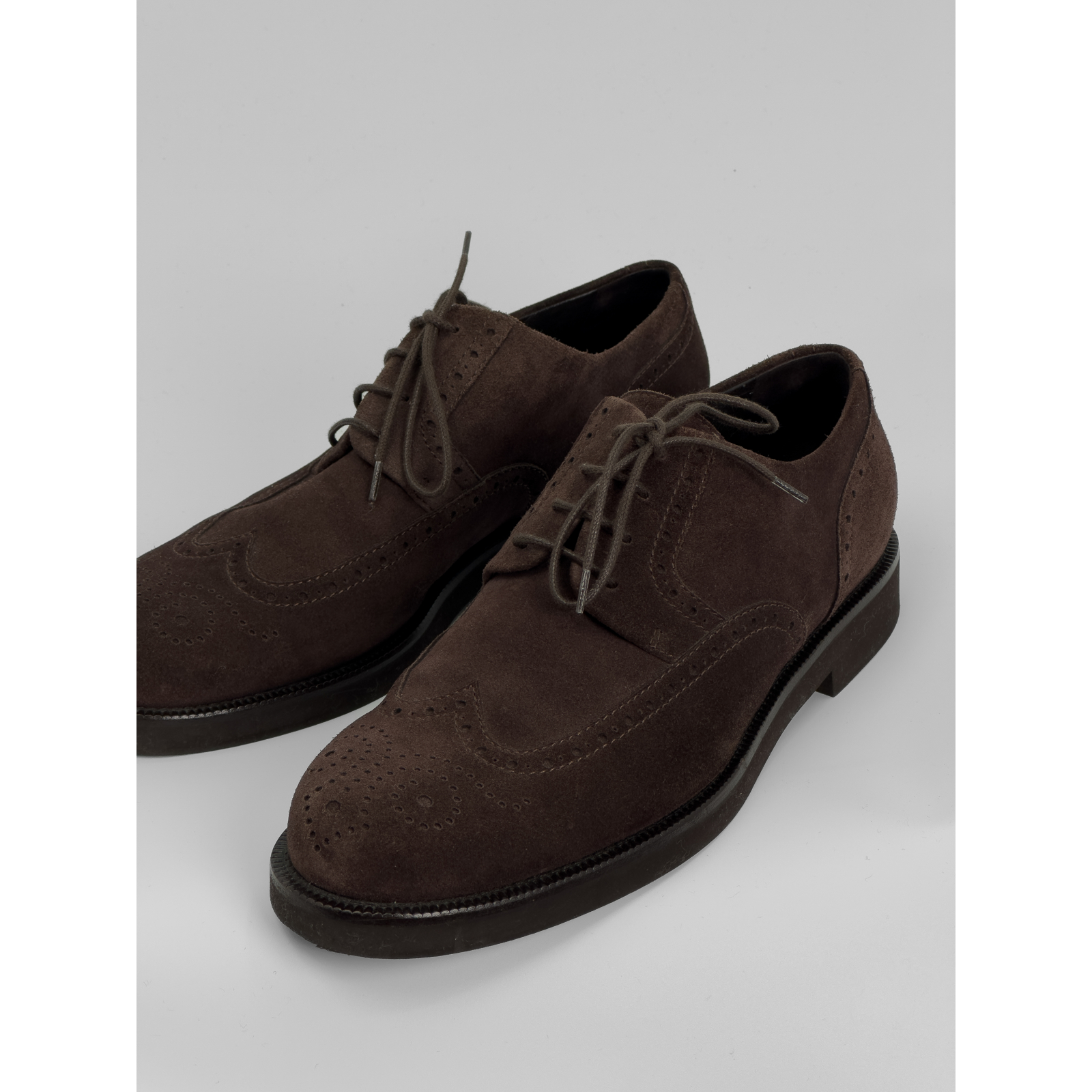 "Czekoladowe zamszowe półbuty ozdobione ażurowym wzorem, sznurowane, migdałowe noski, niski obcas, używane. Stan bardzo dobry, delikatne przetarcia na noskach oraz podeszwie. Rozmiar 38,5."