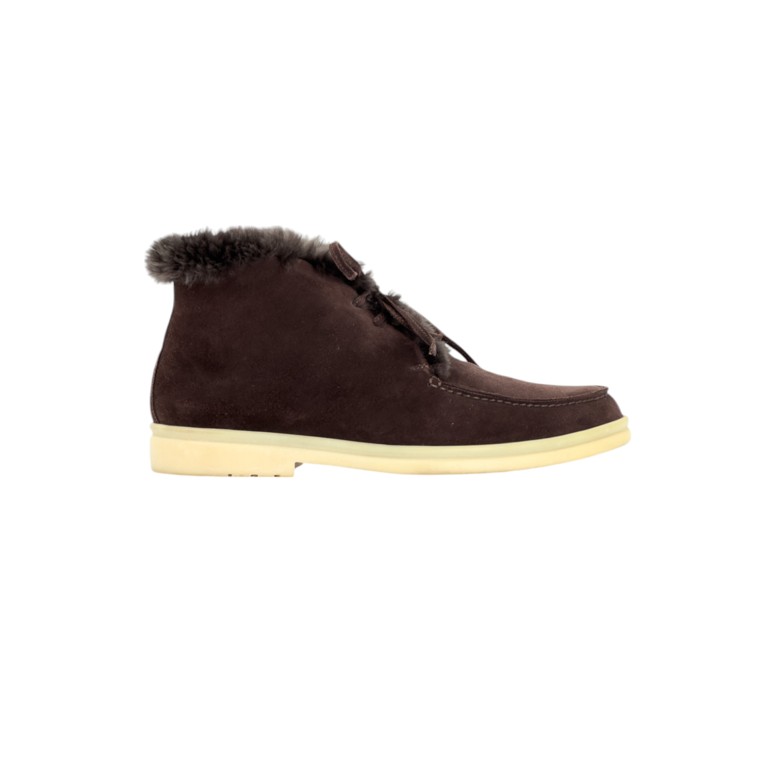 "Brązowo-bordowe buty za kostkę , wykonane ze skóry zamszowej, wewnątrz miękkie futro wystające na zewnątrz, sznurówki wykonane z zamszowej skóry, podeszwy w odcieniach żółci. Rozmiar 39,5. W zestawie z workiem przeciwkurzowym."