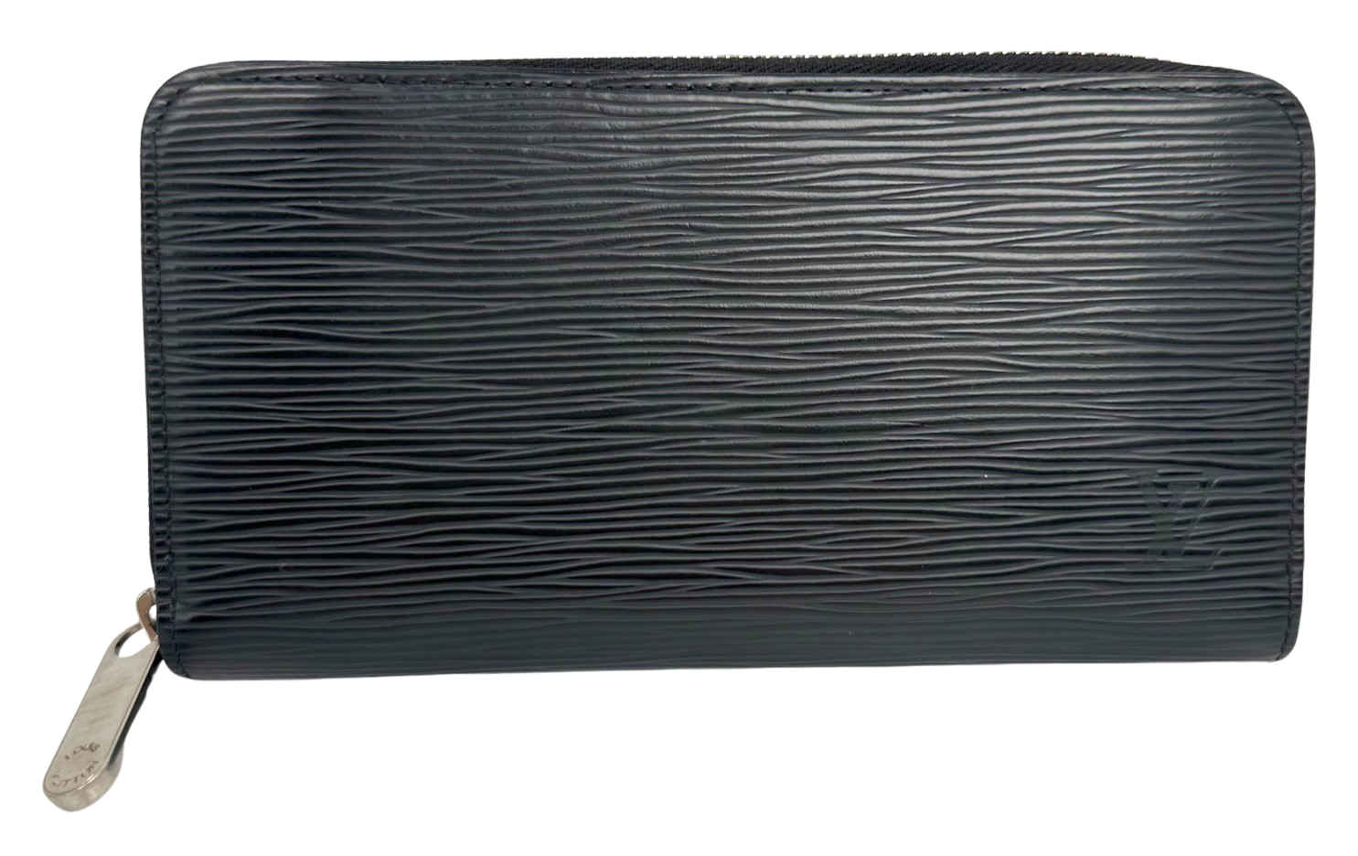 "czarny portfel z wytłaczanej skóry typu Epi, zapinany na suwak, stan idealny, pudełko w komplecie. Wymiary: szer. 20 cm, wys. 10 cm."