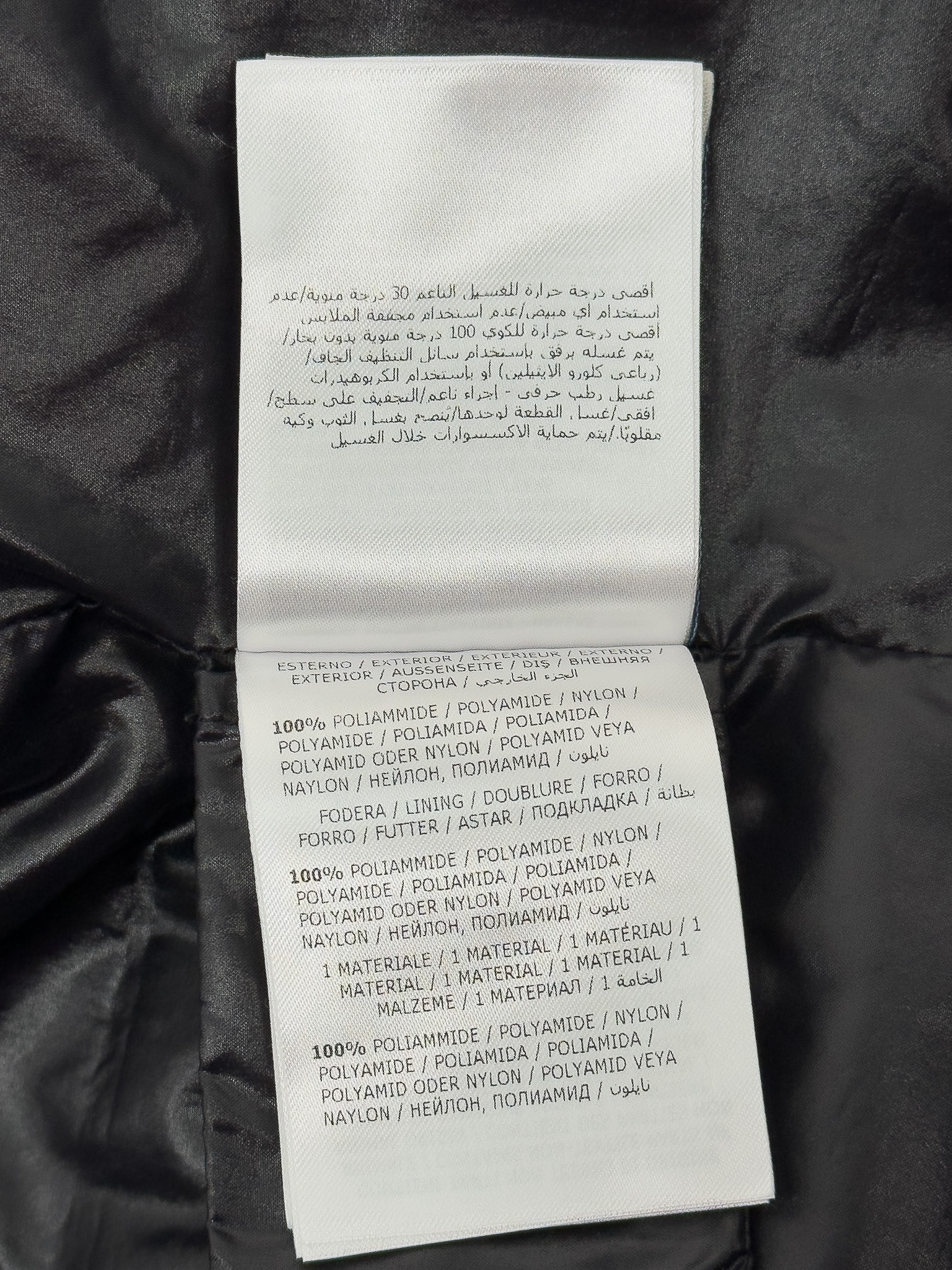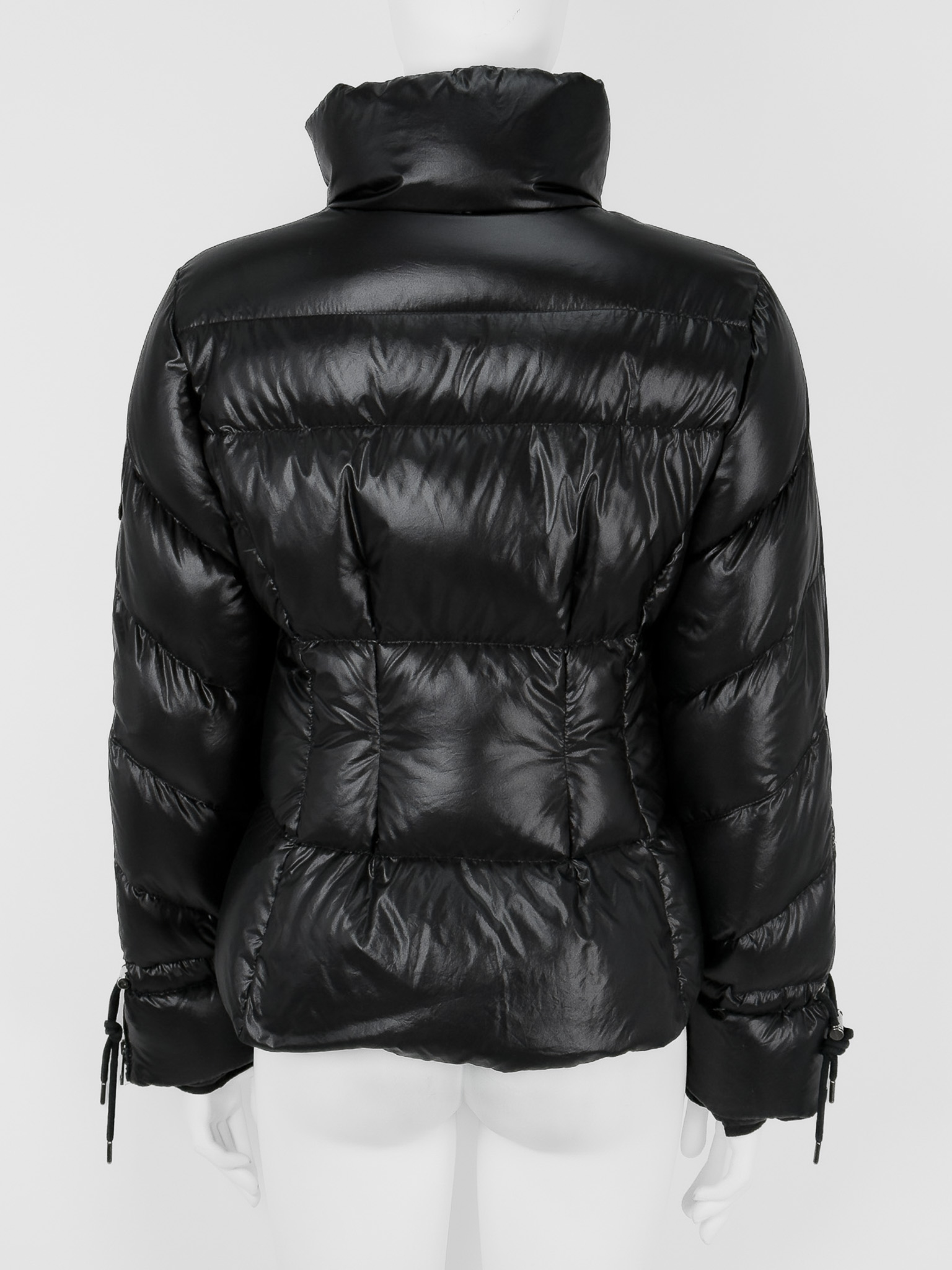 "Czarna puchowa kurtka, lekko taliowana, posiada zamki po bokach rękawów oraz ściągacze, czarne logo marki na rękawie, stójka, zapinana na dwa suwaki, pikowana, dwie zasuwane kieszenie po bokach. Rozmiar z metki S. Stan bardzo dobry. Skład: 100% poliamid; wypełnienie: 90% puch, 10% pióra. Wymiary: szerokość mierzona od pachy do pachy 51cm, długość całkowita 60cm."