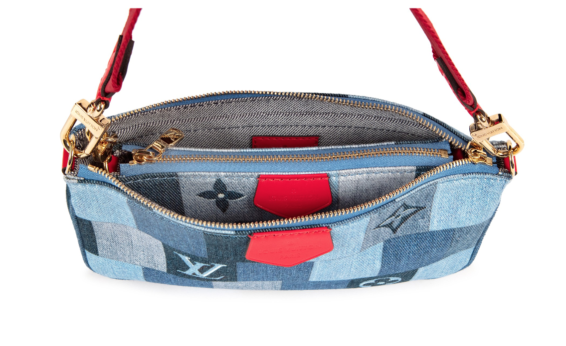 "Denim Damier Monogram Patchwork Multi Pochette, jeansowa torebka w róznych odcieniach niebieskiego, czerwony materiałowy pasek crossbody, złote okucia. Worek przeciwkurzowy w komplecie. Stan idealny. Kolekcja z 2020 r, limitowana, swtorzona z okazji Chińskiego Nowego roku. Potwierdzenie zakupu w komplecie."