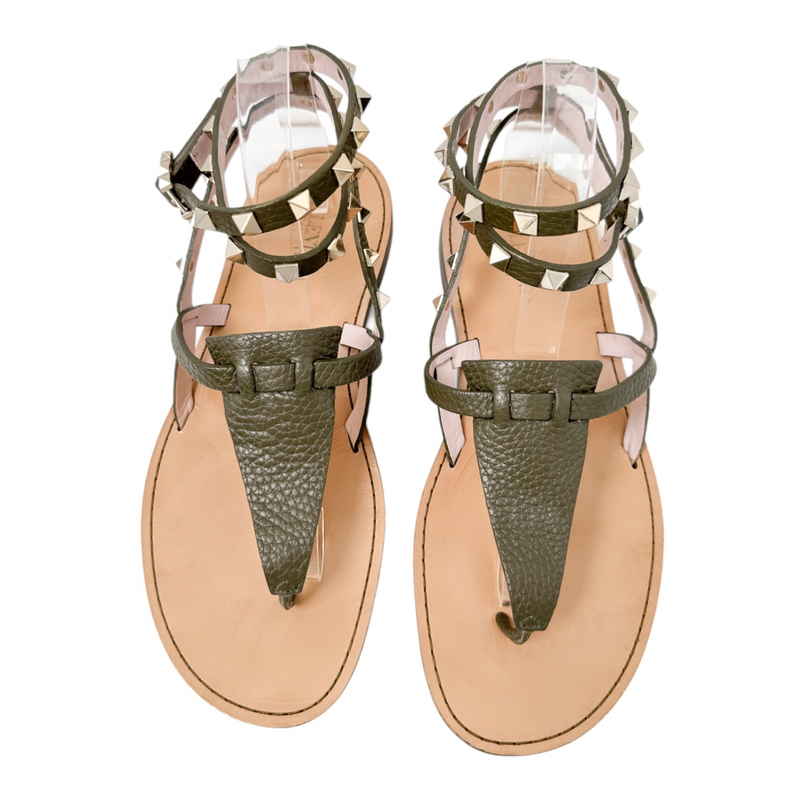 "Skórzane sandały w kolorze khaki, japonki, zapinany pasek wokół kostki ozdobiony złotymi ćwiekami, miękka skóra, cielista wkładka, zaokrąglone noski, niski obcas, odkryta pięta, używane. Stan bardzo dobry, delikatnie wytarta i przybrudzona podeszwa."