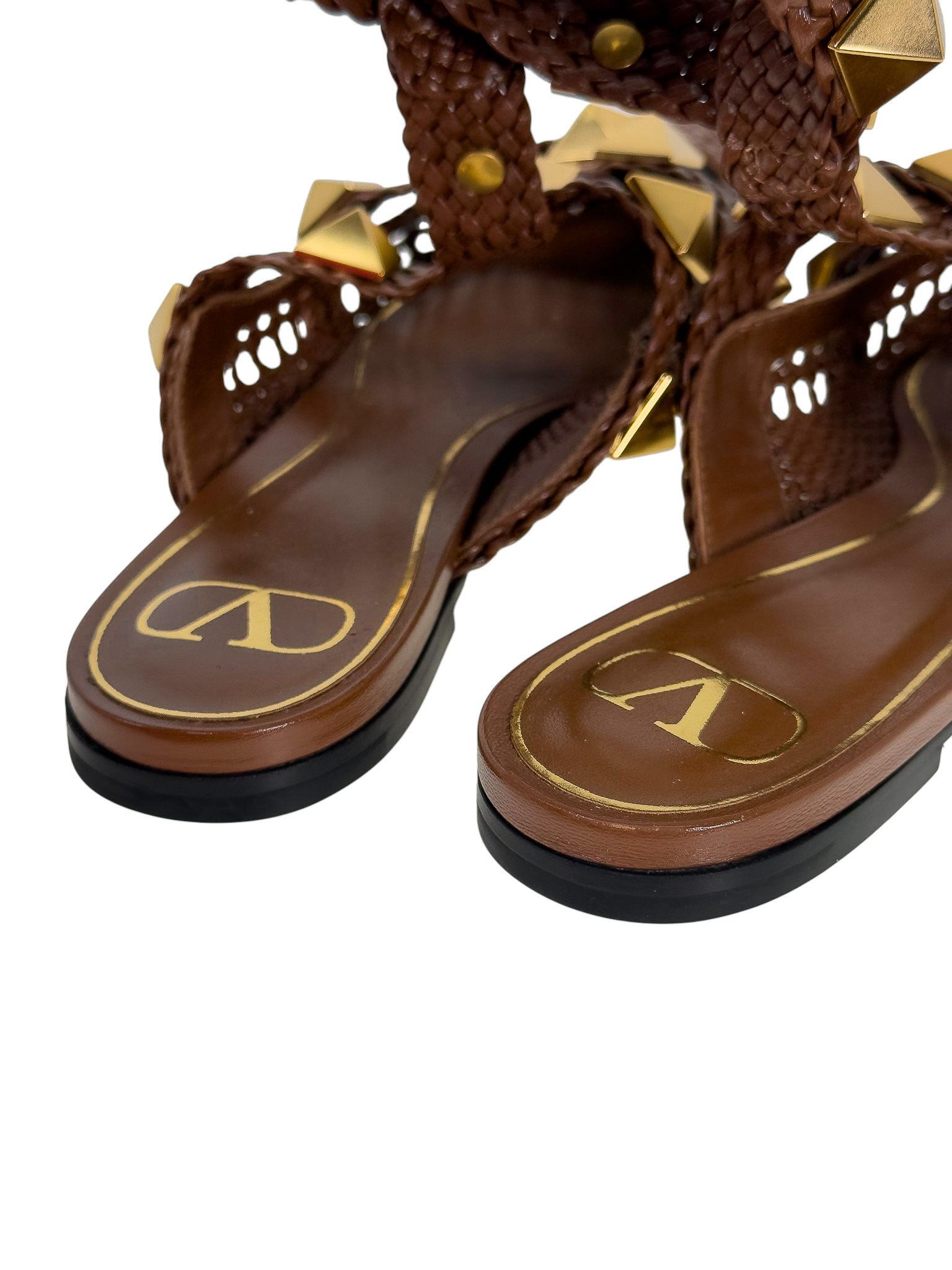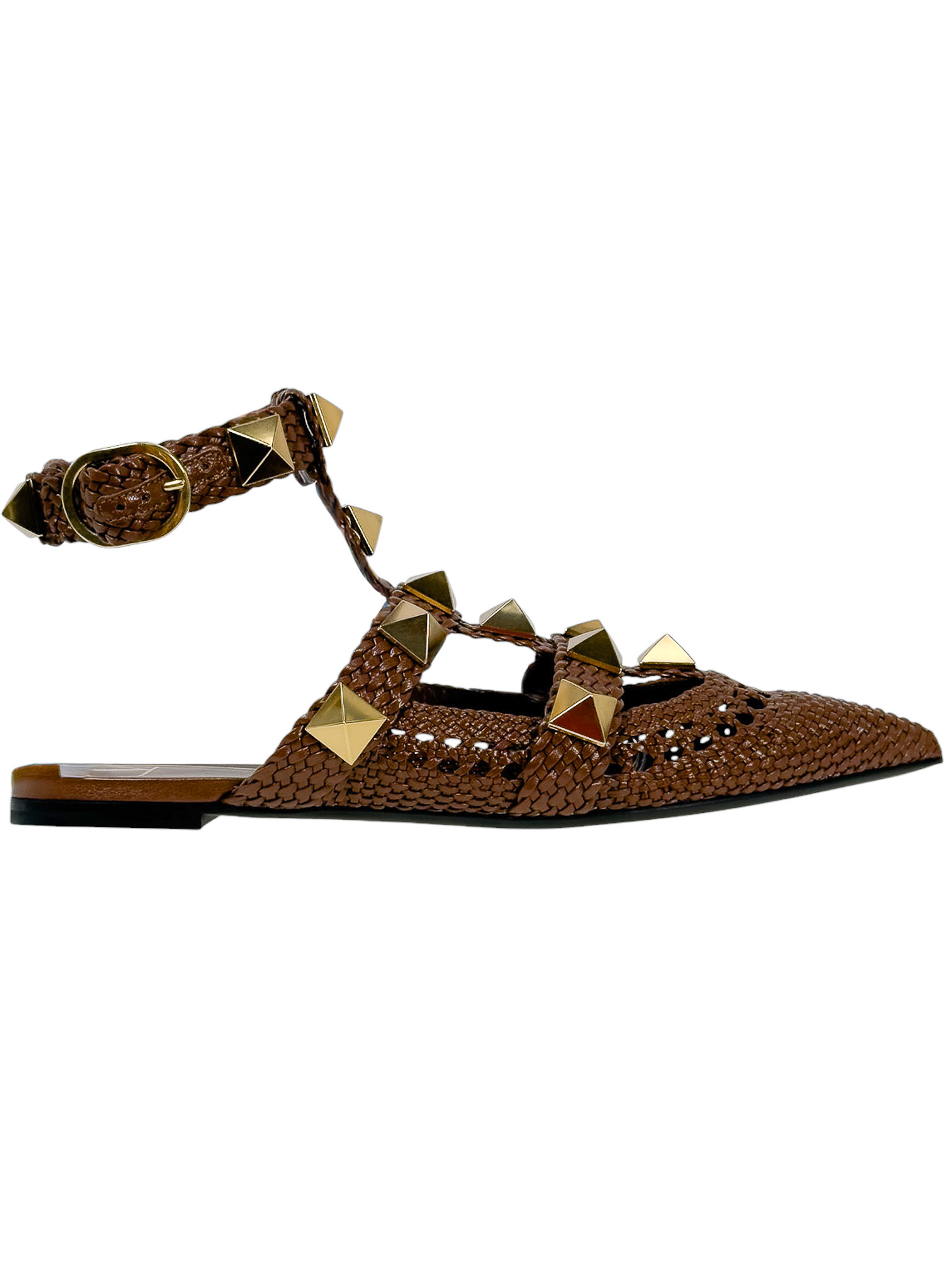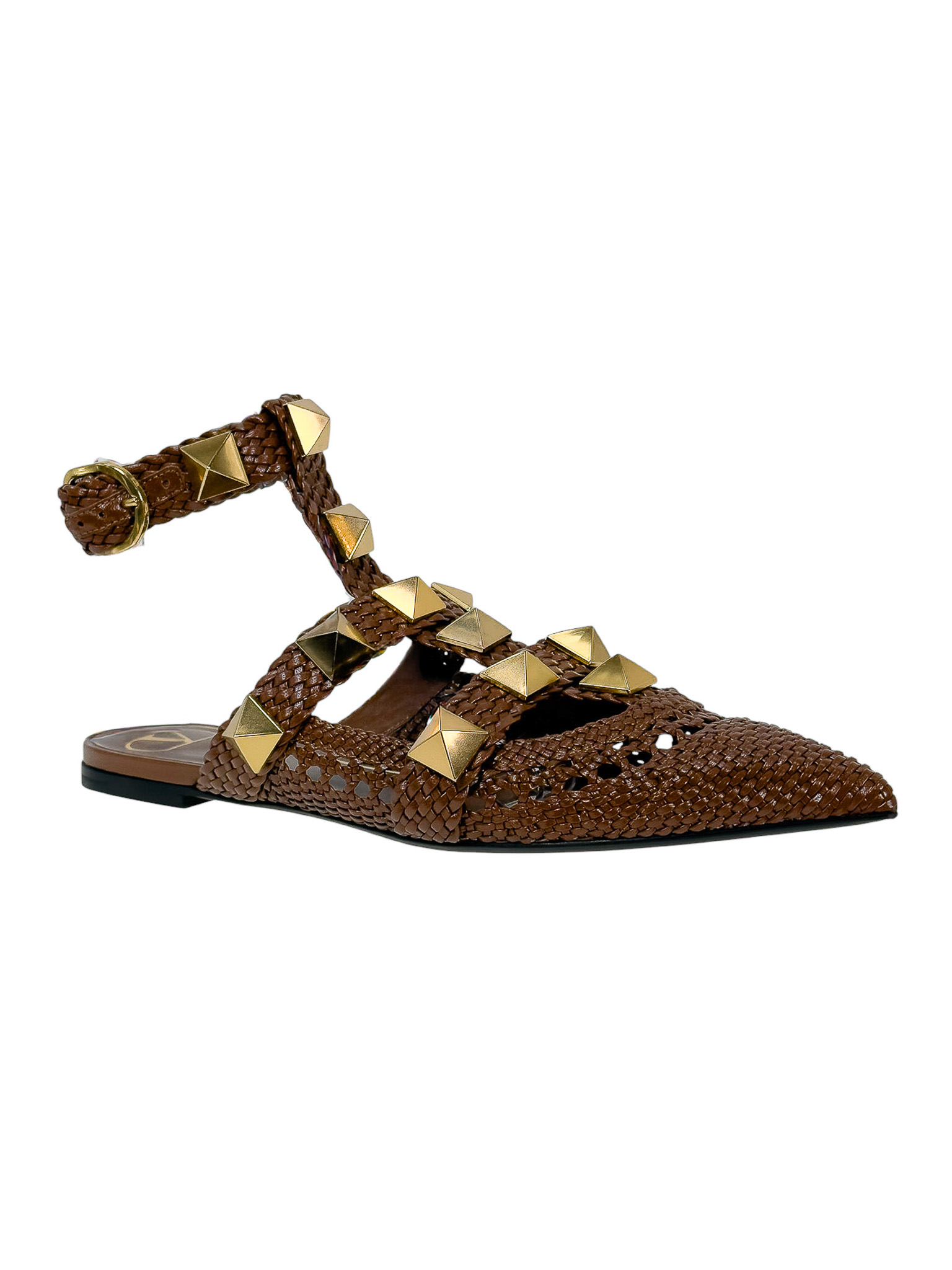 "Brązowe skórzane sandały wykonane z plecionej skóry, ozdobione dużymi złotymi ćwiekami, nosek w szpic, miejscami ażurowe, odkryta pięta, regulowany pasek wokół kostki, niski obcas. Stan idealny, minimalne przetarcia na podeszwie. Rozmiar 40,5."