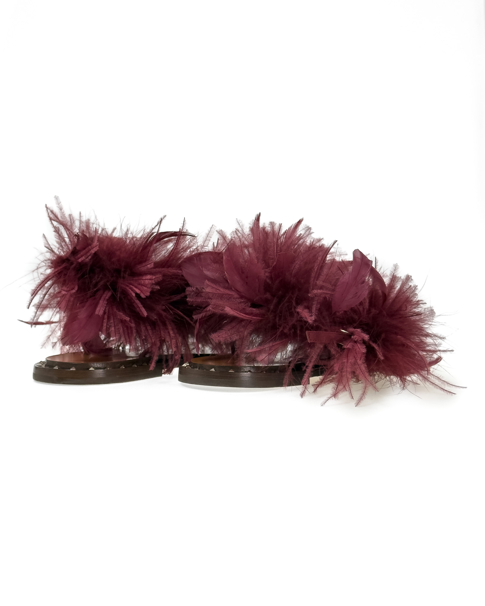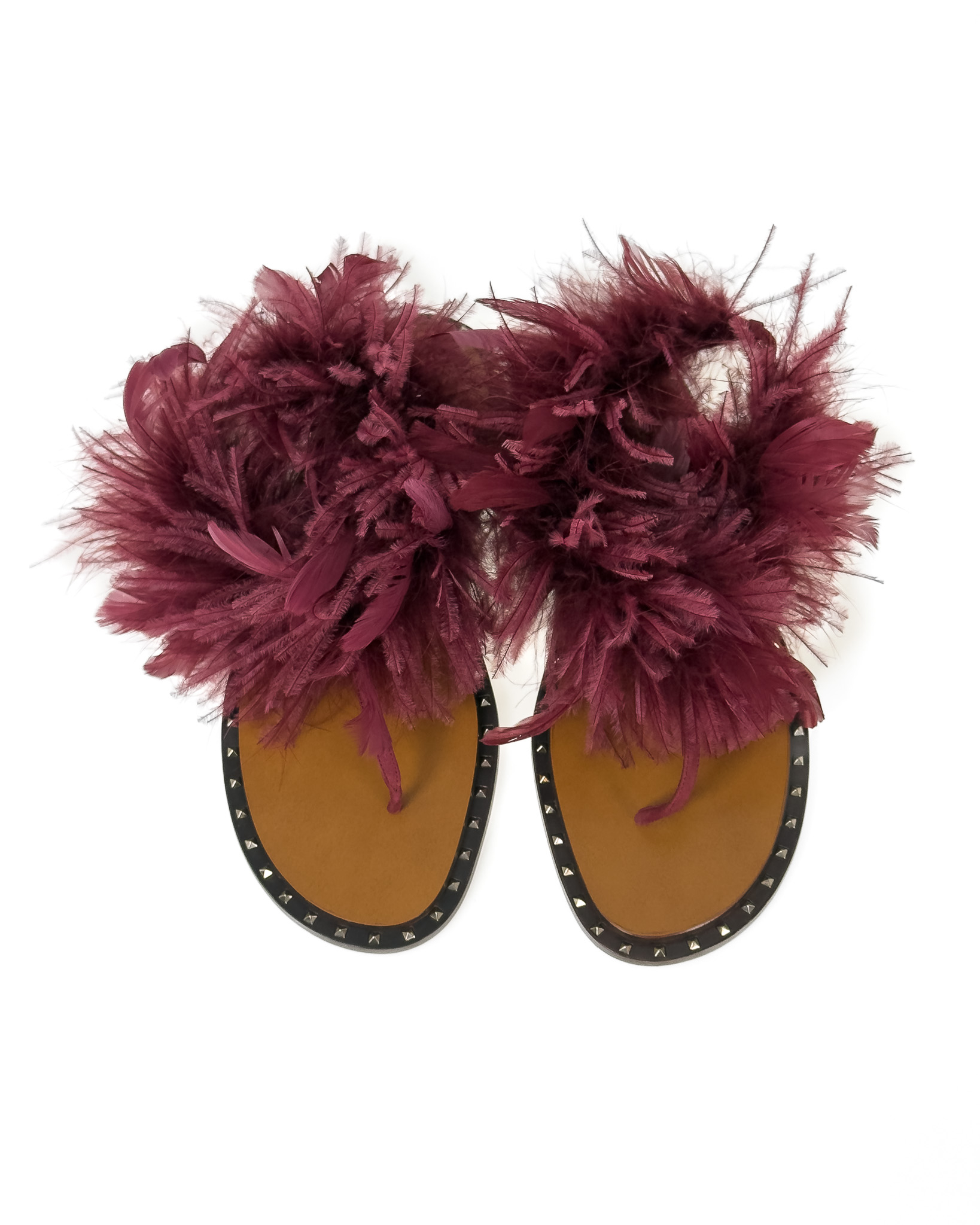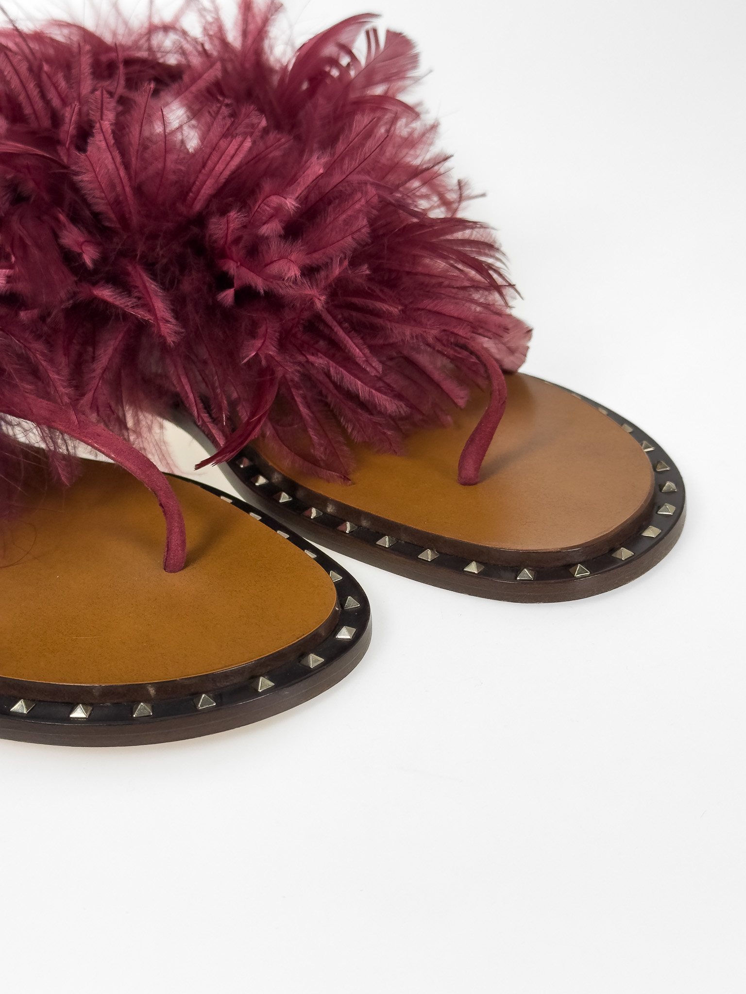 "Bordowe sandały ozdobione piórami na paskach oraz złotymi ćwiekami, typu japonki, odkryte palce oraz pięta, zapinane w bocznej części na sprzączkę, niski obcas, zaokrąglone noski, camelowa wkładka. Stan nowe. Rozmiar 40."