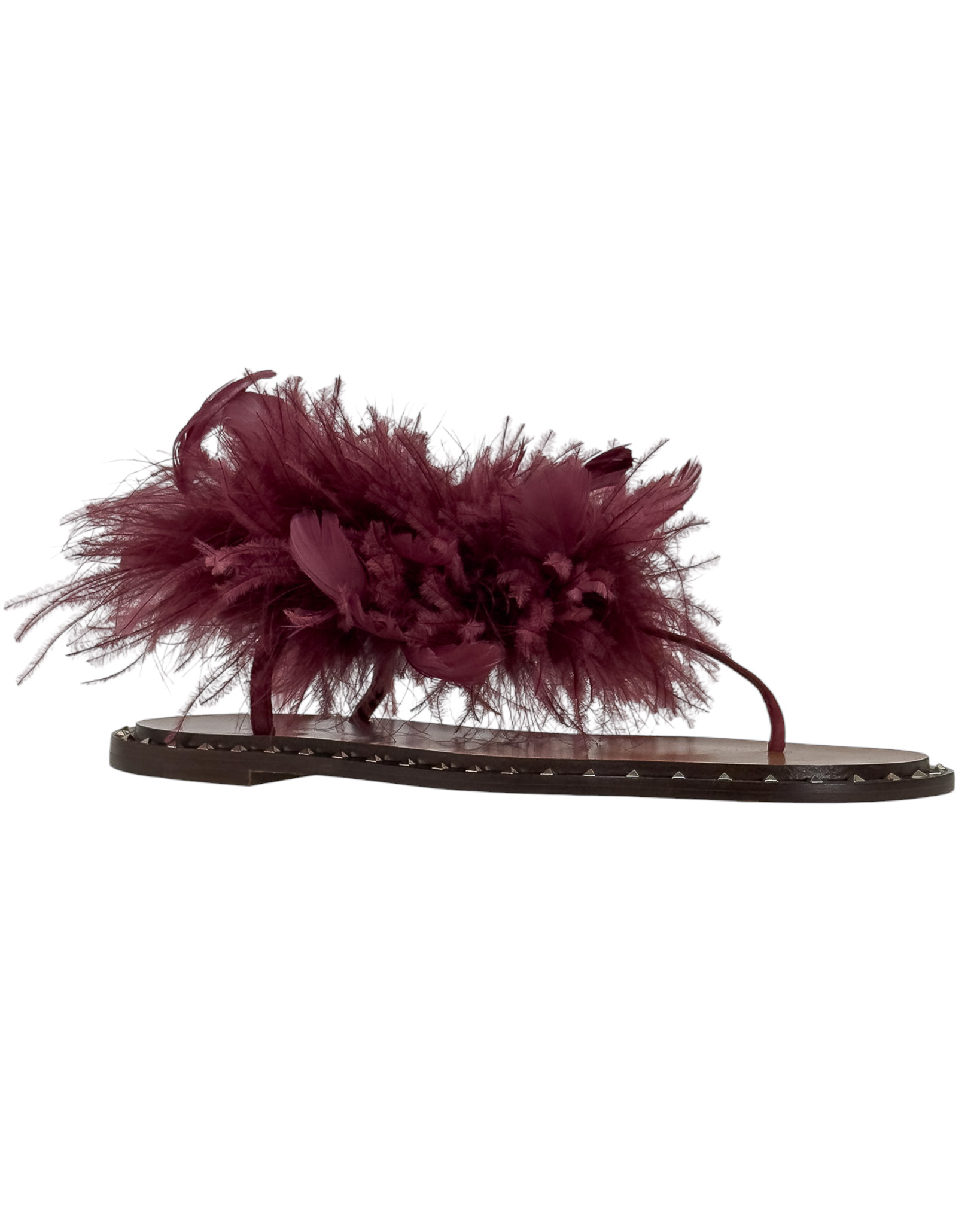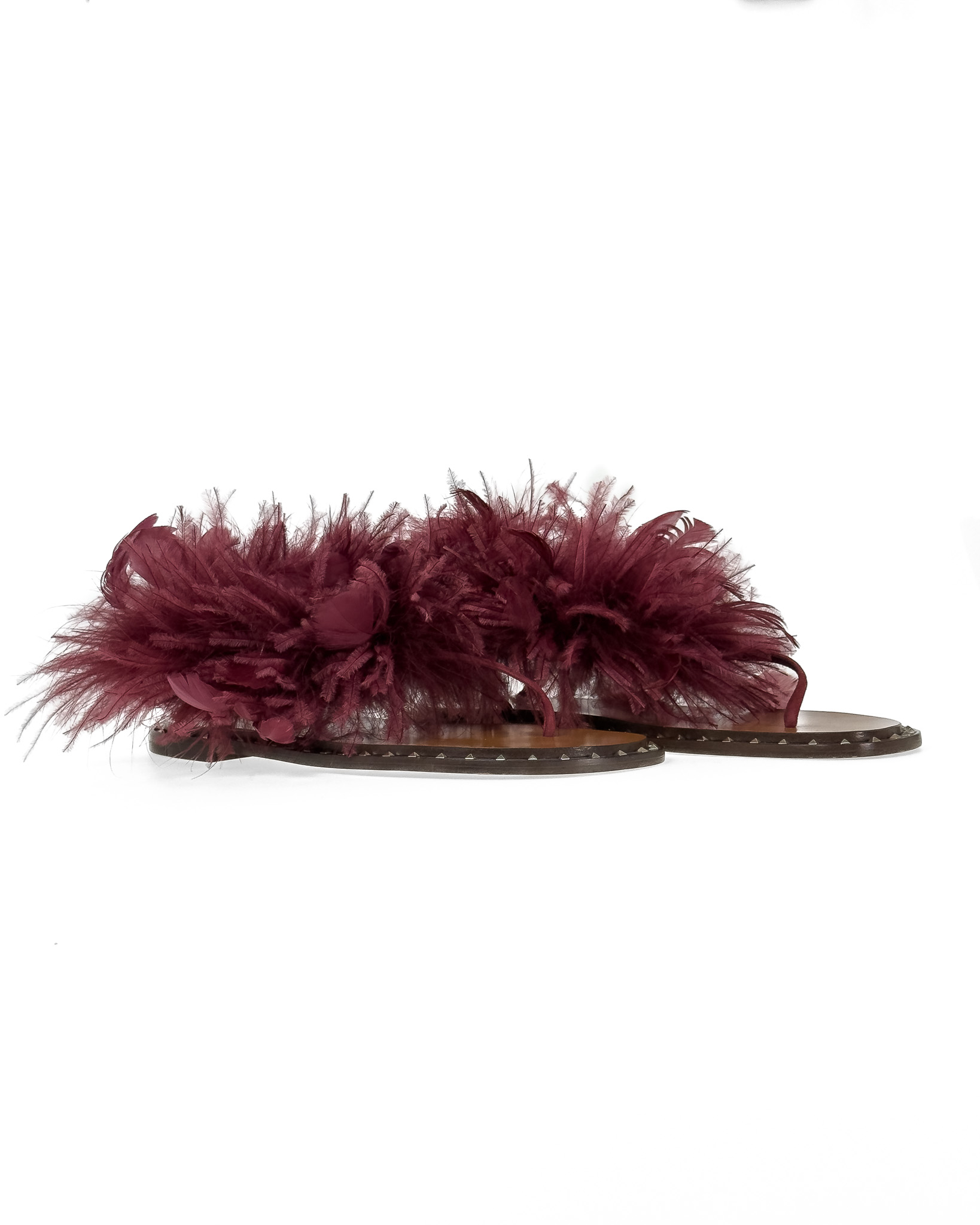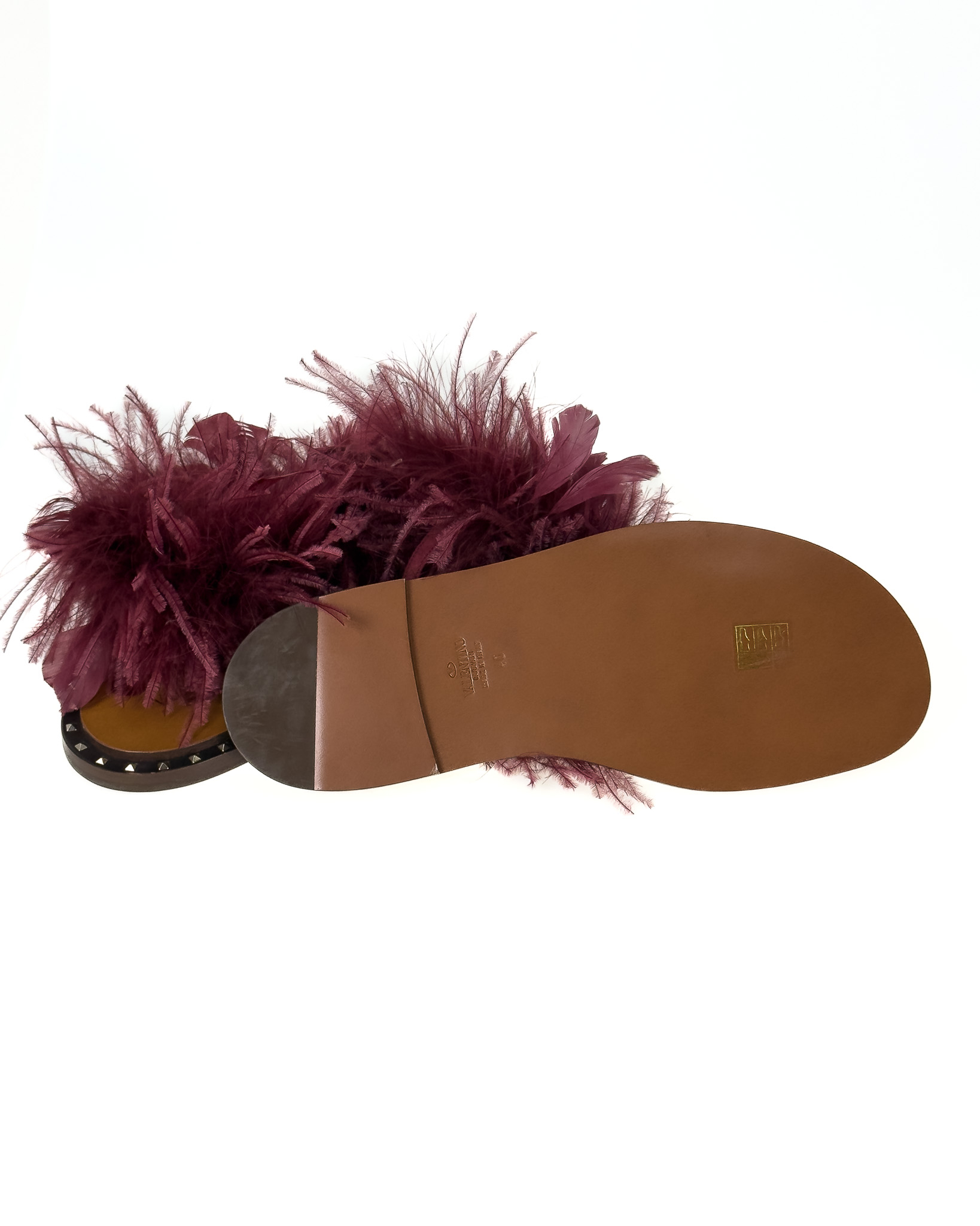 "Bordowe sandały ozdobione piórami na paskach oraz złotymi ćwiekami, typu japonki, odkryte palce oraz pięta, zapinane w bocznej części na sprzączkę, niski obcas, zaokrąglone noski, camelowa wkładka. Stan nowe. Rozmiar 40."