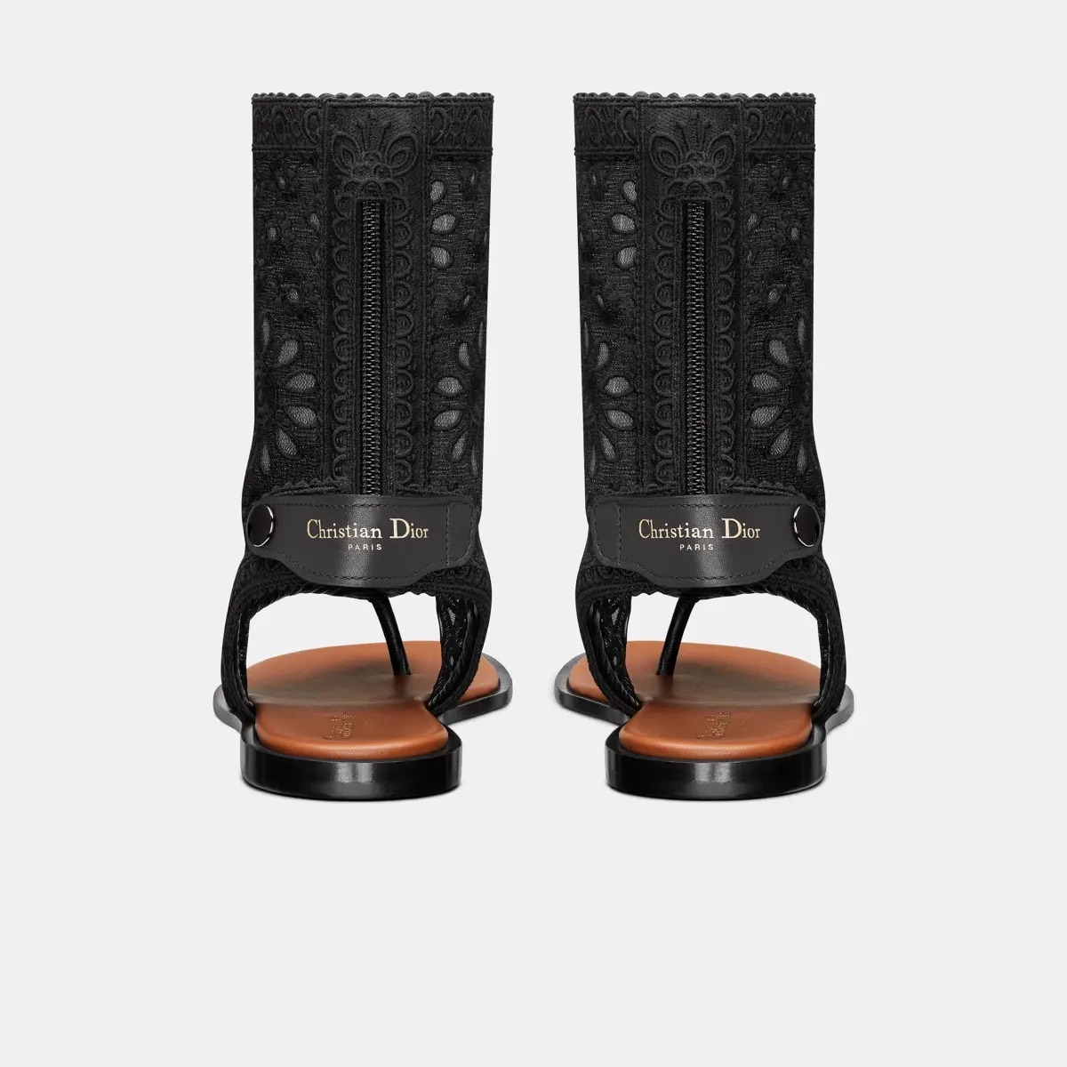 "Czarne sandały ozdobione transparentnym wzorem o motywie kwiatowym, typu japonki, pasek ze złotym logo marki zapinany na zatrzask w tylnej części, sznurowane na przodzie, suwak nad piętą, wyższa cholewka, zaokrąglone noski, brązowa skórzana wkładka. Stan nowe, posiadają niewielkie zadrapanie na wkładce lewego buta. Rozmiar 40."