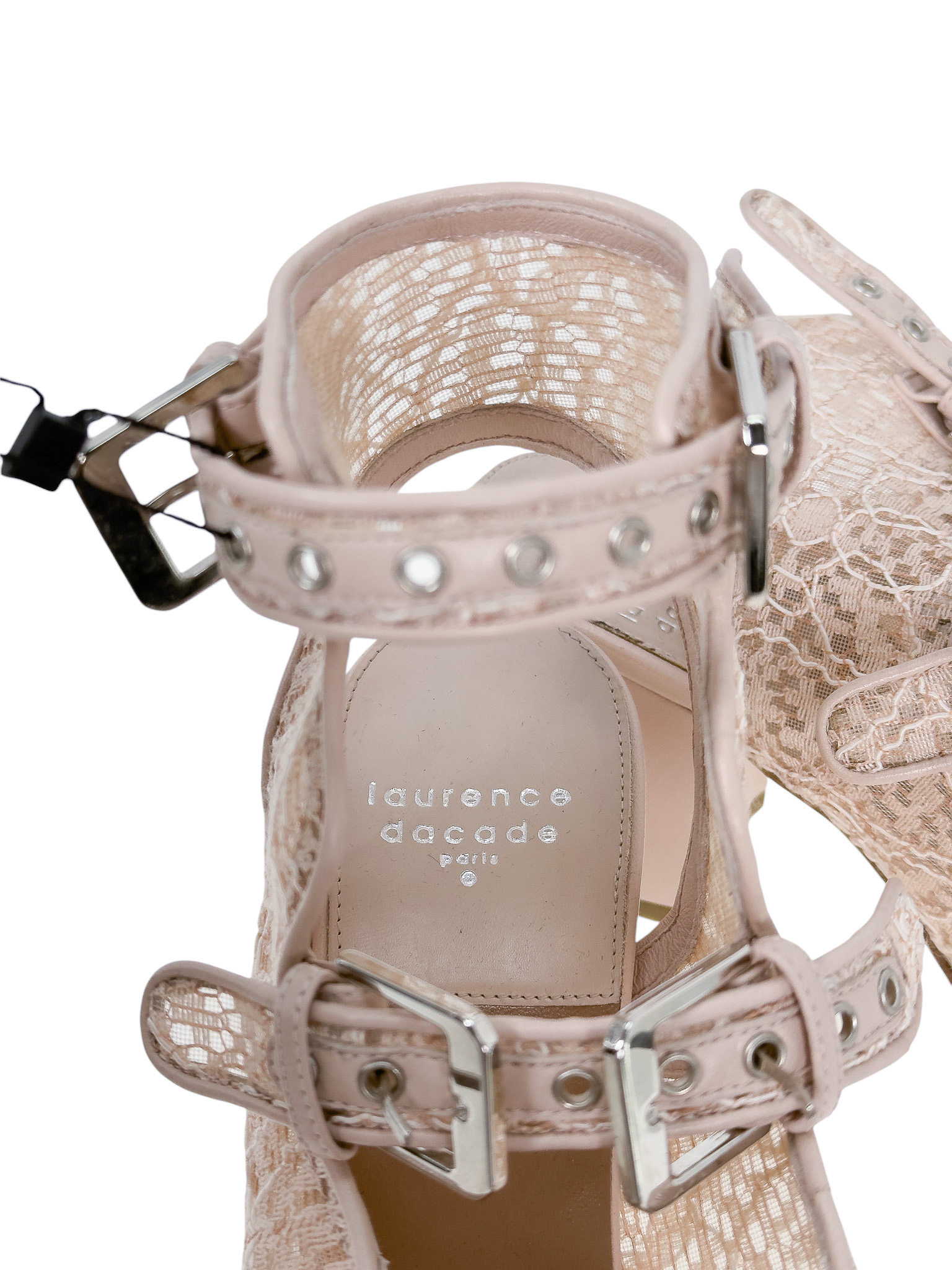 "Sandały na obcasie w kolorze pudrowego różu, ozdobione transparentną koronką, delikatnie zaokrąglone noski, wyższa cholewka, dwa regulowane paski wykończone srebrnymi sprzączkami na przodzie, odkryte palce oraz pięta, obcas klocek. Stan nowe z metką. Rozmiar 41, wysokość obcasa 7,5cm."