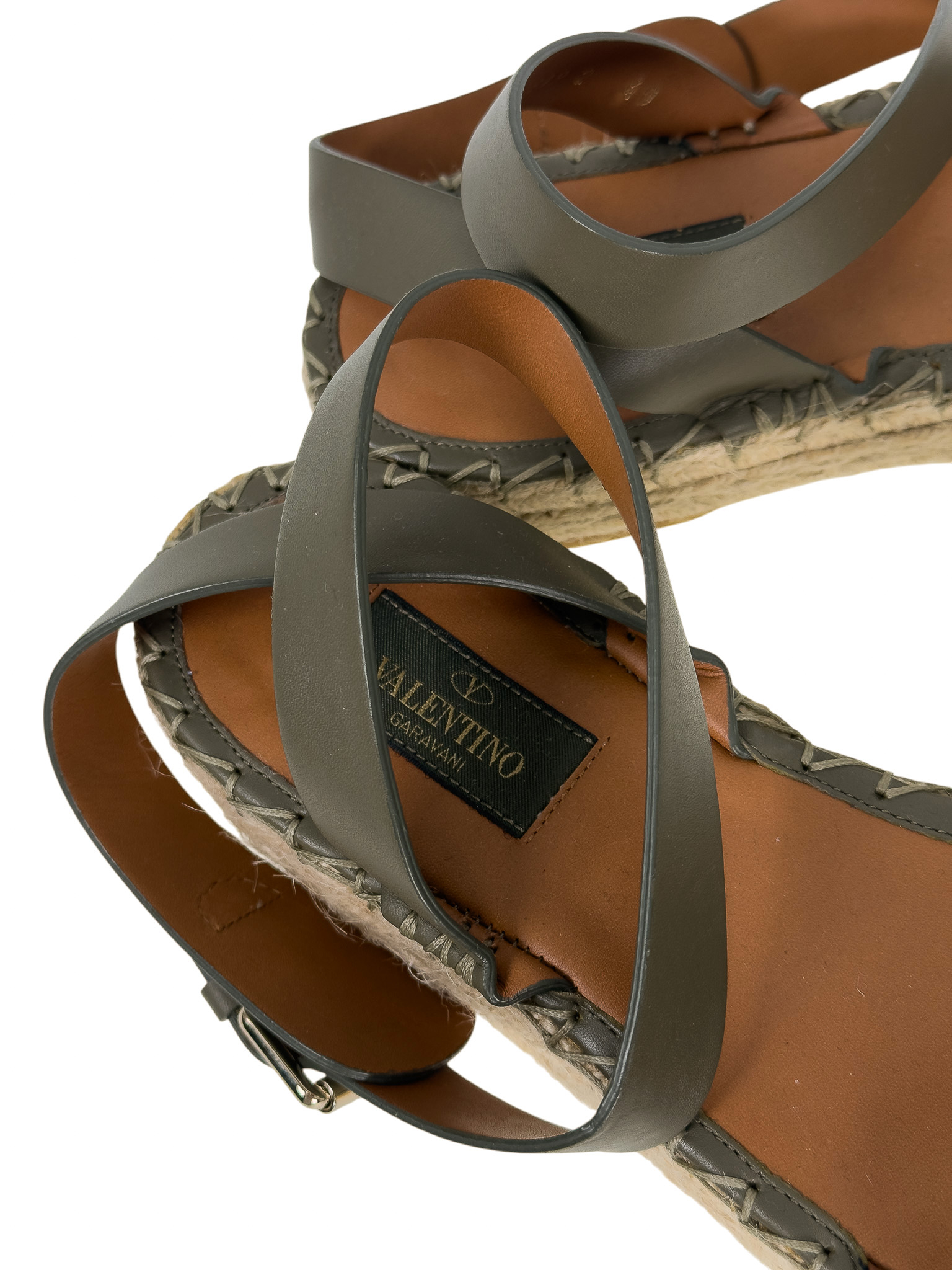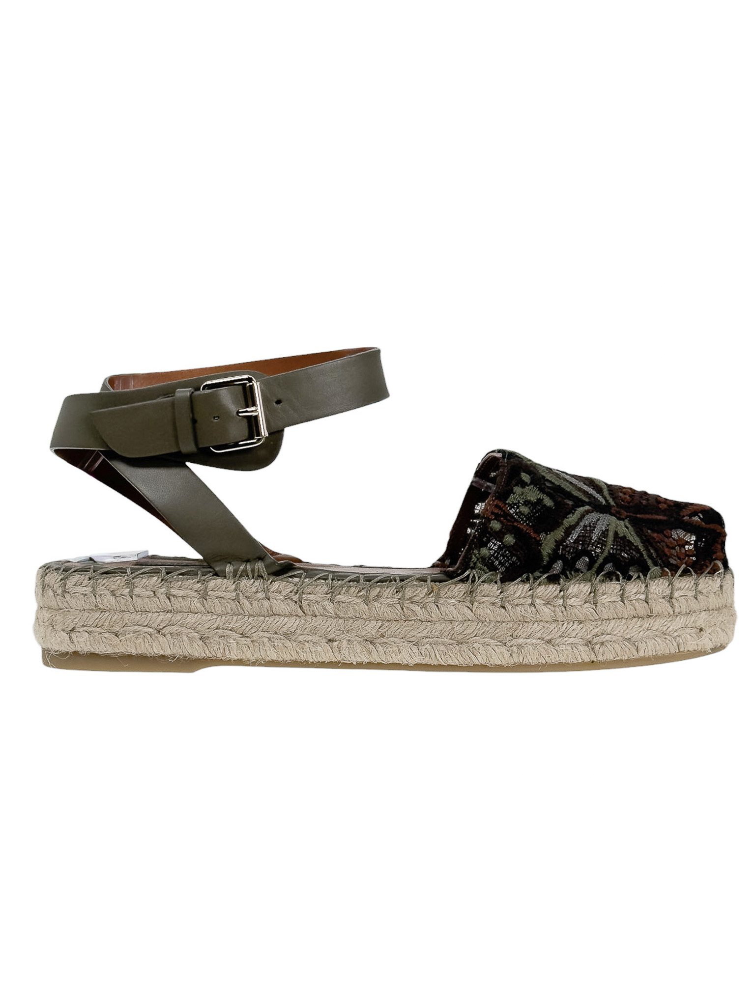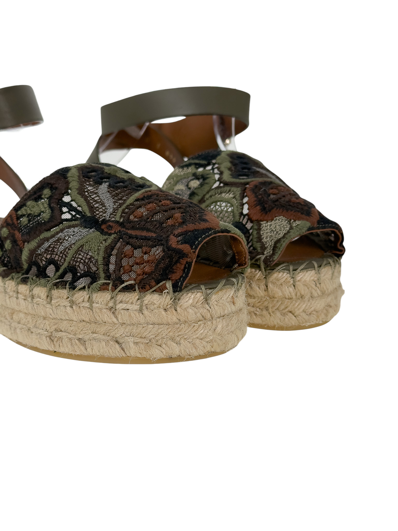 "Sandały w odcieniach khaki oraz brązu, na słomkowej platformie, brązowo-czarno-zielona wyszywana, miejscami transparentna grafika motyla w przedniej części, skórzany pasek zapinany wokół kostki, wykończony złotą sprzączką, migdałowe noski, wycięcie na palce przodzie, skórzana brązowa wkładka. Stan nowe. Rozmiar 40."