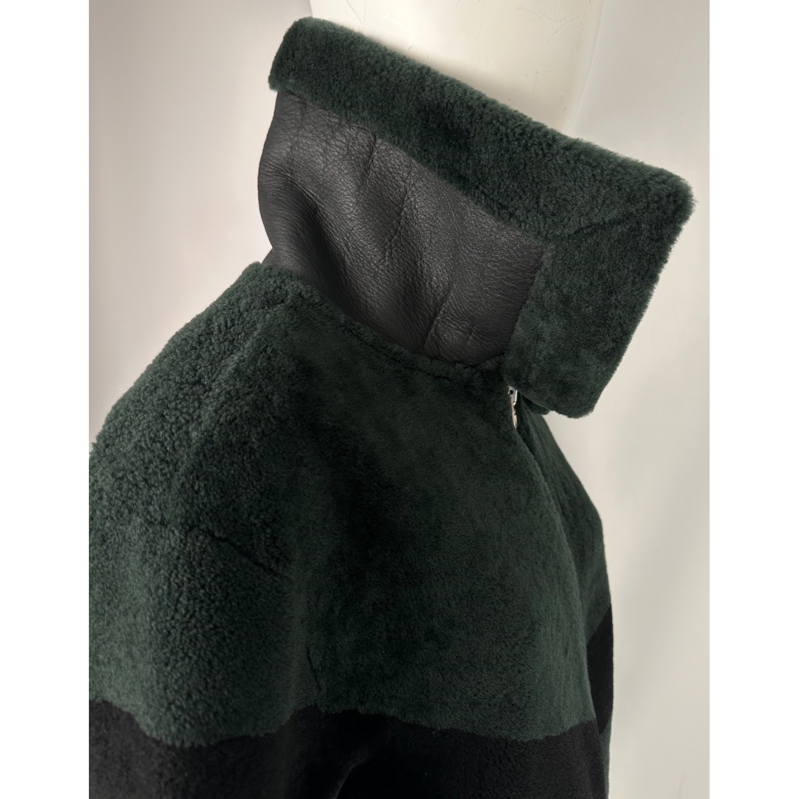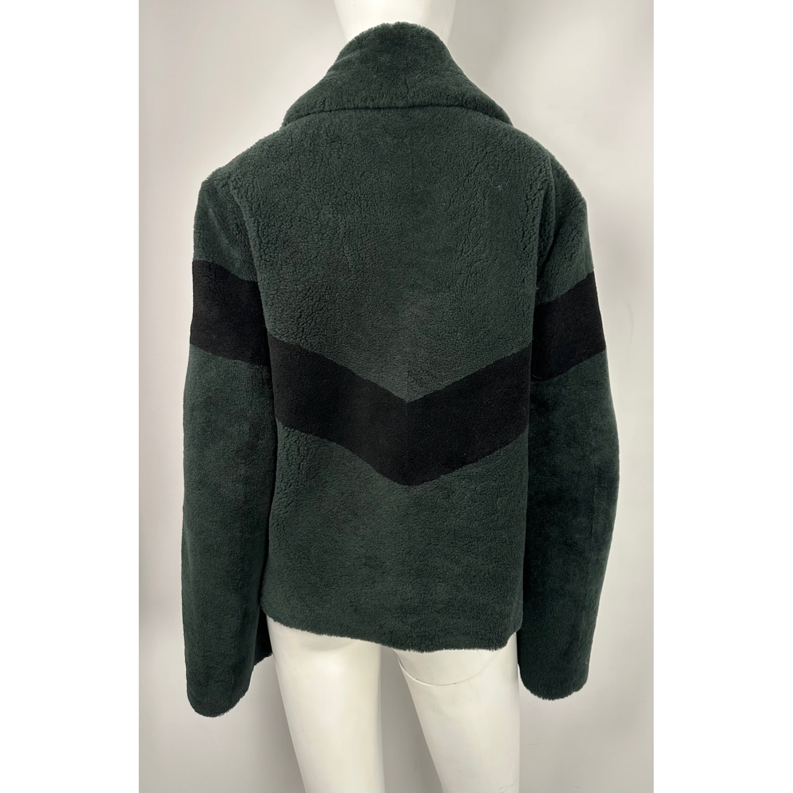 "ciemnozielony, krótszy kożuch z kołnierzykiem, zapinany na srebrny zamek, dwie kieszenie boczne. Rozmiar z metki 3. Skład: skóra owcza. Wymiary : długość całkowita 57 cm, długość rękawa od ramienia, szerokość pod pachami 56 cm."